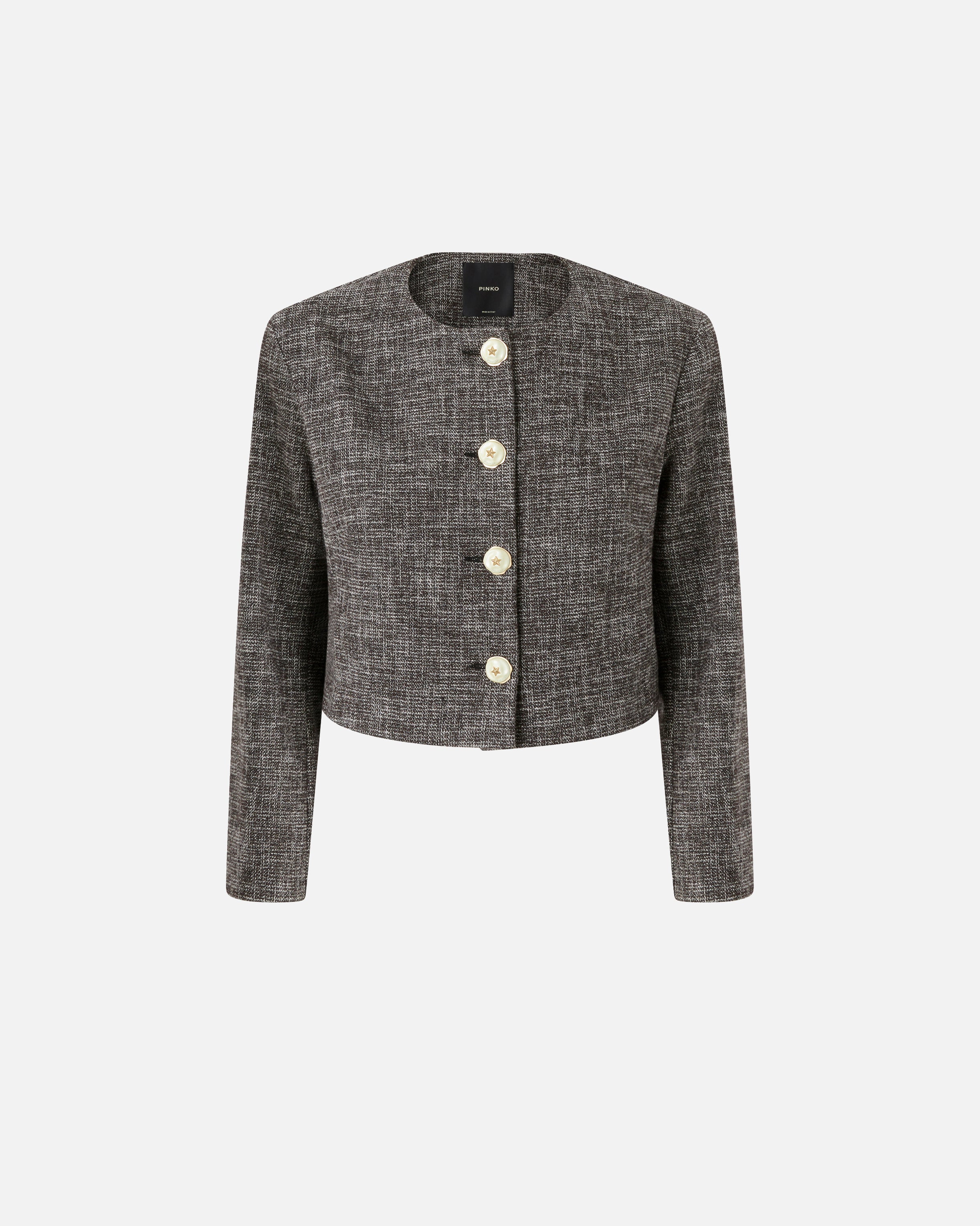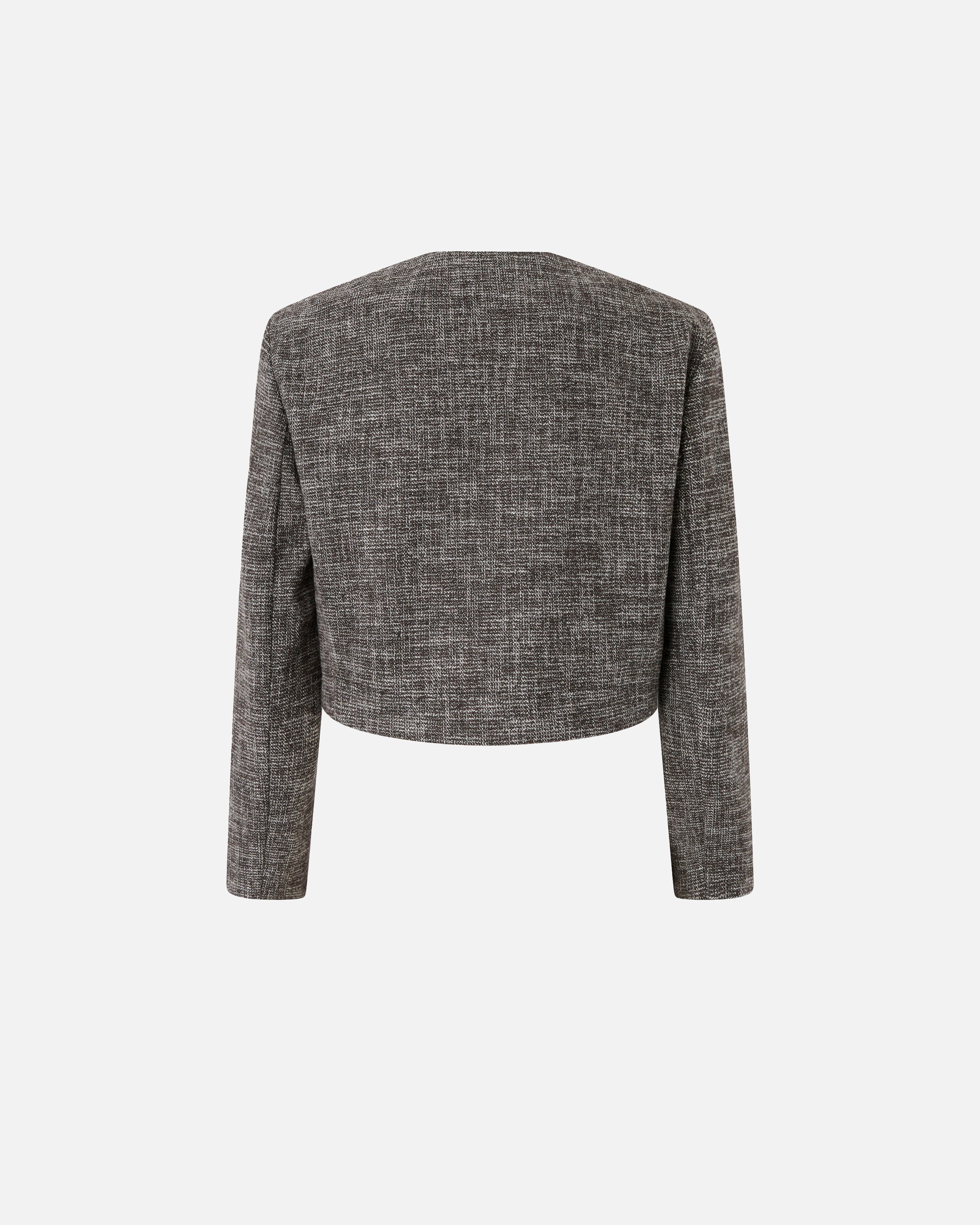 Jacke mit Rundhalsausschnitt in Cropped-Passform mit Verschluss vorne mit Knöpfen samt Stern. Das Kleidungsstück besteht aus Flanell mit einer angenehmen und warmen Haptik, die sich durch ein maskulin inspiriertes Tweed-Design auszeichnet und mit einer Innenseite aus Jersey kombiniert wird, um zusätzlichen Komfort zu gewährleisten. Perfekt in Kombination mit dem passenden Rock für einen femininen Look.
