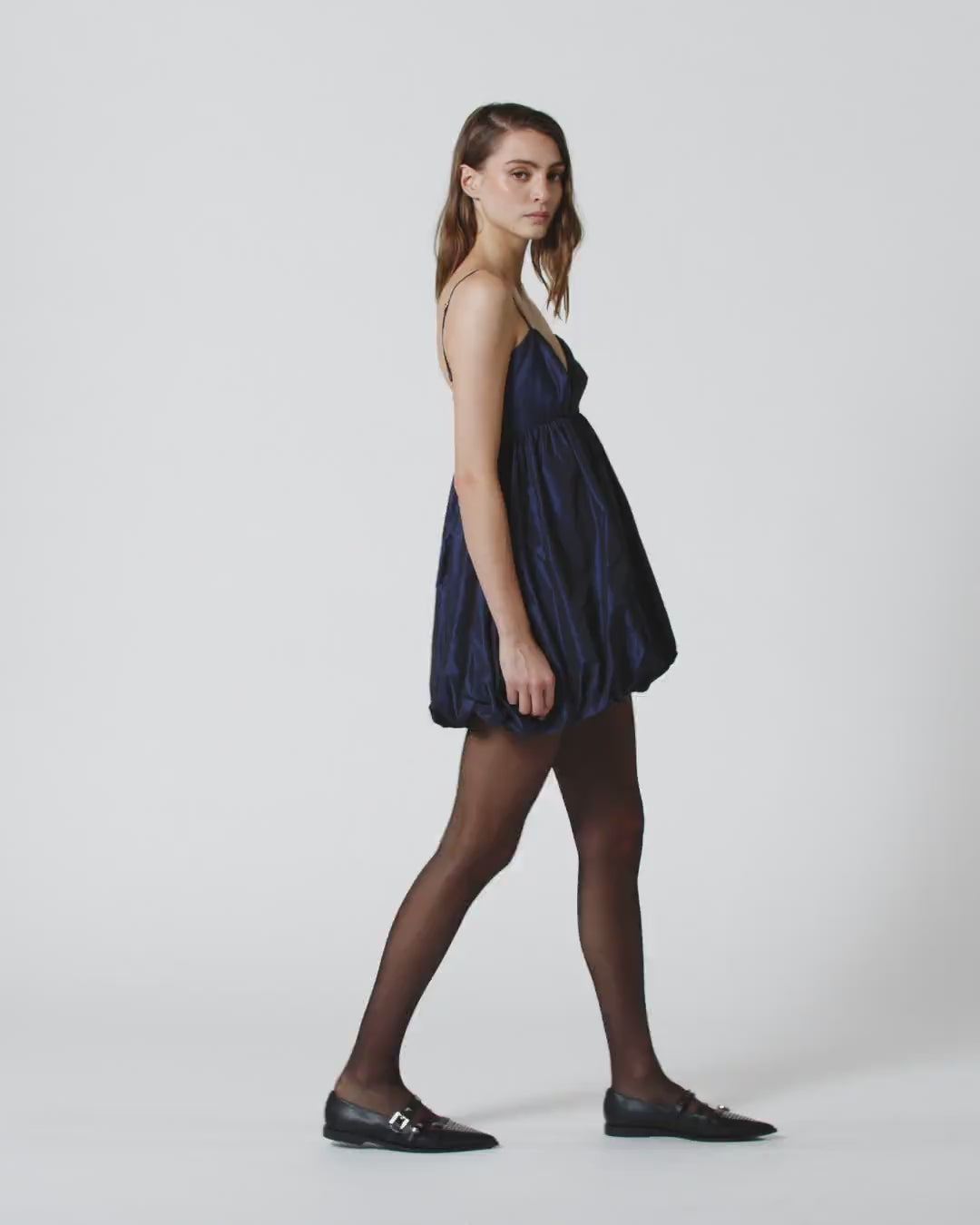 Sehr kurzes Kleid mit geformtem Ausschnitt vorne und verstellbaren Trägern, eng anliegendem Oberteil und weitem Rock aus Taft. Der leichte und glänzende Stoff erzeugt schillernde Reflexe und passt perfekt zum weichen und dynamischen Volumen, das das Kleidungsstück kennzeichnet. Die durchdachten Einnäher und die Linien des modernen Designs werden durch markante Details wie den Ballonrock und das Obermaterial im Korsett-Stil abgerundet.