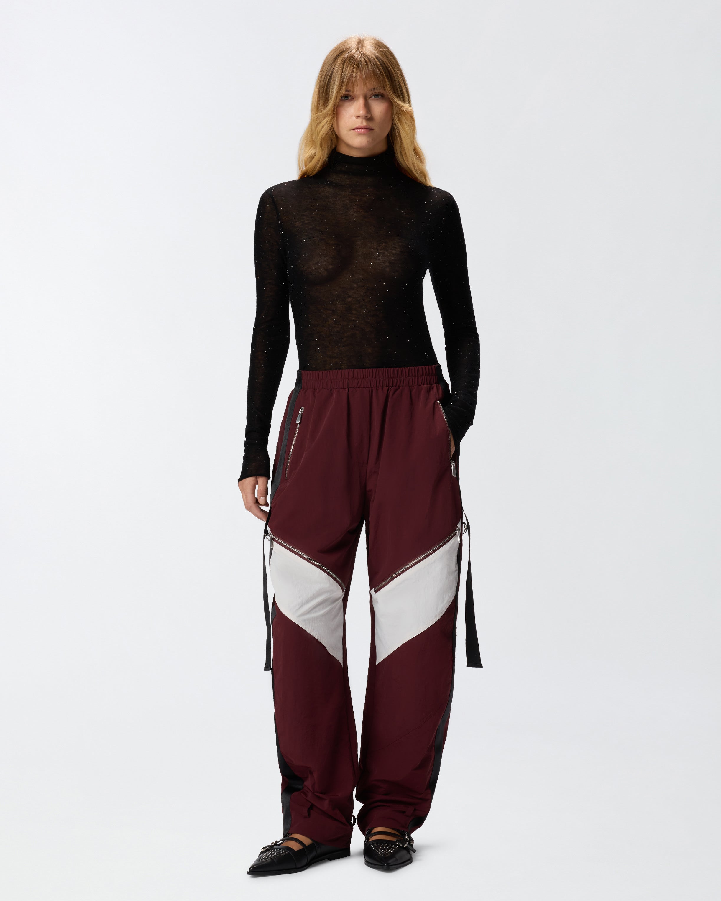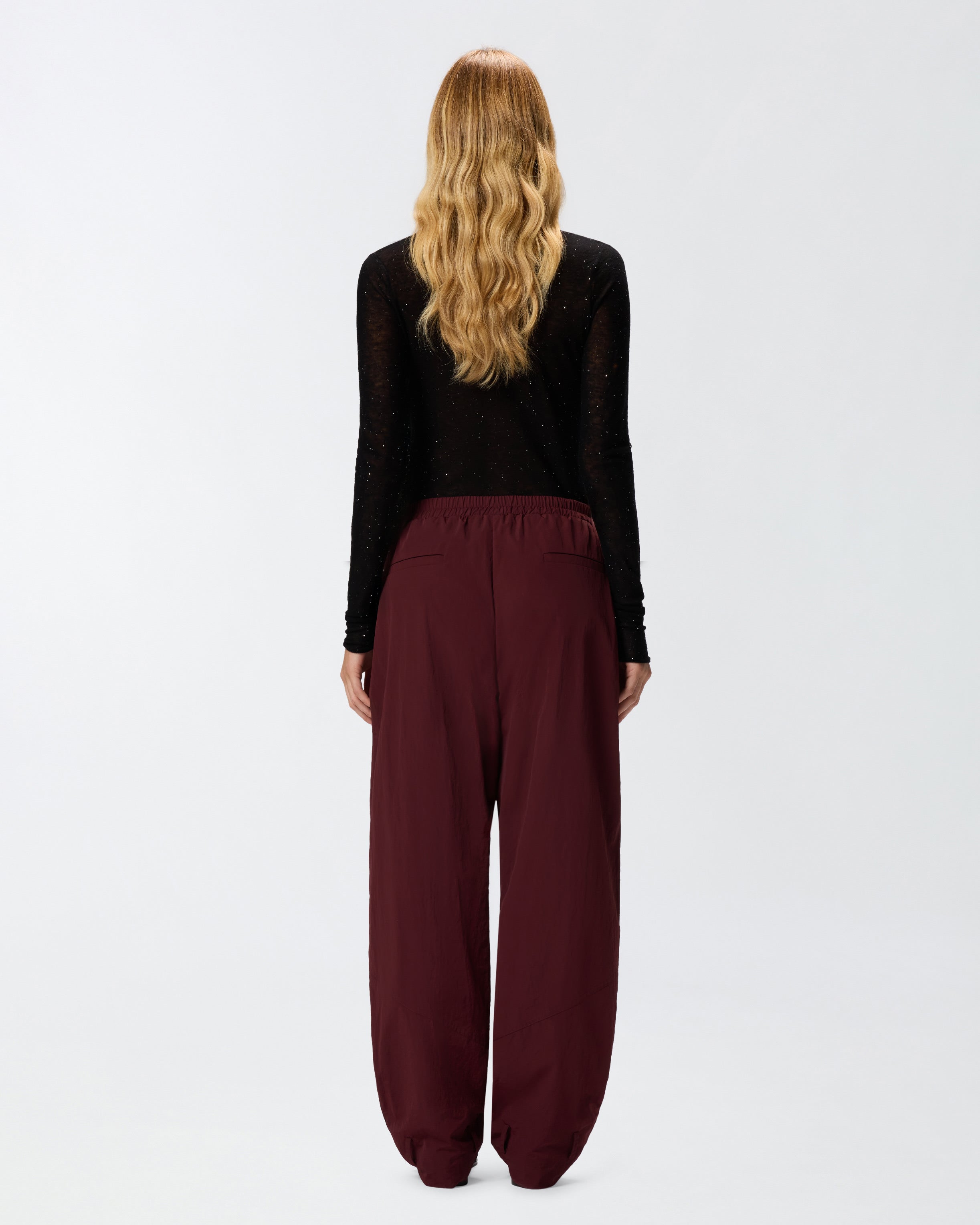 Hose aus gewaschenem, technischem Canvas, das dem Stoff den für Sportbekleidung typischen welligen und materiellen Effekt verleiht und sich durch ein Oversize-Bein mit Ballonlinie auszeichnet, das leicht ballonförmig geschnitten ist. Das mit Baumwolle gefütterte Modell verfügt über einen elastischen Bund, Riemchen im Utility-Stil an der Außenseite der Beine und am Saum, Seitentaschen mit Reißverschluss, Leistentaschen auf der Rückseite und schräge Reißverschlüsse auf der Vorderseite, die die Silhouette kennzeichnen. Kleiden Sie sich sportlich mit diesem praktischen und vielseitigen Modell, das Sie in der Freizeit oder bei weniger formellen Gelegenheiten tragen können.