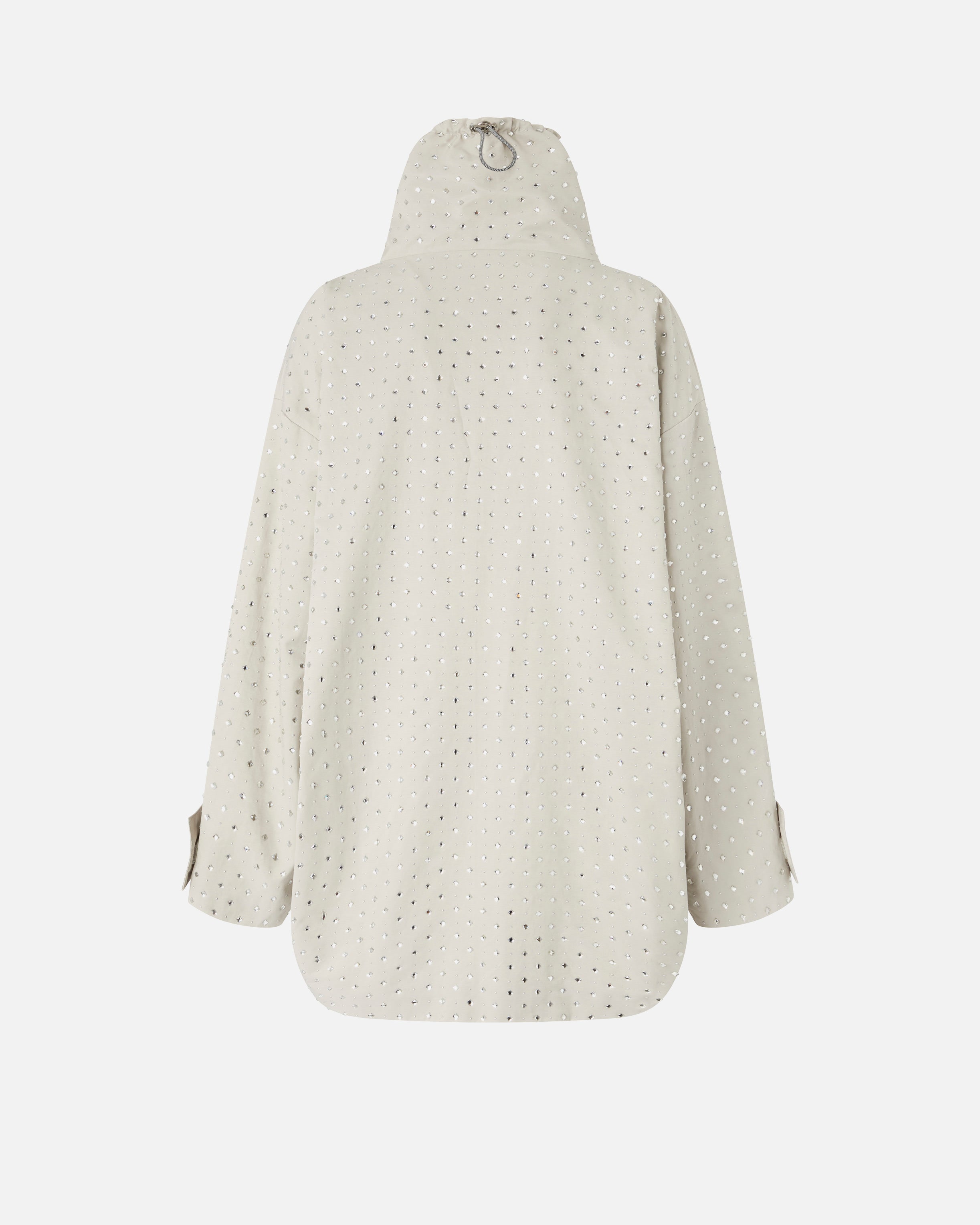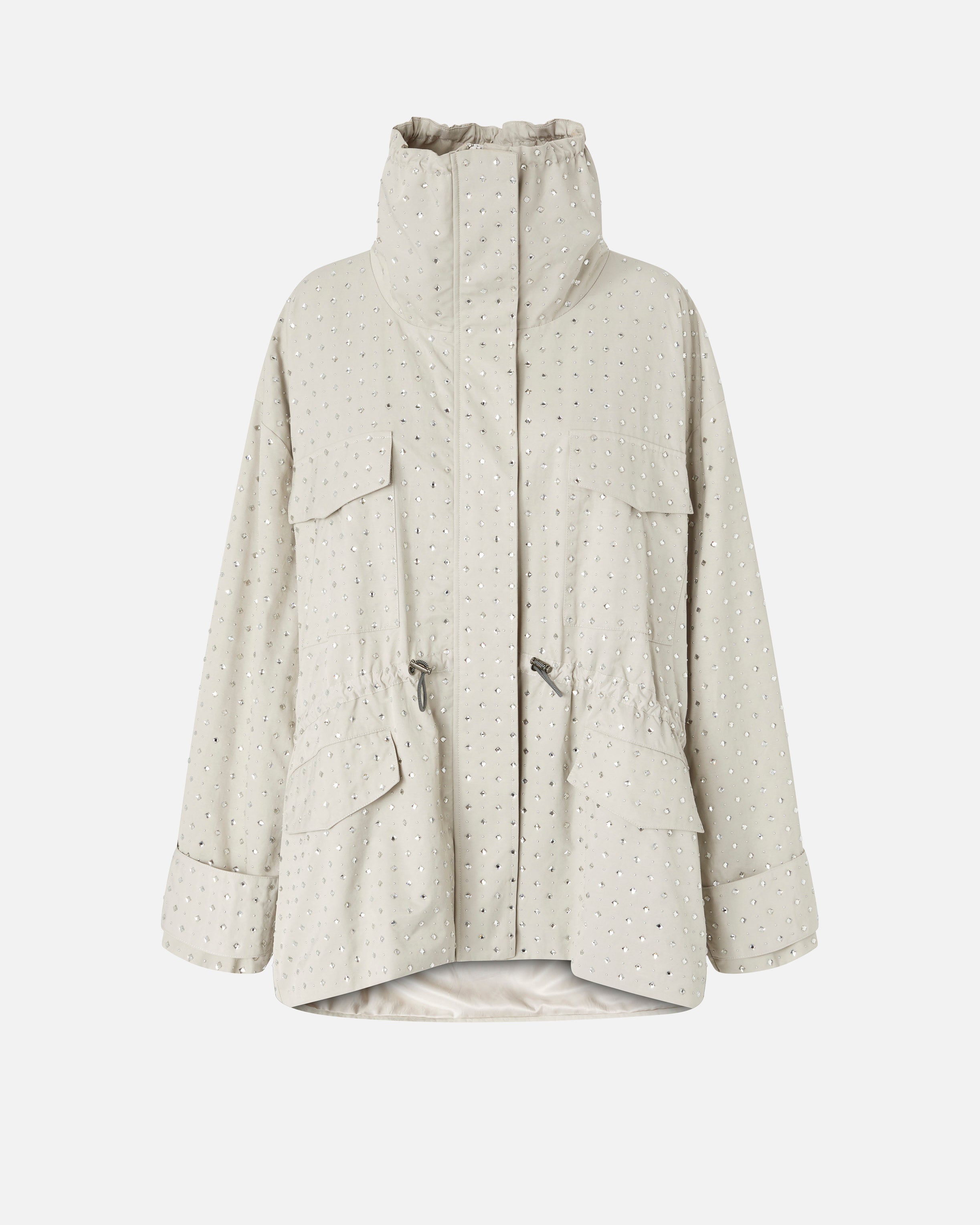 Parka mit längerem Rücken und extrem funktionellem Design. Das Kleidungsstück besteht aus diagonalem Stoff und ist mit einem hohen Kragen, mehreren Taschen und einem von Trekking inspirierten Tunnelzug am Kragen und an der Taille ausgestattet, um die Passform je nach Bedarf anzupassen. Der praktische Charakter des Kleidungsstücks wird durch die Dekoration perfekt ausgeglichen: ein kostbares All-Over-Motiv mit thermoadhäsiven, rautenförmigen Strasssteinen und Mikro-Metallnieten, die Ihre Outfits im reinen Stil von PINKO aufwerten.