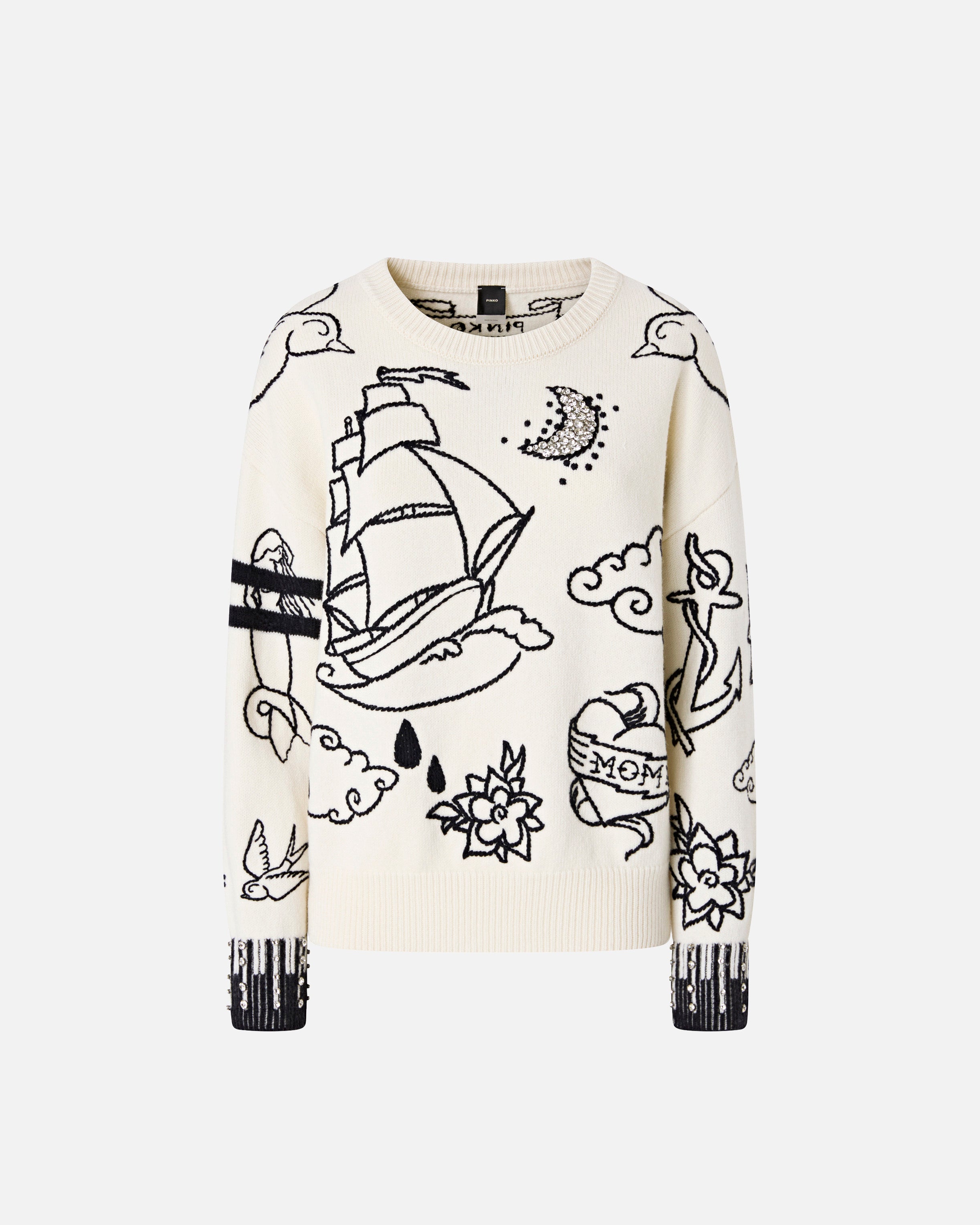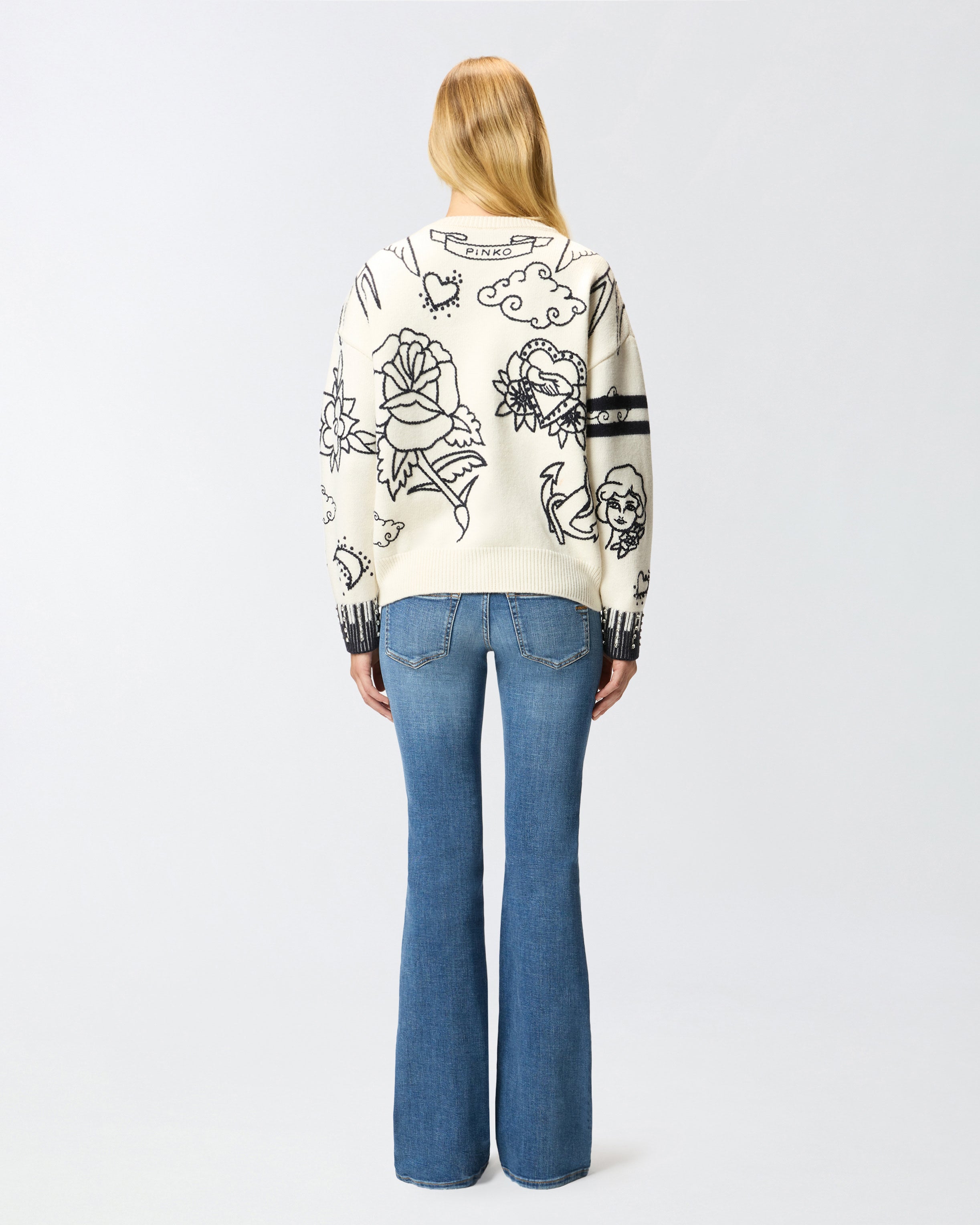 Langärmeliger Pullover mit Rundhalsausschnitt aus Merinowolle: ein flauschiges und leichtes Garn für eine originelle Garderobe. Mit diesem Design, das mit aufgestickten Mustern und Details aus Strasssteinen an den Manschetten aufwartet, tragen Sie einen vollkommen neuartigen Look. Der Rundhalsausschnitt, der Saum und die Ärmelbündchen sind gerippt, während das PINKO-Logo als Lettering auf der Rückseite des Modells alles abrundet. Das Kleidungsstück wurde Veredelungsprüfungen unterzogen, um die mögliche Bildung von Pilling zu minimieren und ein weicheres und haltbareres Gewebe zu gewährleisten.