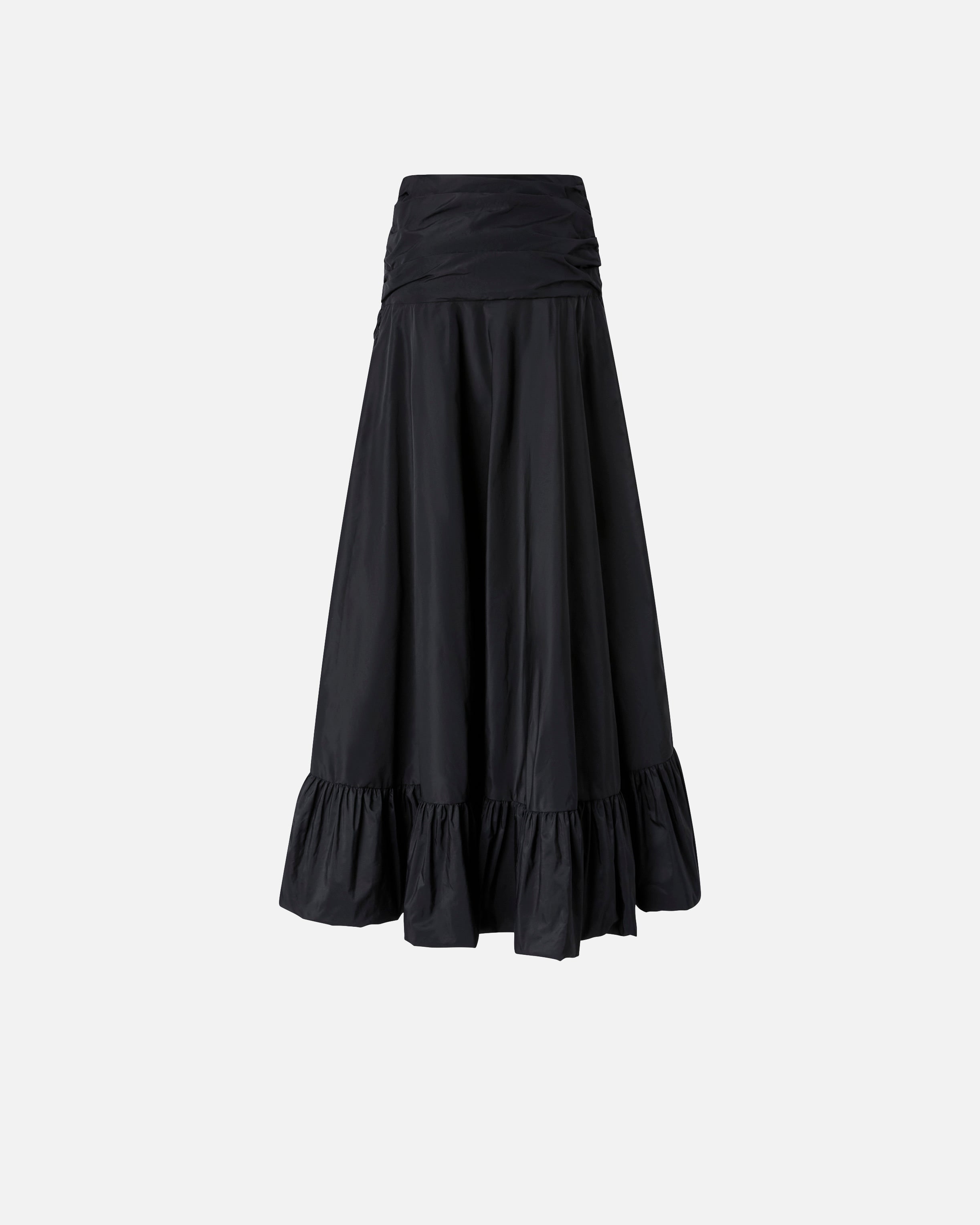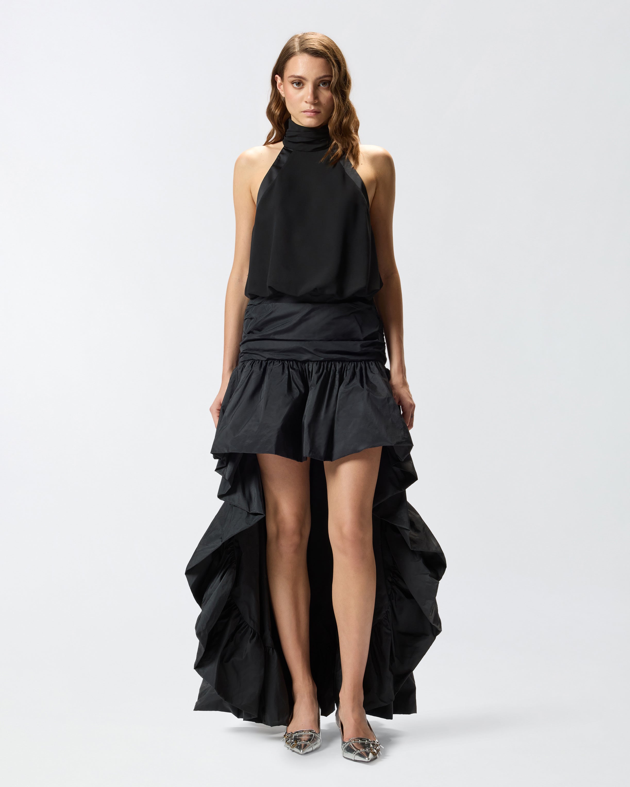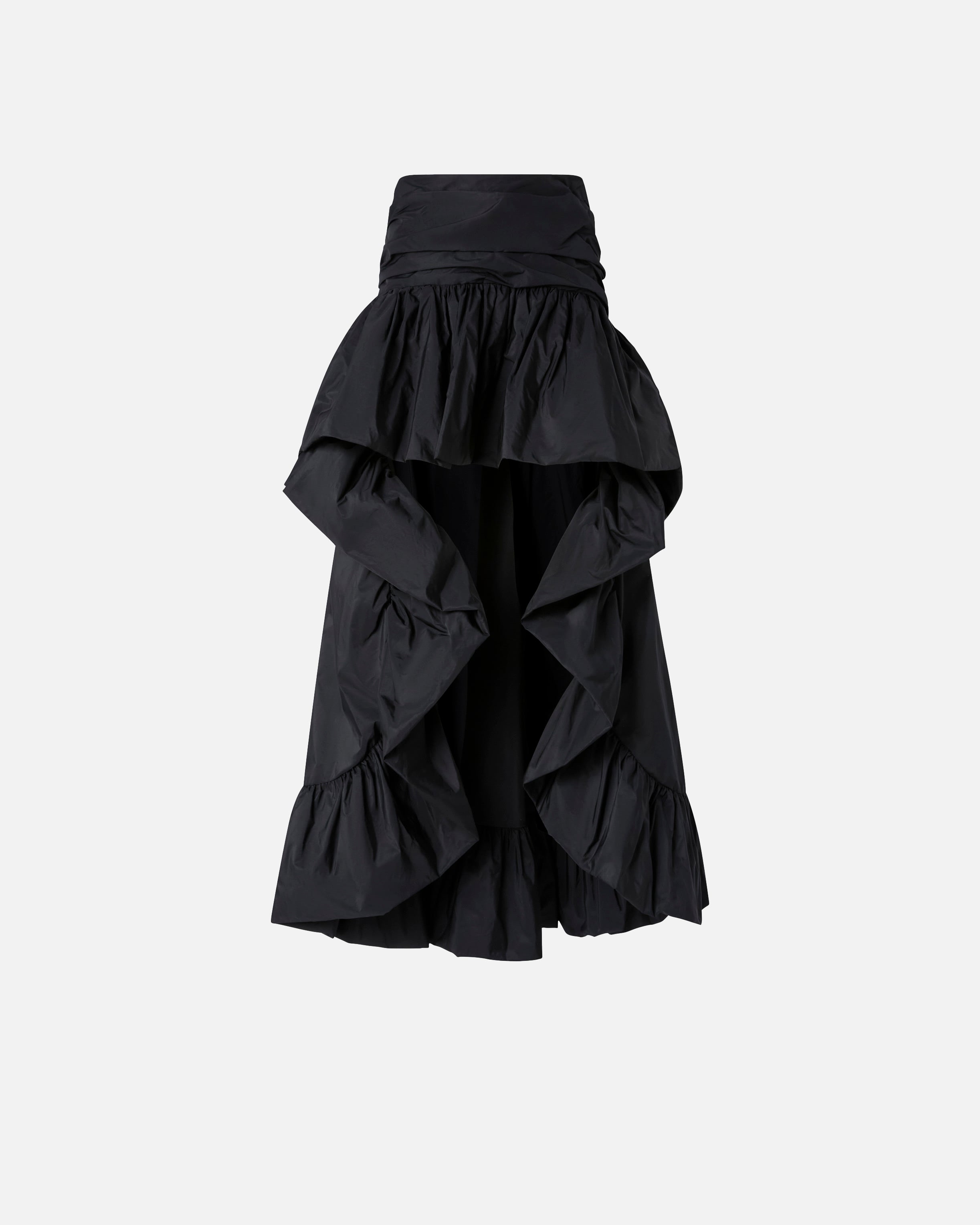 Skirt made of taffeta, short on the front and longer on the back. The asymmetrical cut and trimmed by the ruffles creates a dramatic effect, accentuated even by the slightly ruched fabric. The material is light and shiny and goes perfectly with the dynamic volume that distinguishes the garment. This elegant skirt will accompany you with a bold and feminine touch on your special occasions, in an outfit that cannot go unnoticed.