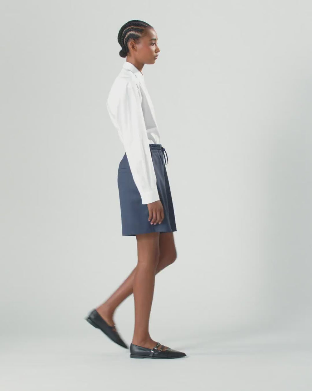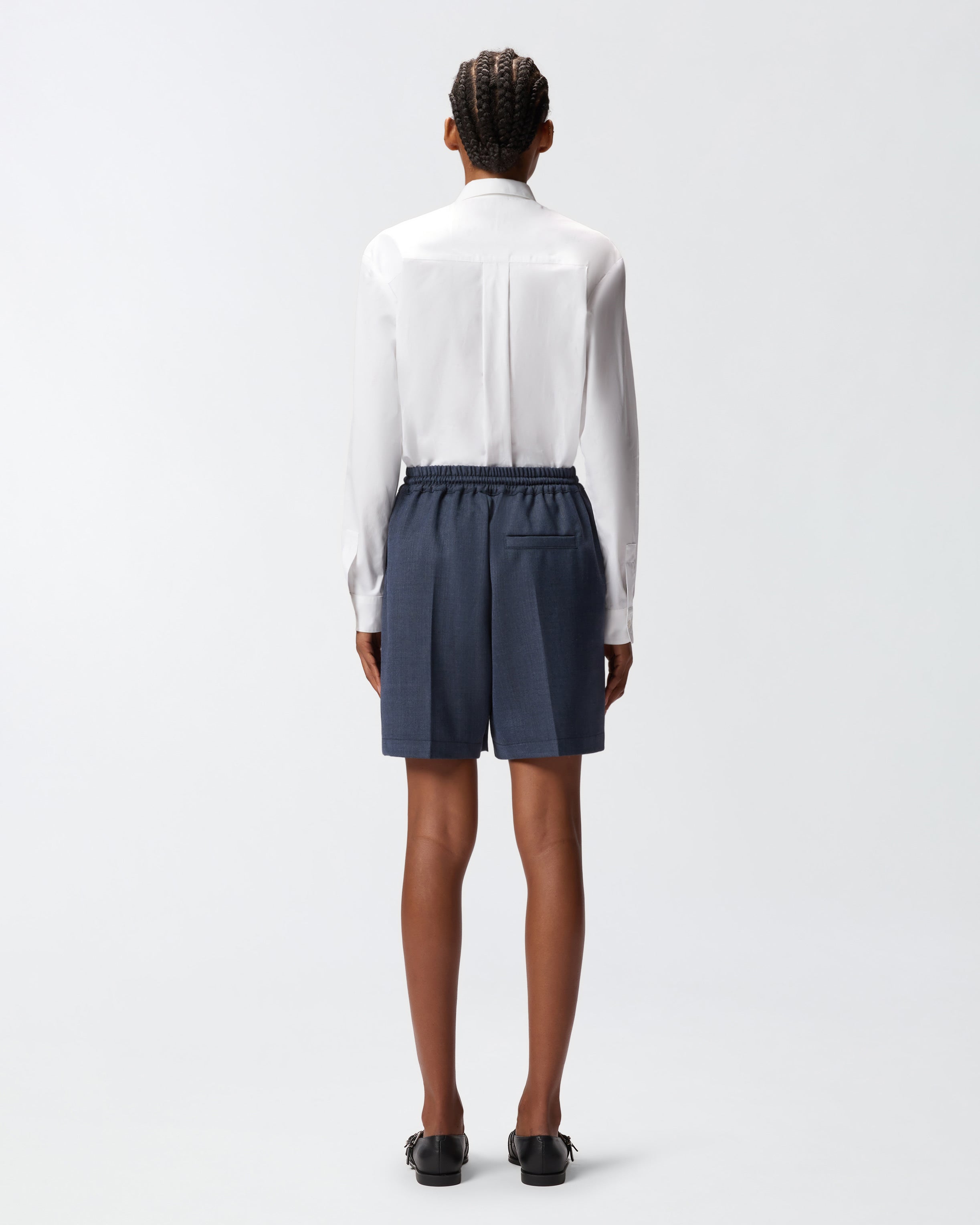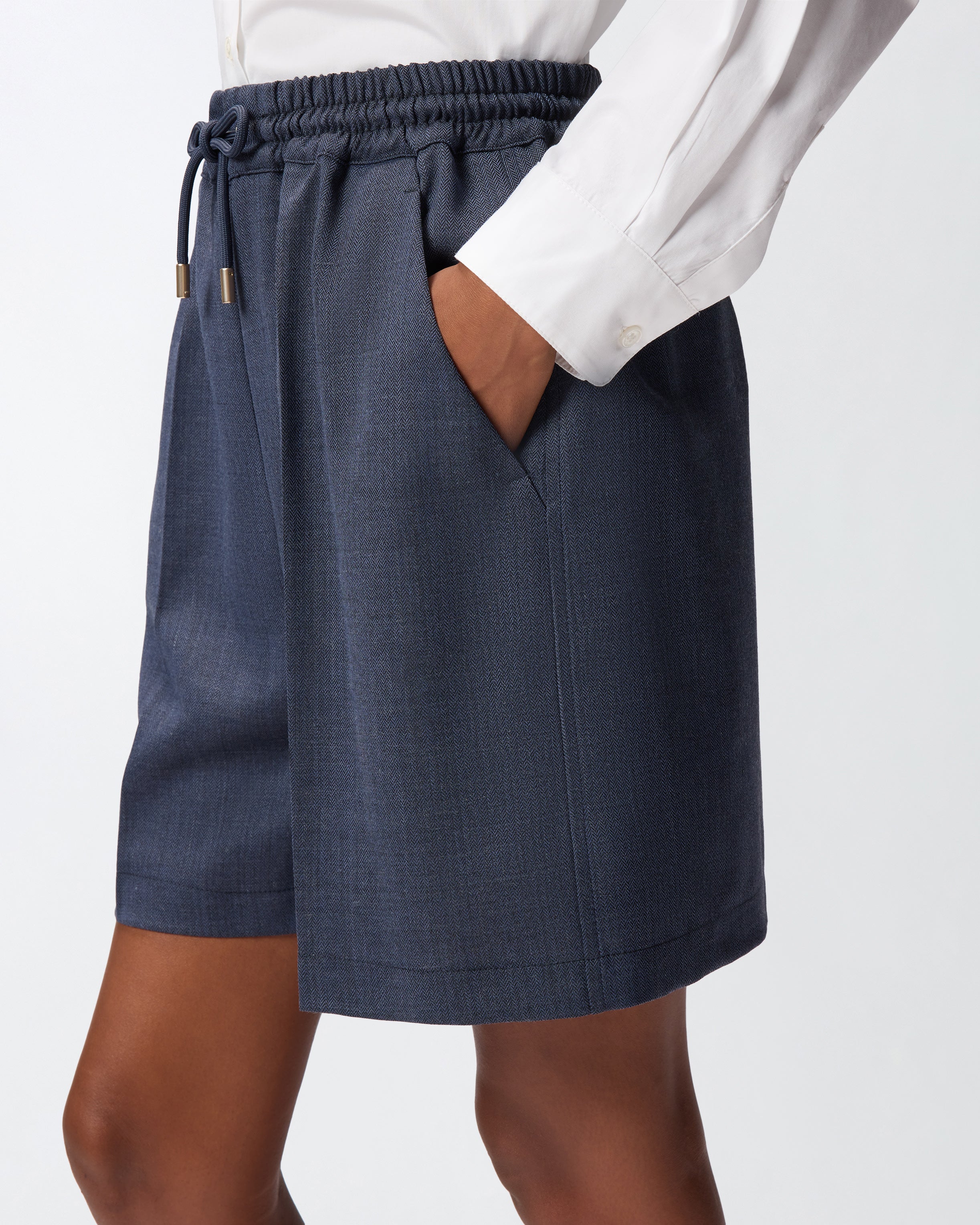 Tailored shorts with hip pockets, welt pocket on the back and elasticated waistband adjustable with drawstring. The garment is made of textured wool, particularly structured and resistant even for the cold season. Pair the shorts with the oversized blazer jacket in the same color to create an elegant ensemble with a contemporary cut.