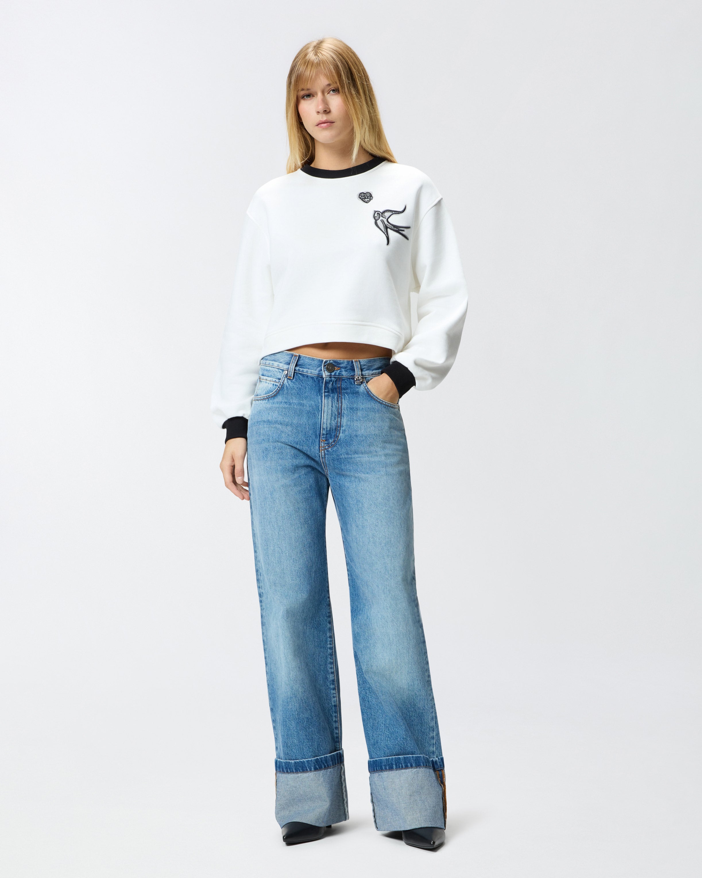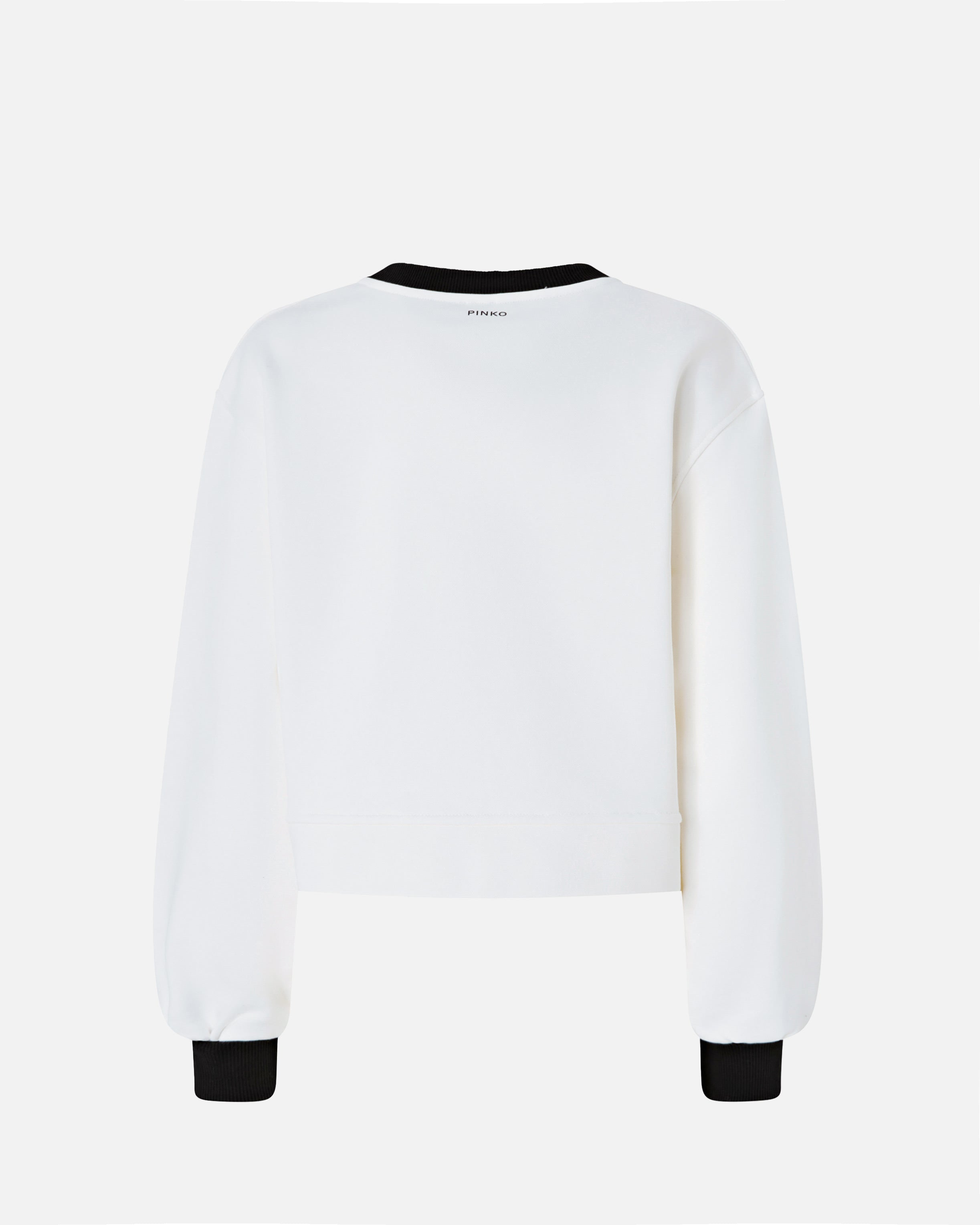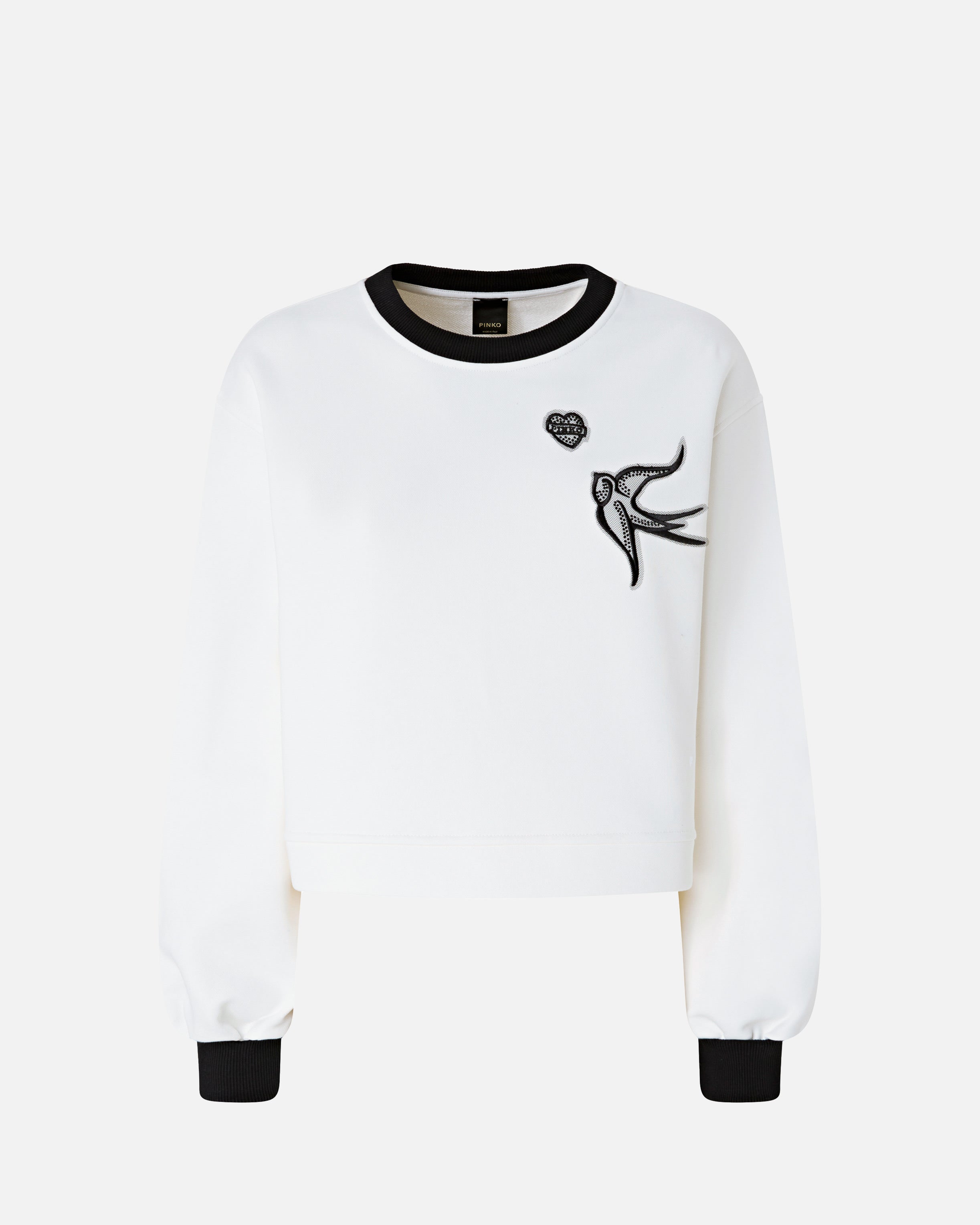 Sweatshirt aus Baumwolle mit langen Ärmeln samt überschnittenen Schultern, ergänzt durch einen Rundhalsausschnitt und Ärmelbündchen in kontrastierendem Rippstrick. Die Vorderseite zeichnet sich durch eine Stickerei mit einer Applikation in Mikro-Mesh aus, die ein kleines Herz mit PINKO-Logo und einen kleinen Vogel darstellt. Das Sweatshirt ist ideal für legere Tage zu Beginn der Saison, kann den ganzen Tag über getragen werden und garantiert einen originellen Stil.