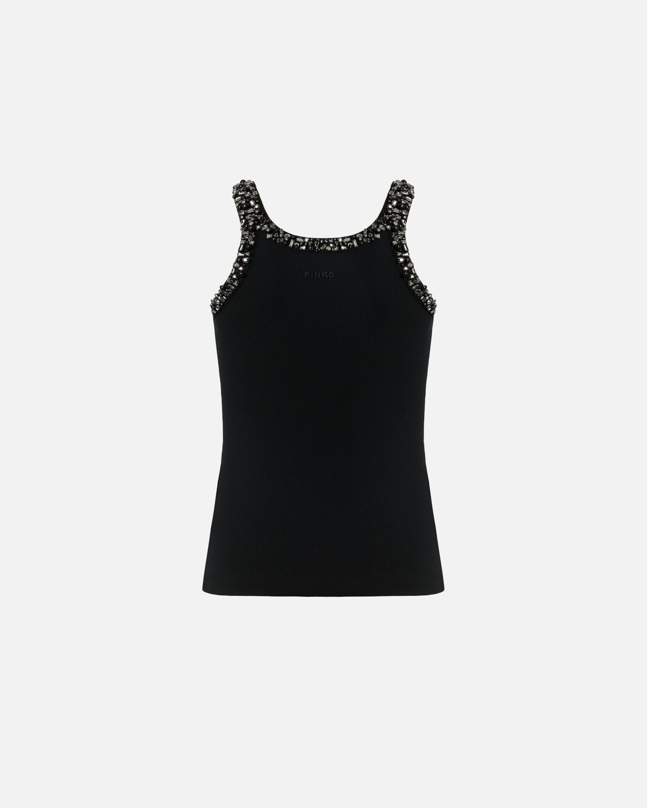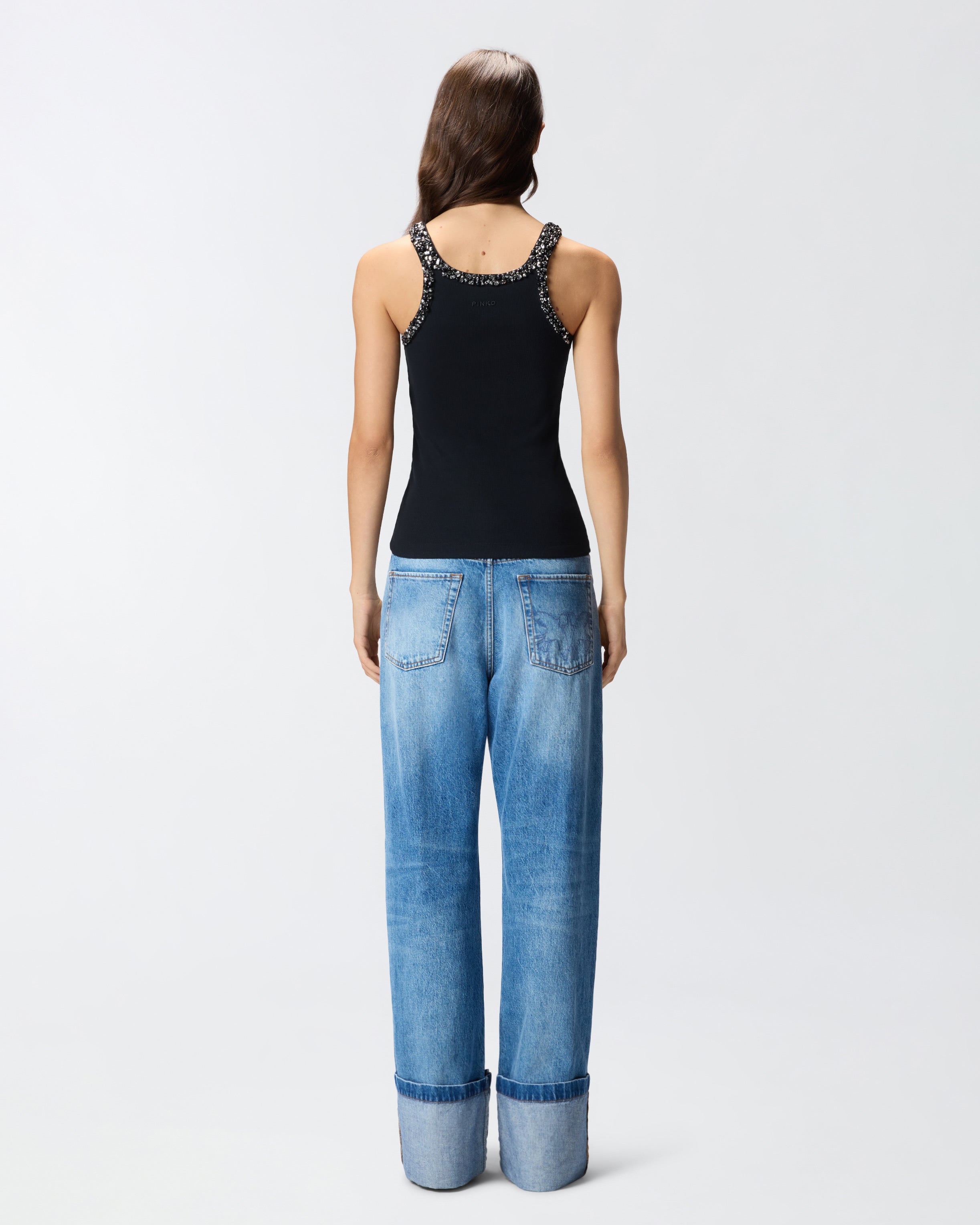 Top aus Baumwolljersey in Rippstrick. Die Träger und Ausschnitte vorne und hinten sind mit händisch aufgestickten Kristallen, Strasssteinen und Glasdetails bedeckt, die dem Kleidungsstück Licht und Kostbarkeit verleihen. Betonten Sie die Eleganz und Weiblichkeit jedes Outfits mit diesem Top, das die perfekte Unterbekleidung in Kombination mit geschneiderter Hose, aber auch mit einer besonderen Jeans ist.