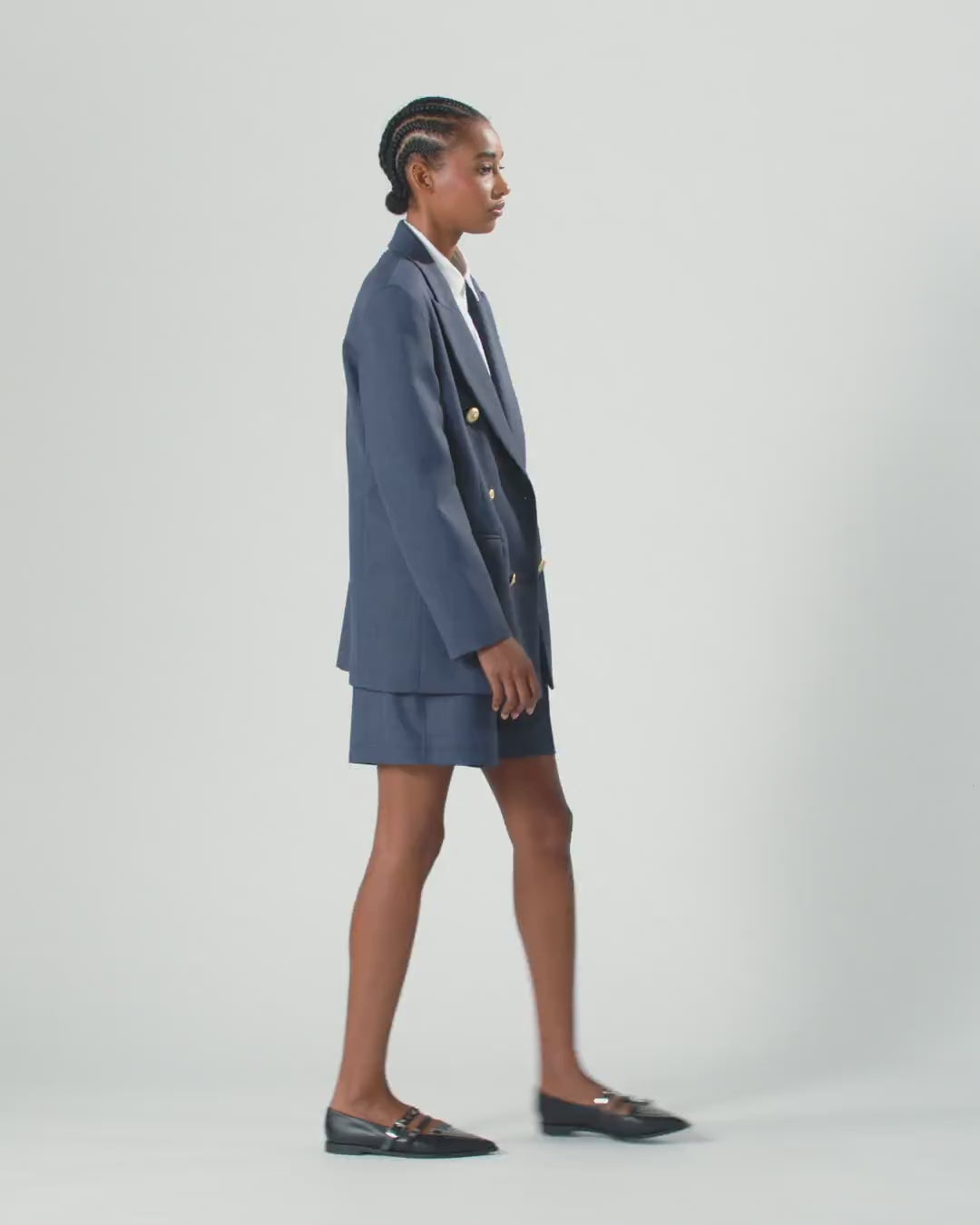 Gerade geschnittener, zweireihiger Blazer mit Reverskragen, Pattentaschen vorne und Paspeltasche auf der Brust. Das Kleidungsstück besteht aus leinwandgebundener Wolle, die besonders strukturiert und auch in der kalten Jahreszeit widerstandsfähig ist. Das Innere der Jacke ist mit Stoff gefüttert, um eine perfekte Passform zu gewährleisten. Verschluss auf der Vorderseite mit Metallknöpfen, die mit einem Stern verziert sind. Kombinieren Sie den Blazer mit einer Hose aus demselben Stoff für einen Anzug-Effekt, oder tragen Sie eine Hemdbluse für einen formellen, aber nicht zu formellen Look.