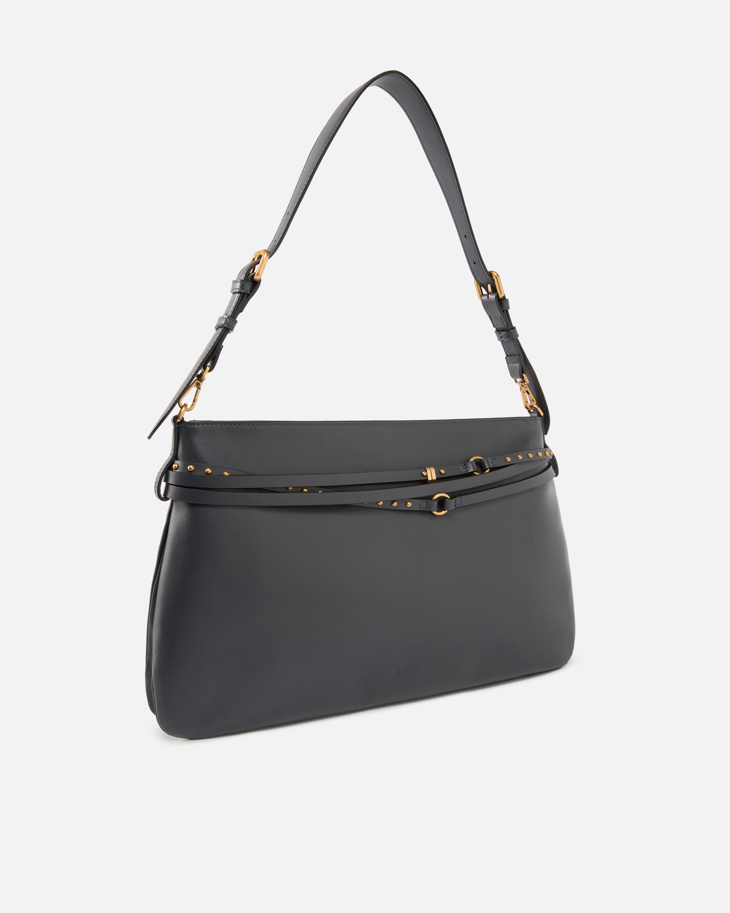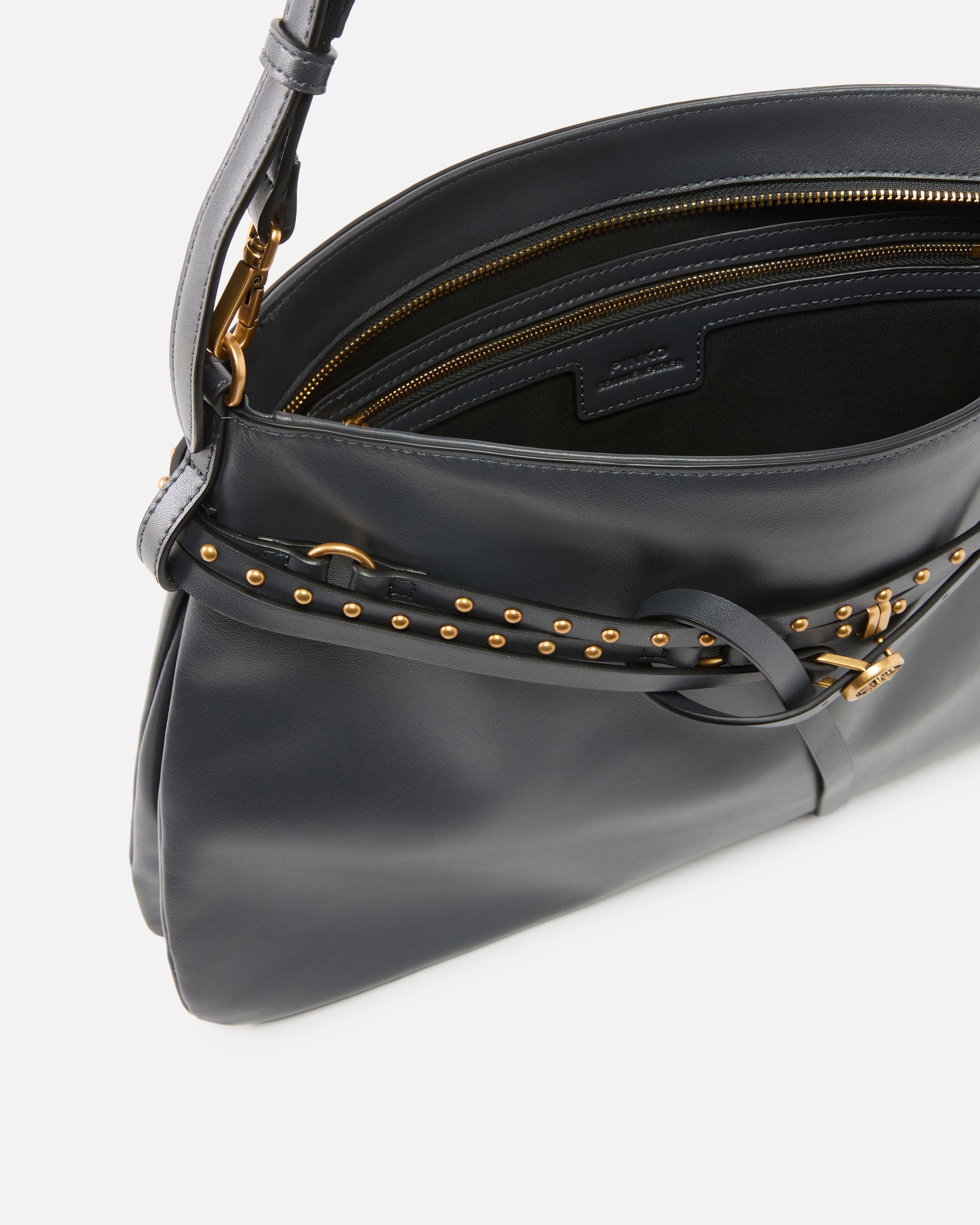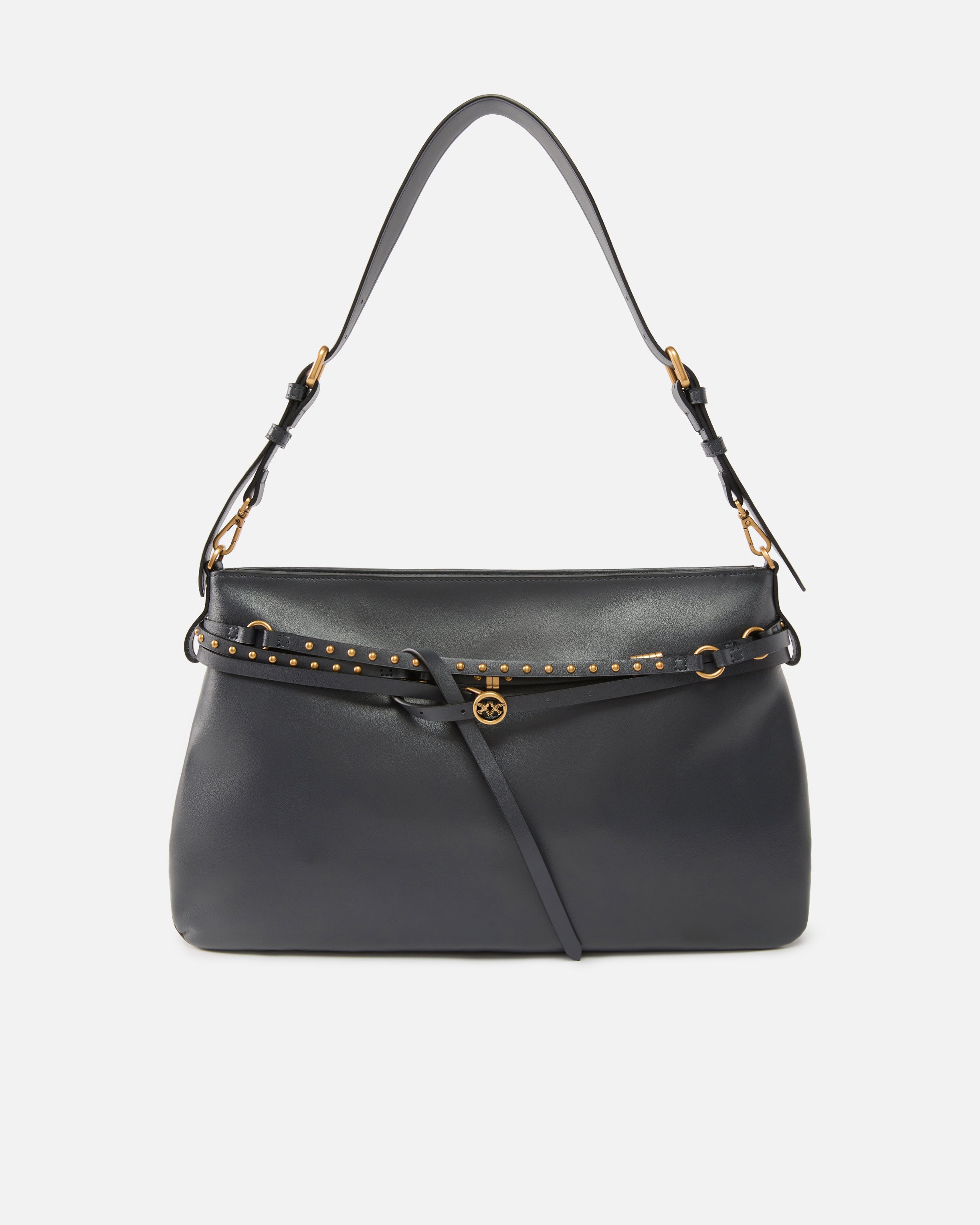 Belt Bag Big large flat bag with slightly A-line shape, made from soft, smooth leather. This model features a thin, adjustable matching belt that wraps multiple times around the top, enhanced by rounded studs, a small circular buckle with the iconic Love Birds and decorative metal rings that form the PINKO logo lettering. The adjustable, removable leather top handle allows for convenient shoulder or crossbody wear, while the zip fastening reveals a cotton drill-lined interior with a handy slip pocket sporting a logo-branded tag. Activate your PINKO bag: verify the authenticity of your product and access a personalised experience by scanning the Love Birds embroidery on the back of the bag with your smartphone!