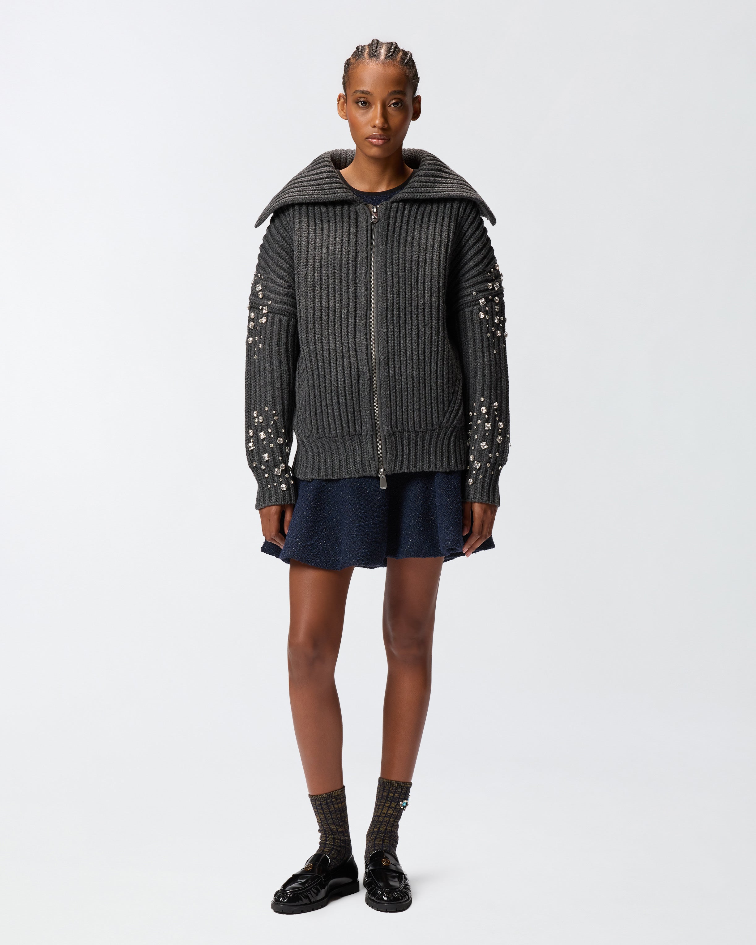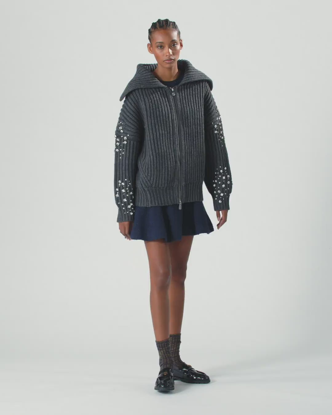Soft wool-blend cardicoat with a wide collar and full-length zip that is elevated by fine bejewelled embroidery on the long sleeves. You won’t be able to be without the comfort of this design, featuring all-over ribbing and a loose fit. The piece has undergone finishing tests to minimise the possible formation of pilling, ensuring greater fabric softness and durability.
