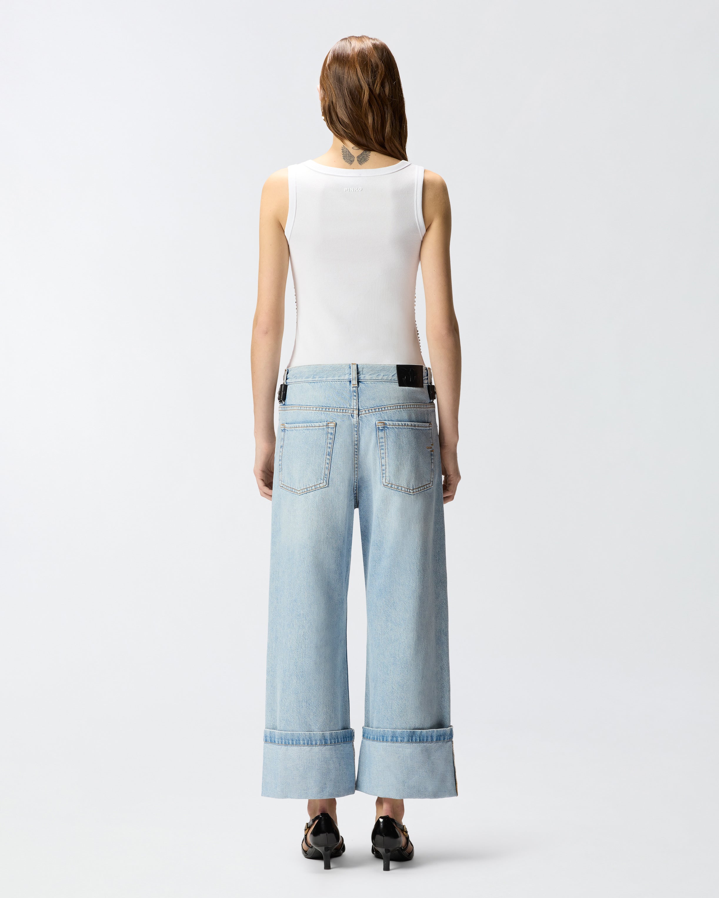 Five-pocket jeans in soft-feeling cotton and lyocell denim with light fading for a delicate worn effect. This model features cropped legs with a fixed cuff at the bottom and a removable, stud-embellished belt made from genuine leather. Thanks to their design with removable belt and two sets of belt loops at different heights, these jeans can be worn in three different ways: beltless for a cleaner and more relaxed look, high-waisted with the belt tightened for a paper-bag effect, or with the belt adjusted at the side for a loose, low-waisted fit. The amazing versatility of this garment makes it a winner for any woman's sunny-month wardrobe. - SIPARIO TROUSERS