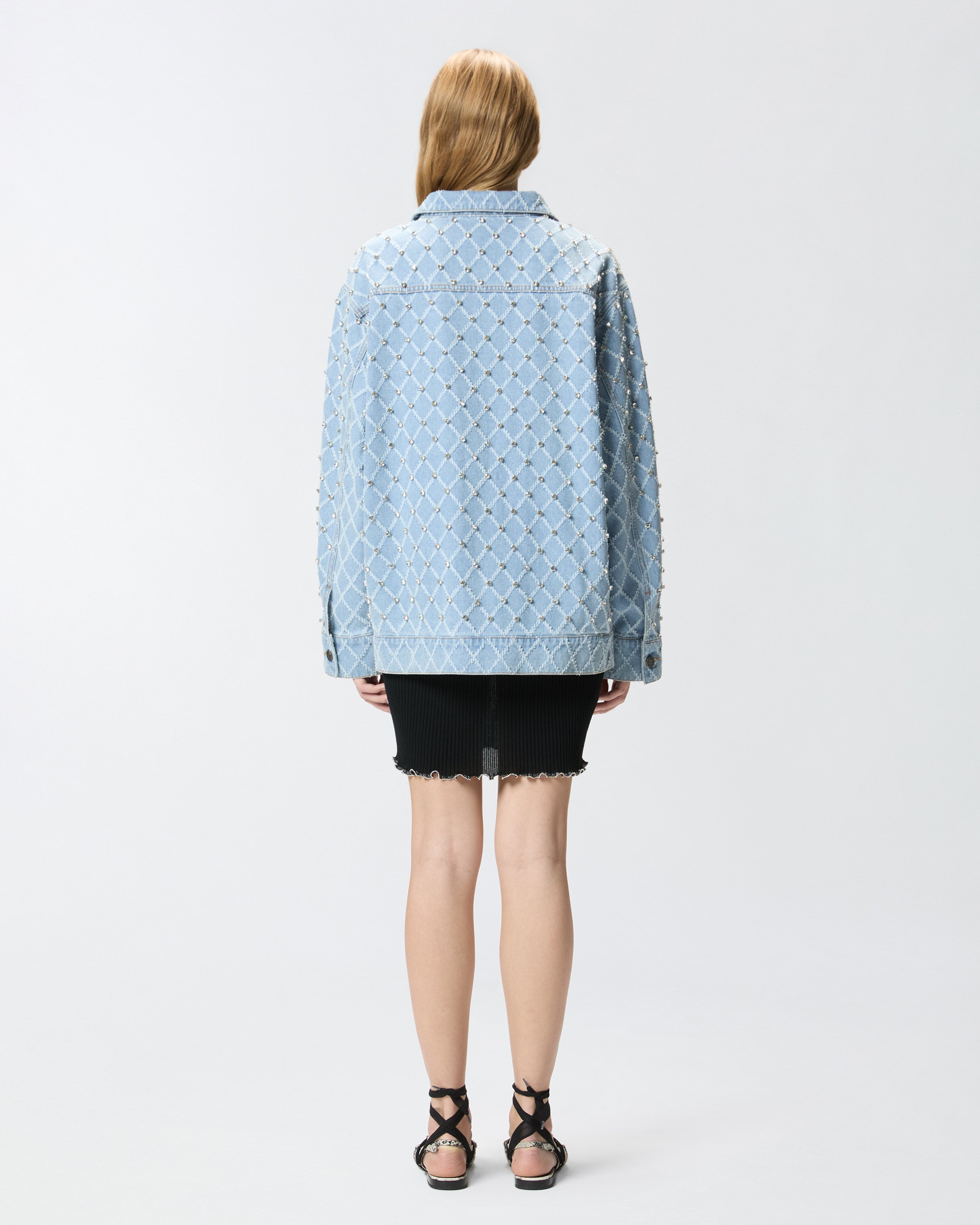 Pure cotton denim jacket with shirt collar, front patch pockets with buttoned flap and buttoned cuffs. This model showcases PINKO's unique flair for modern contrasting touches: the minimalist style of the design is accompanied by a slightly contrasting laser-cut diamond motif enhanced by sparkling hand-embroidered rhinestones. Wear this garment with its matching jeans and get ready to make your everyday looks shine! Model is 177cm tall and wears a size 40. - PIFFERAIO OVERSHIRT
