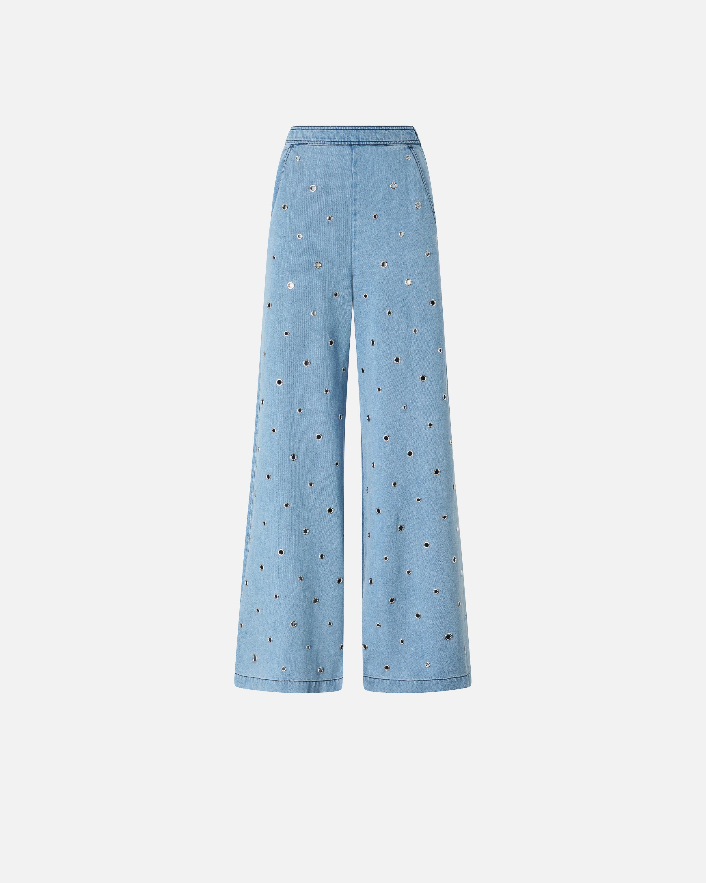 Flared trousers with slanted side pockets and side zip fastening. This piece stands out for its distinct workmanship: the lightweight, fluid pure lyocell denim features a skilfully faded finish and is doted all over with small metal eyelets for a subtle openwork effect. Transform your daytime look into an original fashion statement by pairing these jeans with the matching blouse. - STIRATRICI TROUSERS