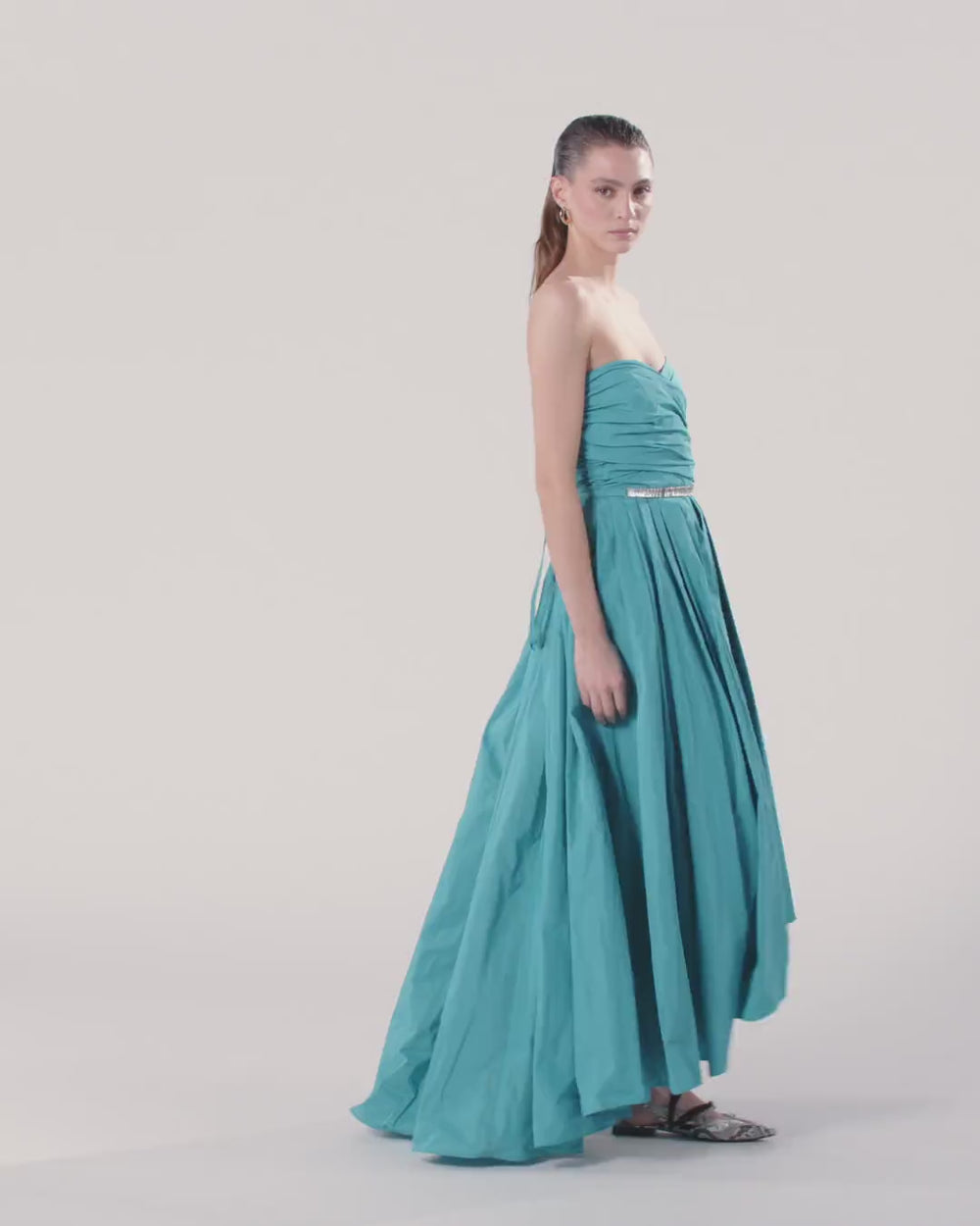 Long dress in light and shiny taffeta, featuring a fitted bodice and a voluminous and flared skirt with soft pleats and side slit. The feminine line of the strapless bodice is enhanced by the shaped neckline and the ruffled detailing, while the inside of the cups has tape to prevent the dress from slipping. The garment, complete with a convenient side zip fastening for easy wear, is further enhanced by a sparkling detail that perfectly reflects PINKO’s aesthetic: a removable waist belt, with one side in matching fabric and the other adorned with sparkling crystal jewels. This elegant dress is perfect for wearing on special occasions, whether as an evening outfit or as a ceremony look.