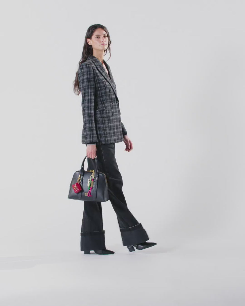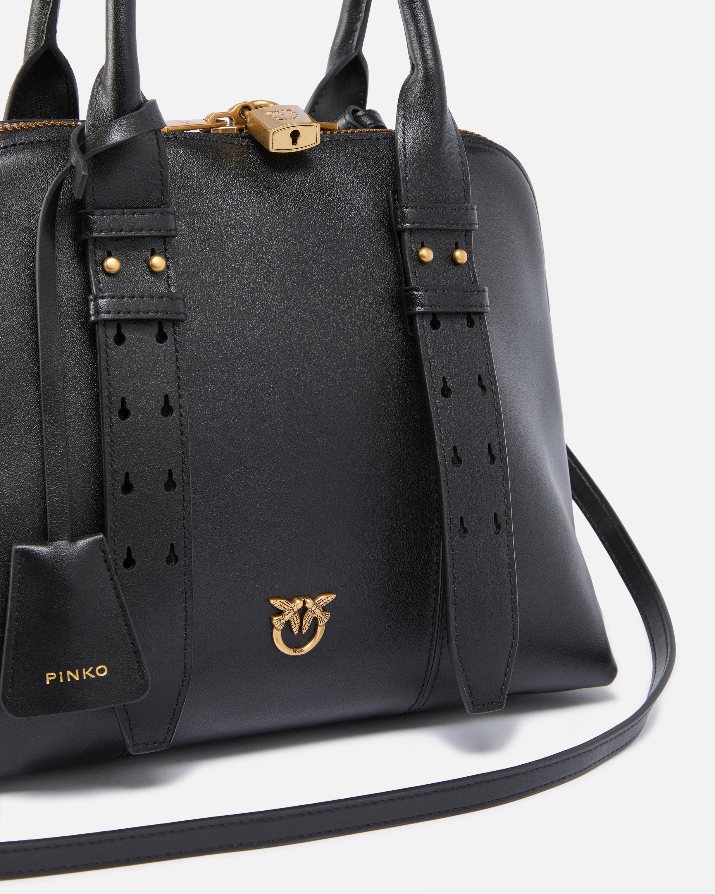 Escape Bag medium bowling handbag made entirely from soft leather. Featuring an adjustable and detachable leather shoulder strap and double handle so it can be carried by hand or on the shoulder, the bag is very versatile and practical. The model features a functional padlock that opens and closes with a key contained in the matching charm, while the finishing touch is provided by the small Love Birds logo plaque symbolising the brand's singular style. The zip fastening at the top opens to reveal a cotton-lined interior with a single zipped slip pocket. Activate your PINKO bag: verify the authenticity of your product and access a personalised experience by scanning the Love Birds embroidery on the back of the bag with your smartphone! - BOWLING BAG MEDIUM