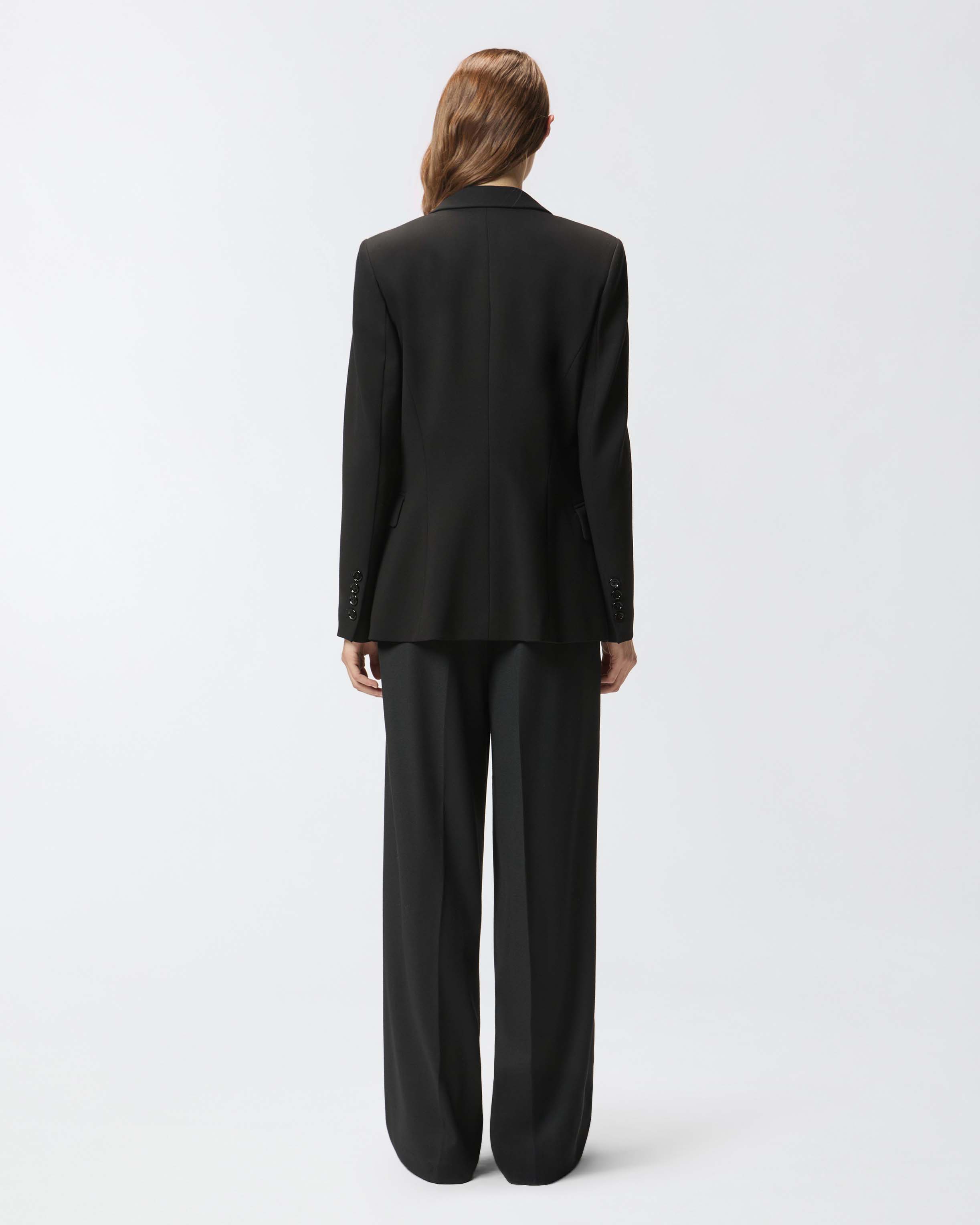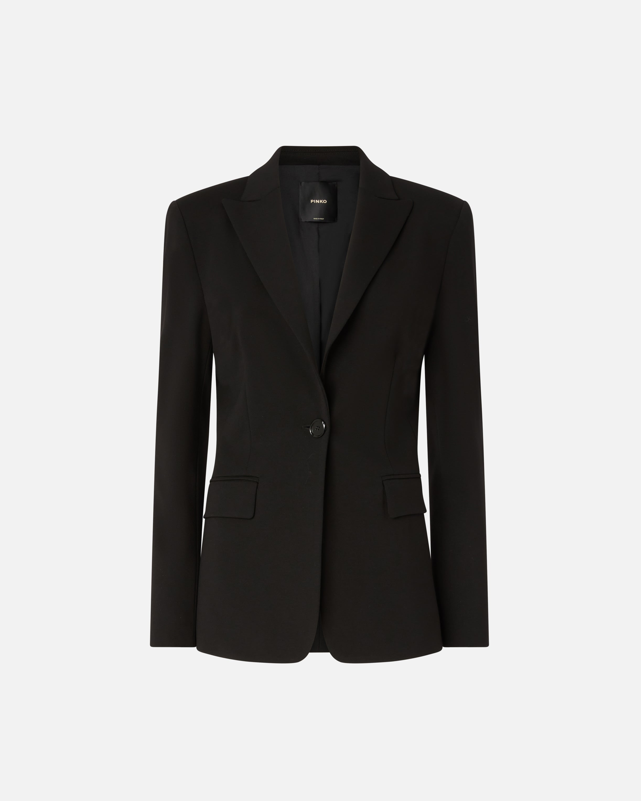Single-breasted, fitted blazer in technical, full Milano-knit stretch viscose fabric. The piece is finished with tailored details, such as the darts that accompany and emphasise the figure, and classic details, such as the lapel collar and flap pockets. Pair the blazer with the trousers in the same fabric to create a suit effect or with a shirt for a slightly but not overly formal look.