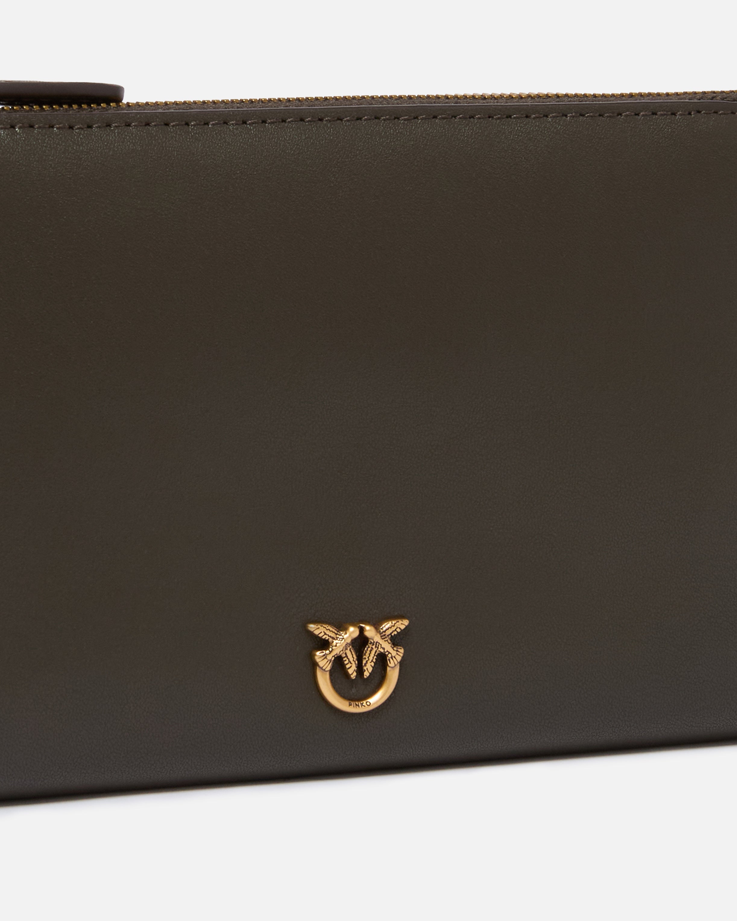 Flat rectangular clutch in silky leather with a cotton lining and zip fastening. The bag is extremely versatile and practical thanks to the adjustable and removable shoulder strap that offers two ways of carrying it: by hand or crossbody. The design is complemented by the iconic Love Birds logo, made from durable antique gold-tone plated metal, which embodies the inimitable style of the brand. Understated and refined, this accessory is the missing piece of your daytime looks and more. Activate your PINKO bag: verify the authenticity of your product and access a personalised experience by scanning the Love Birds embroidery on the back of the bag with your smartphone! - FLAT HORIZONTAL MINI