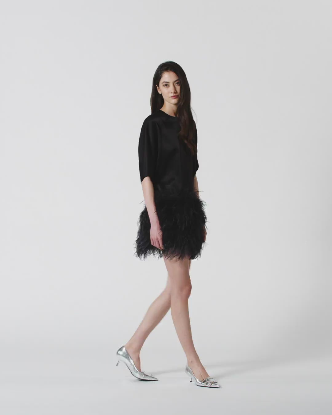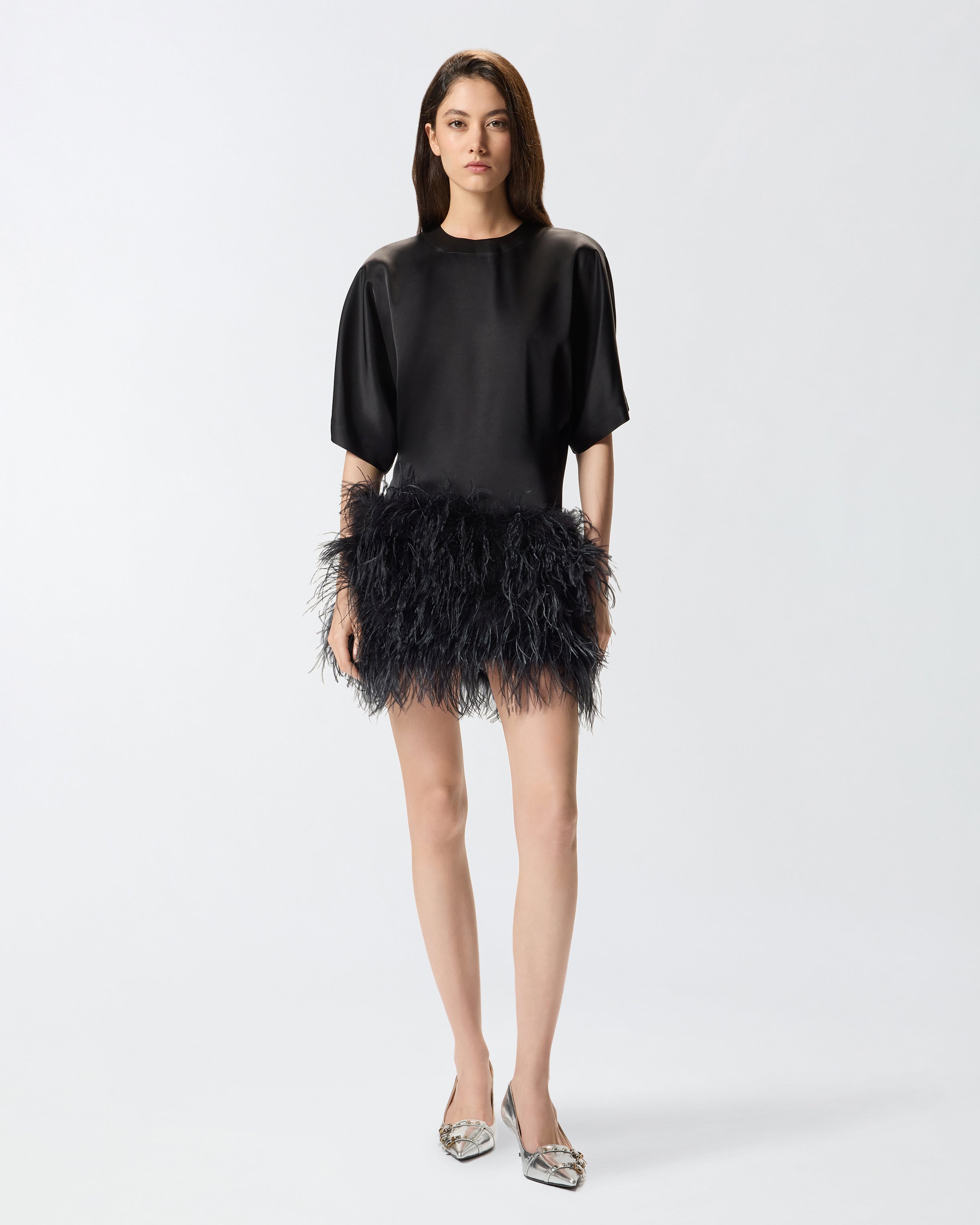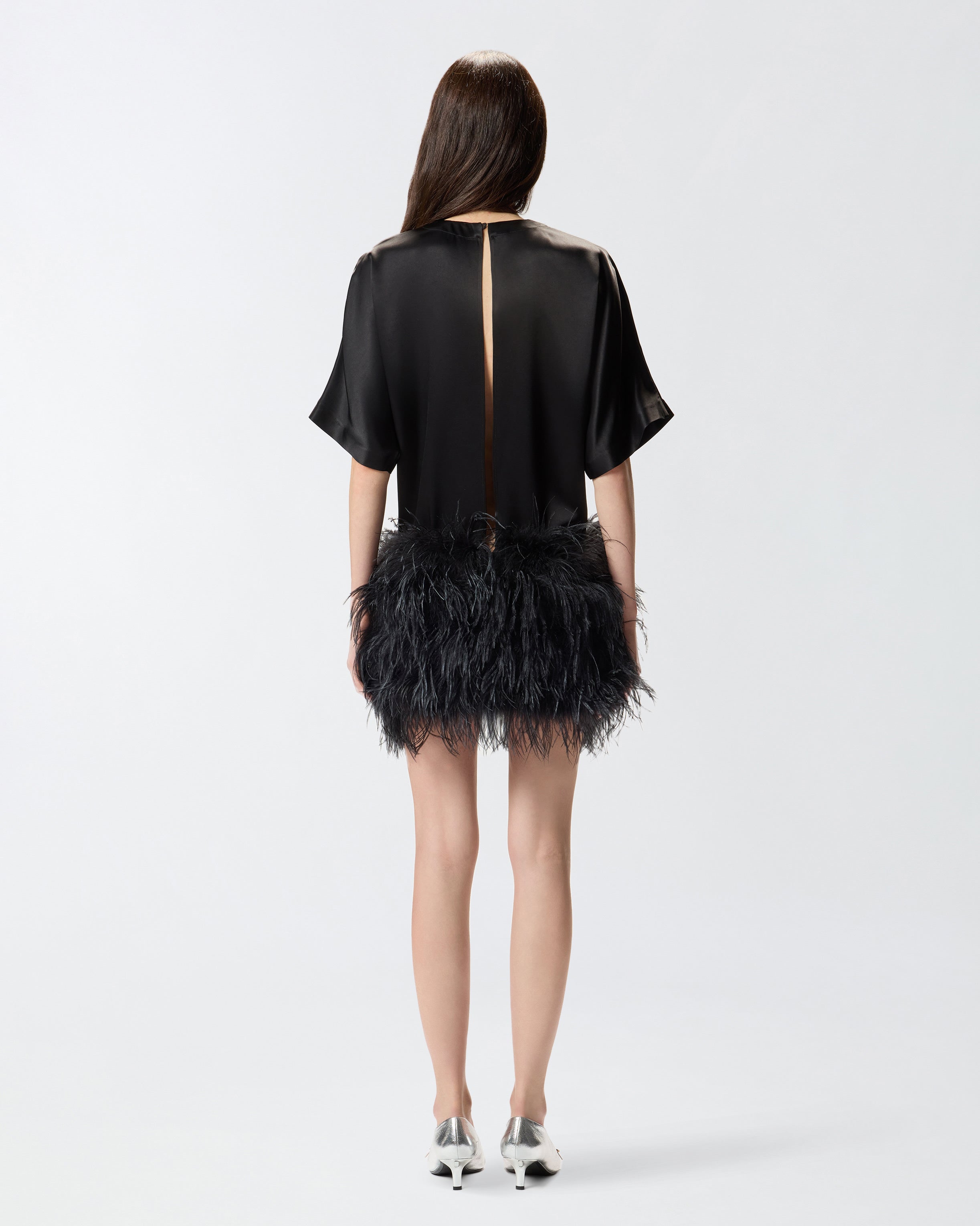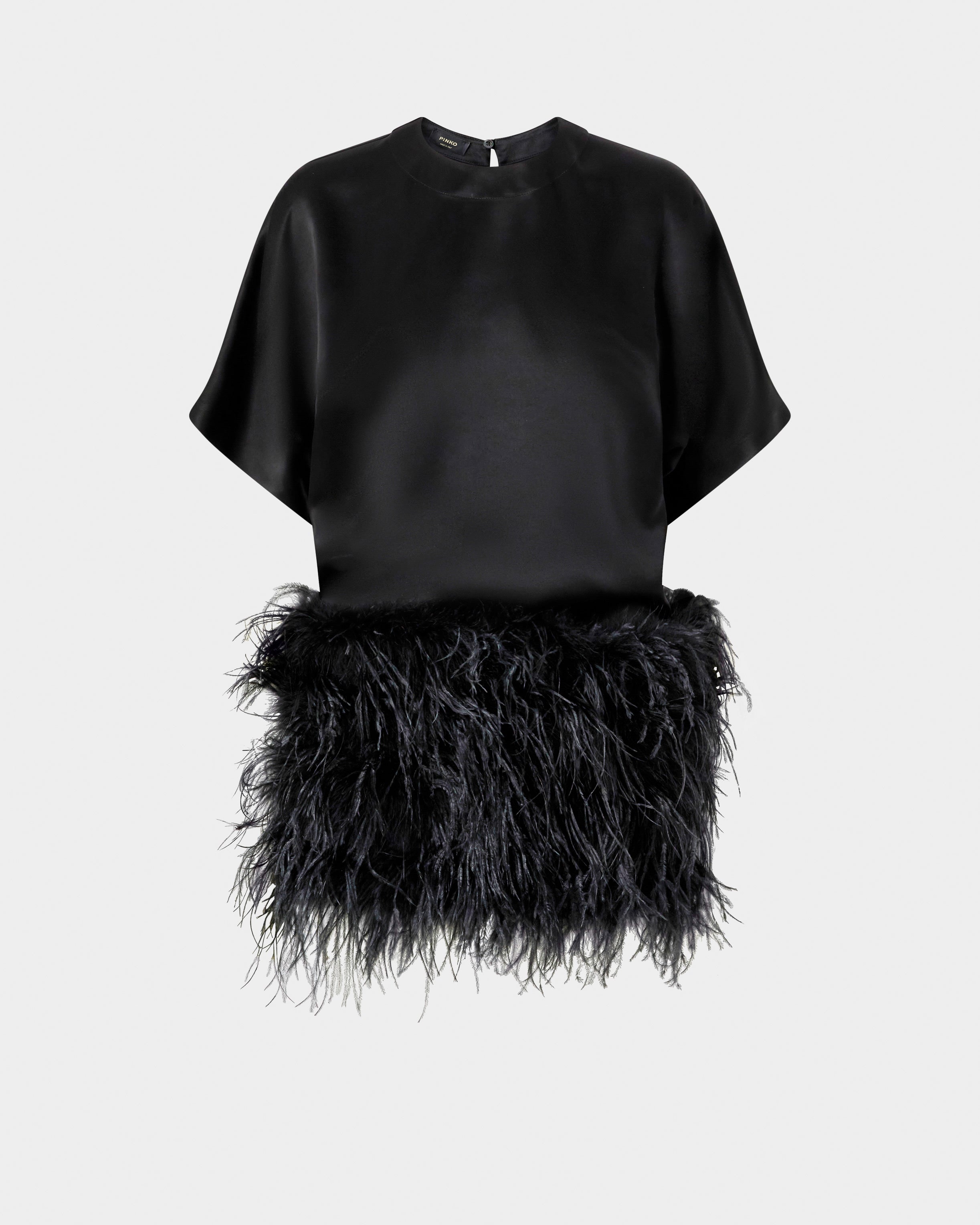 Short loose-fit dress with a T-shirt shape and wide sleeves. The shiny satin gives the piece unique shimmer and a particularly soft hand. A touch of sensuality is given by the long opening on the back, which fastens on the neck with a button on the back. The focus is definitely on the feathers appliqué on the hem, which adds movement and an original couture touch to the look. Wear this short dress for a fluid, slinky effect that elegantly enhances the lines with sophistication and the feminine silhouette.