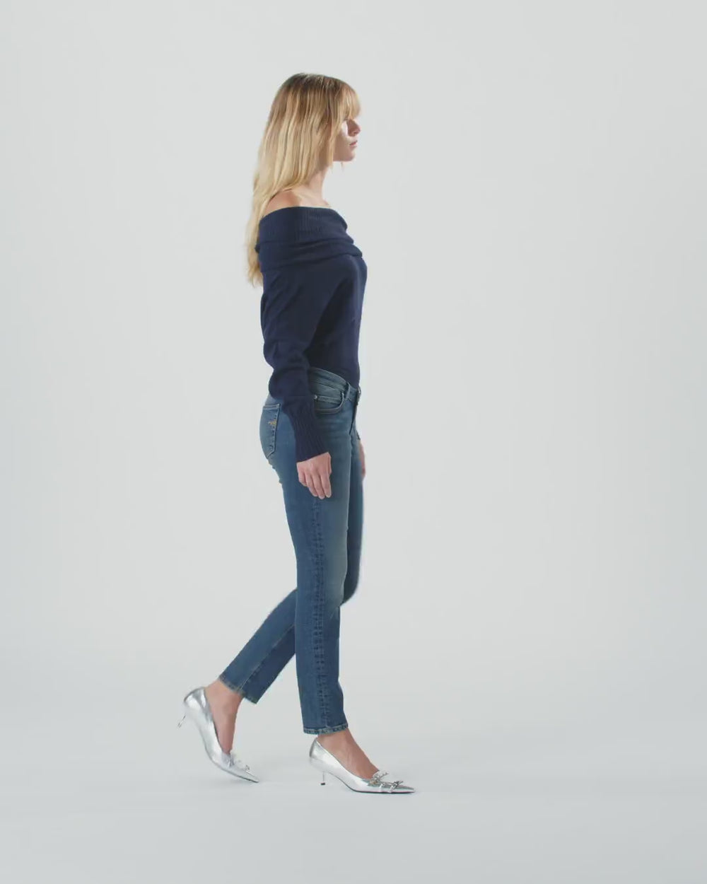 Women's skinny-fit five-pocket jeans in blue stretch cotton denim with a stonewash that creates colour contrasts over the denim. The style stands out for the high V-shaped waist on the front. The brand's lettering logo embroidered on the back of the waistband and on the back right pocket adds pure PINKO style to the design. Concealed zip and button fastening.