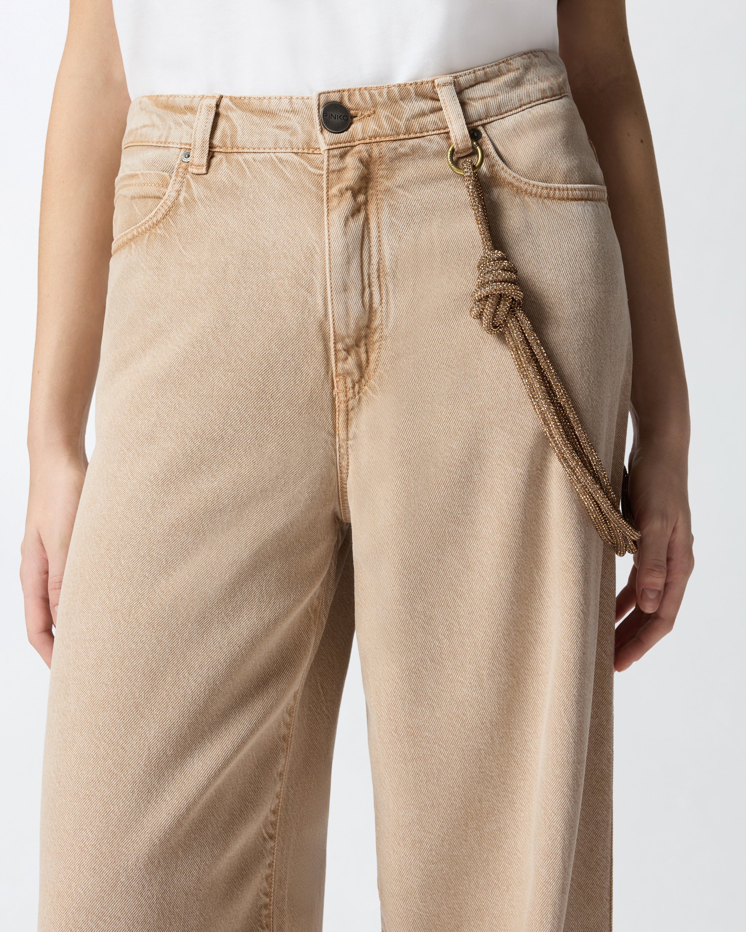Five-pocket jeans with a relaxed fit, made of cotton and lyocell bull denim, finished with a marbled wash for a refined worn-in effect. The style is enhanced with a detachable sparkling cord, which can be fastened to the front loop and a small loop at the back pocket. The design is finished with a matching embroidered Love Birds logo on one of the rear pockets. A timeless piece in the female wardrobe reinterpreted with a glamorous twist, ready to embellish your everyday outfits. - LAURYN LOOSE