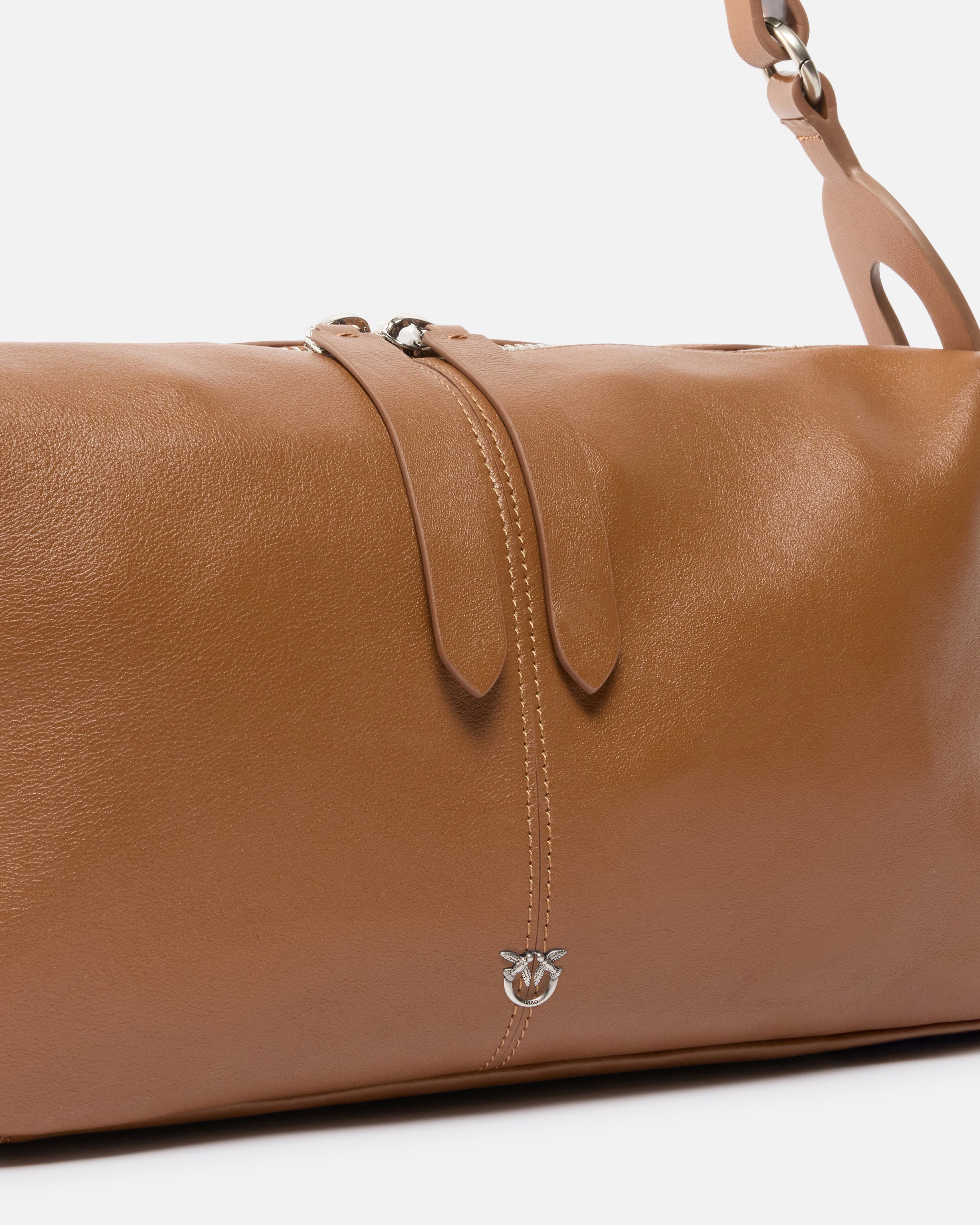 Medium-sized Keeper Bag in new biker leather with slightly elongated rectangular shape and soft design. The adjustable leather handle, designed for shoulder wear, offers a clear nod to western style: the ends are reminiscent of a horseshoe, while the metal elements, including the tips, buckles and loops, are enhanced by meticulous detailing inspired by the embellishments typically seen on country clothing. One of the zips of the two-way closure is customised with a small metal appliqué depicting the iconic Love Birds Diamond Cut logo, while the cotton drill-lined interior features a zipped slip pocket with logo-branded label. Activate your PINKO bag: verify the authenticity of your product and access a personalized experience by holding your smartphone close to the Love Birds embroidery located on the side of the bag!