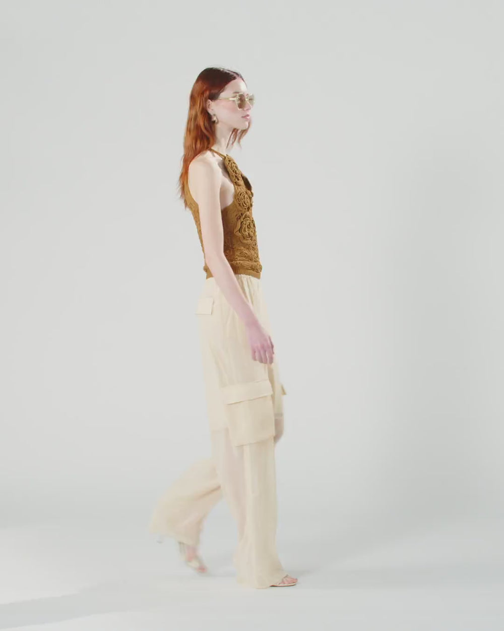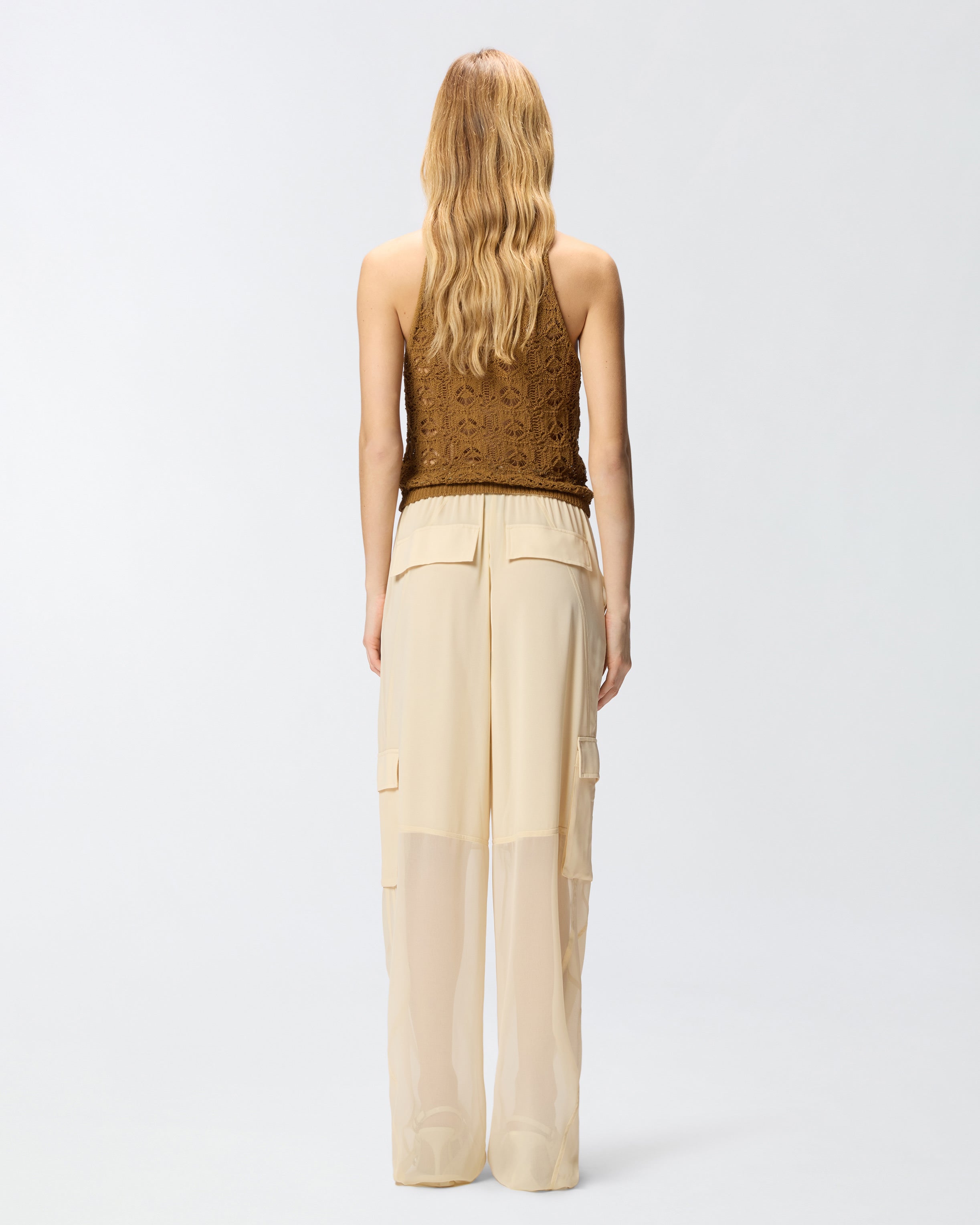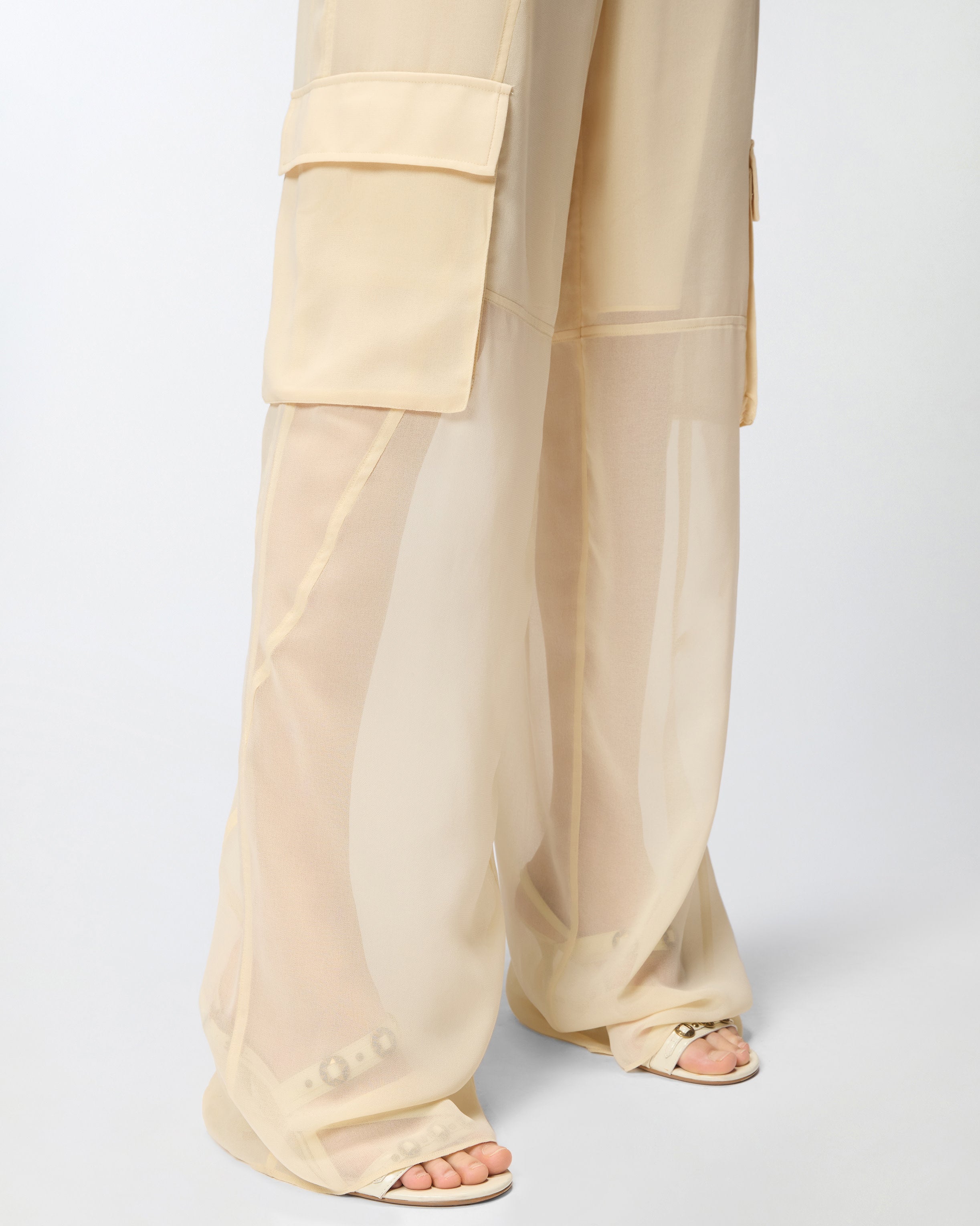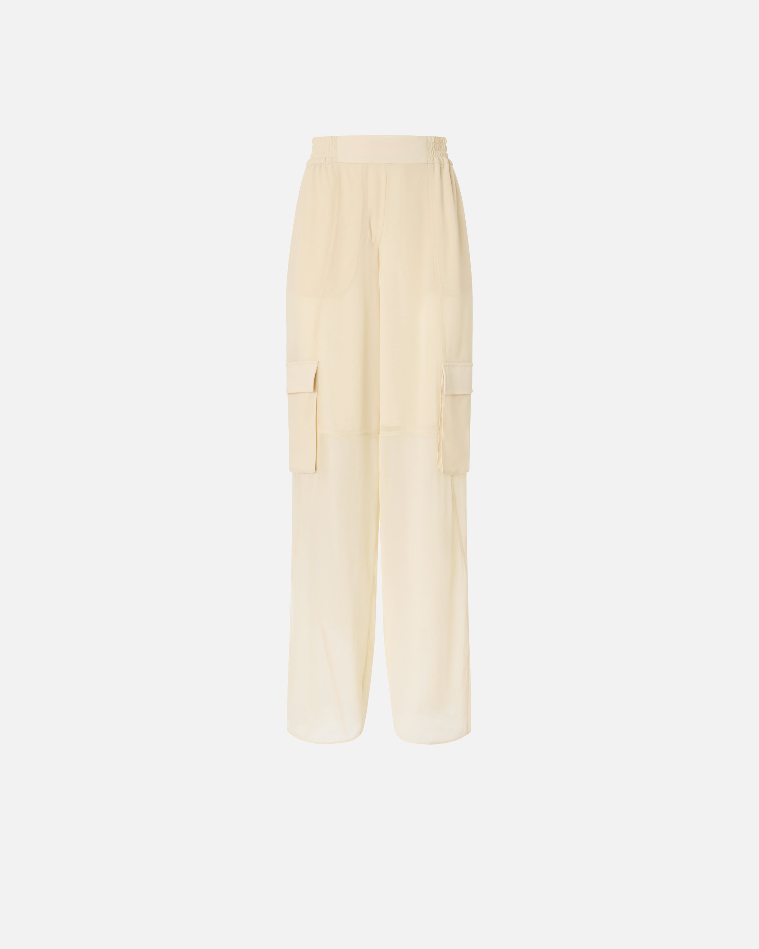Straight, loose-leg trousers in lightweight georgette fabric. This garment features an elasticated waist with smocked stitch on the sides, two back flap pockets and two gusseted pockets with flap down the leg. These trousers are lined for greater comfort when worn. Understated and contemporary, this model will become a real all-purpose staple in your wardrobe.