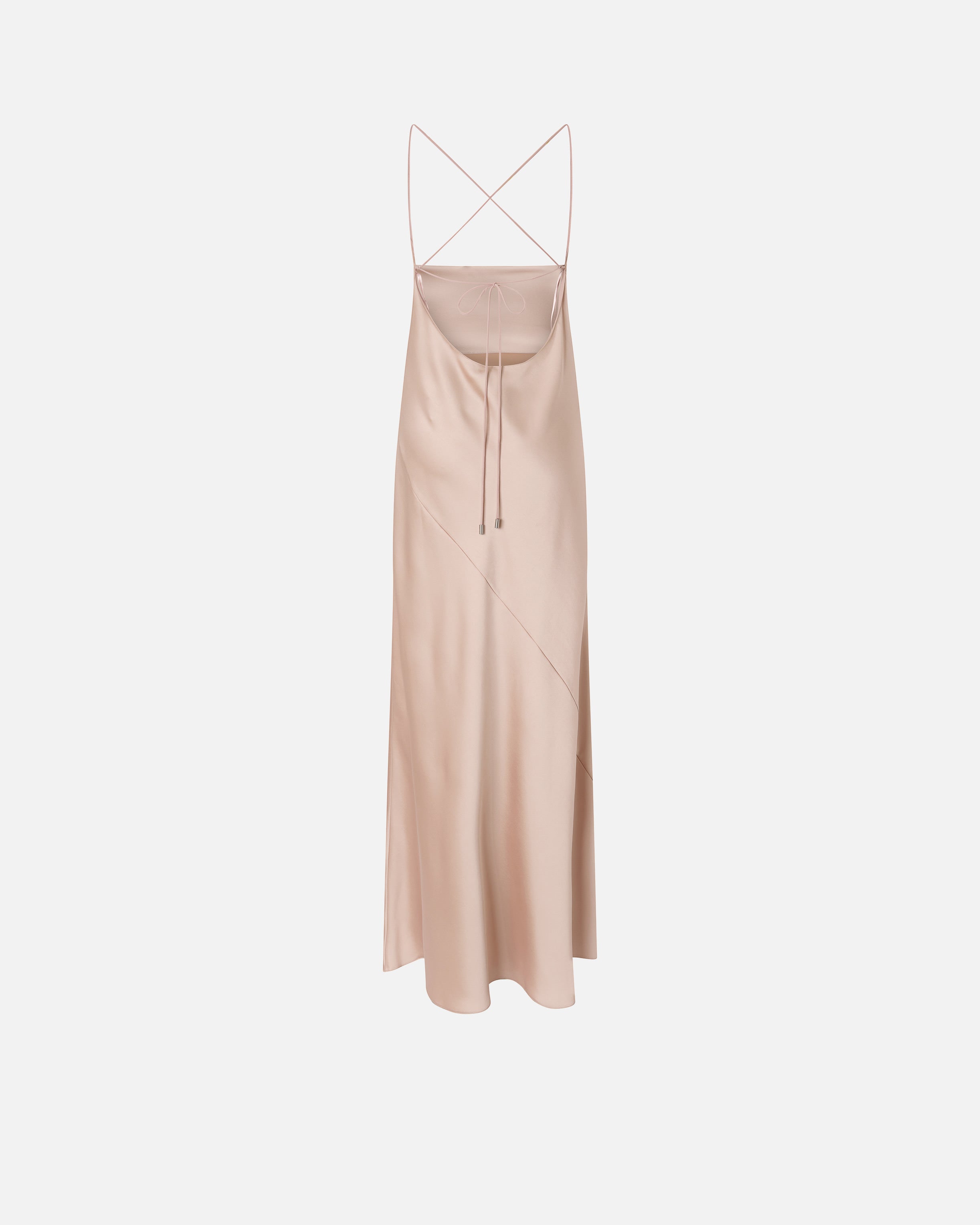 Long slip dress with spaghetti straps, loose neckline with draping at the front and back-revealing wide round neckline at the rear, punctuated only by two ribbons that tie in the middle. Made from soft, shiny double-faced satin, the PINKO style is made from a even-looking fabric both inside and out, which delicately caresses the body for a fluid, lightweight fit. This elegant, feminine dress is perfect for ceremonies and cocktail parties.