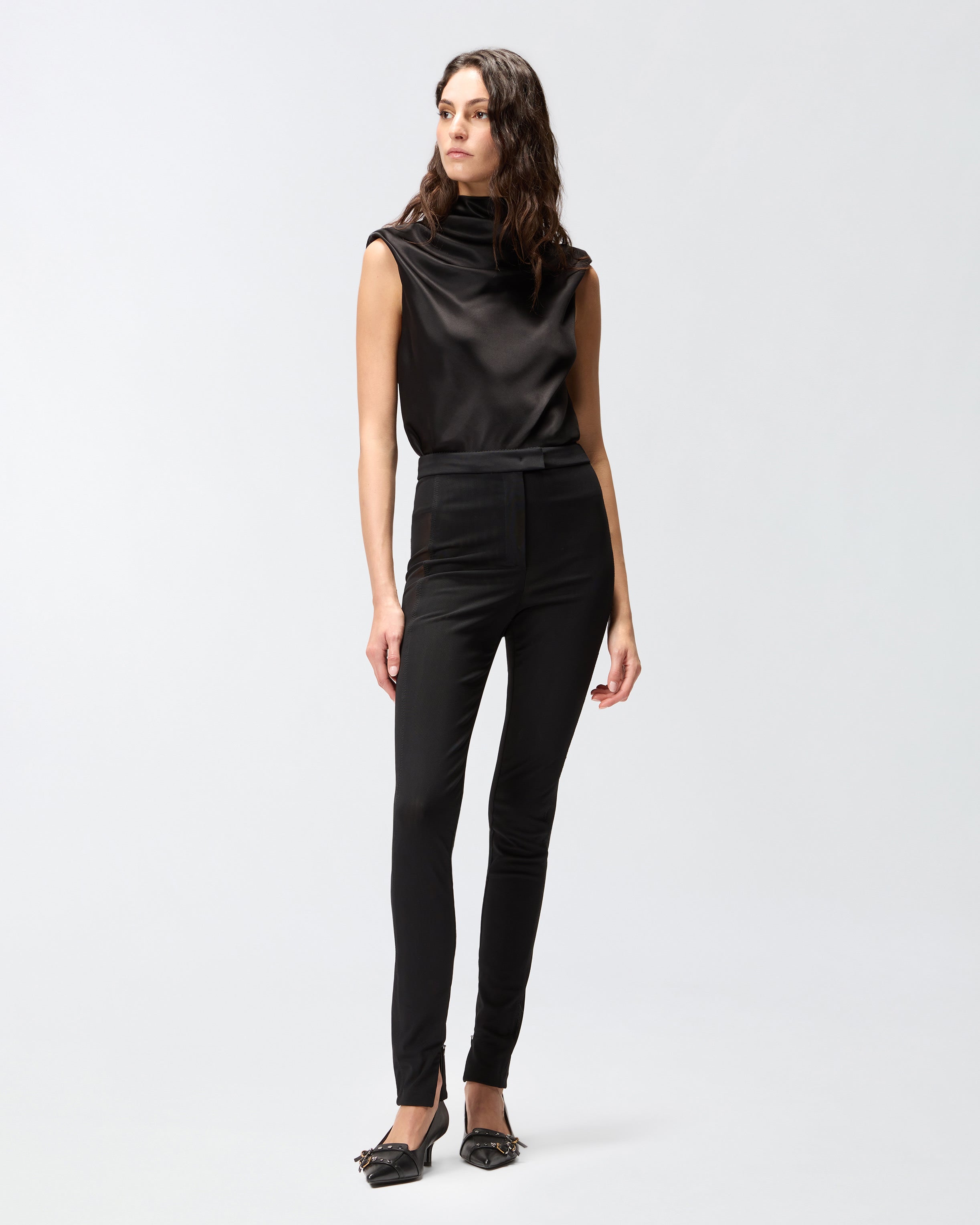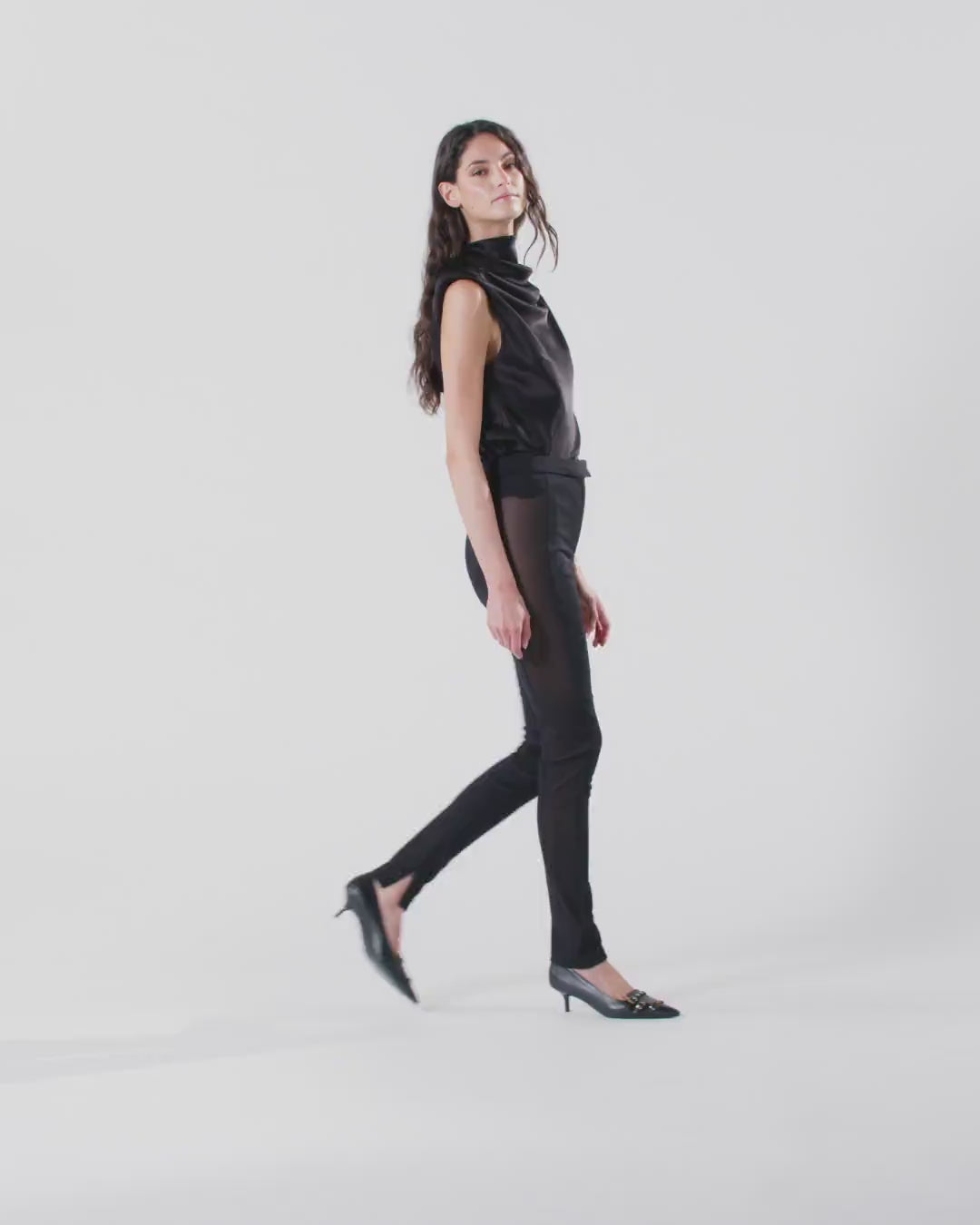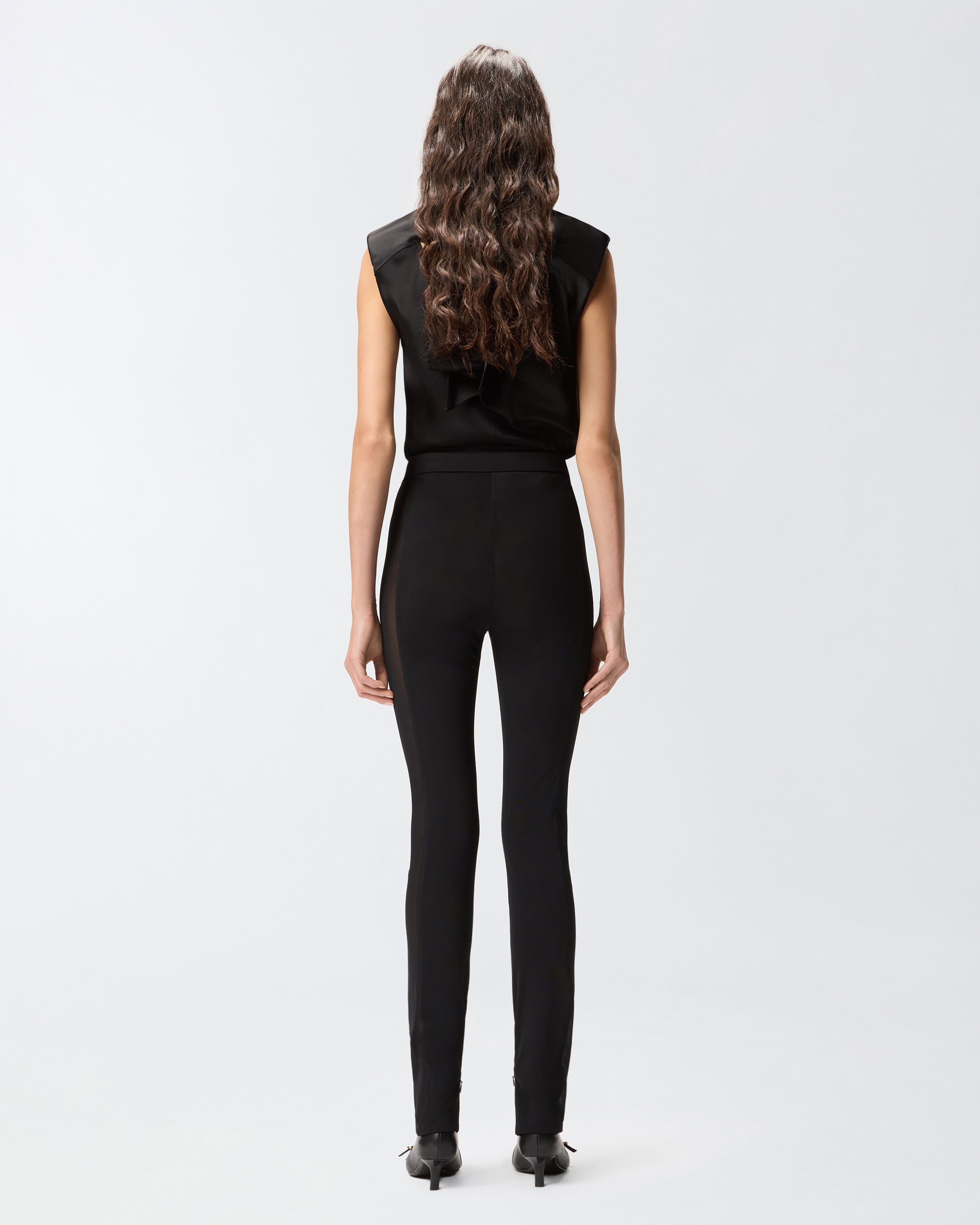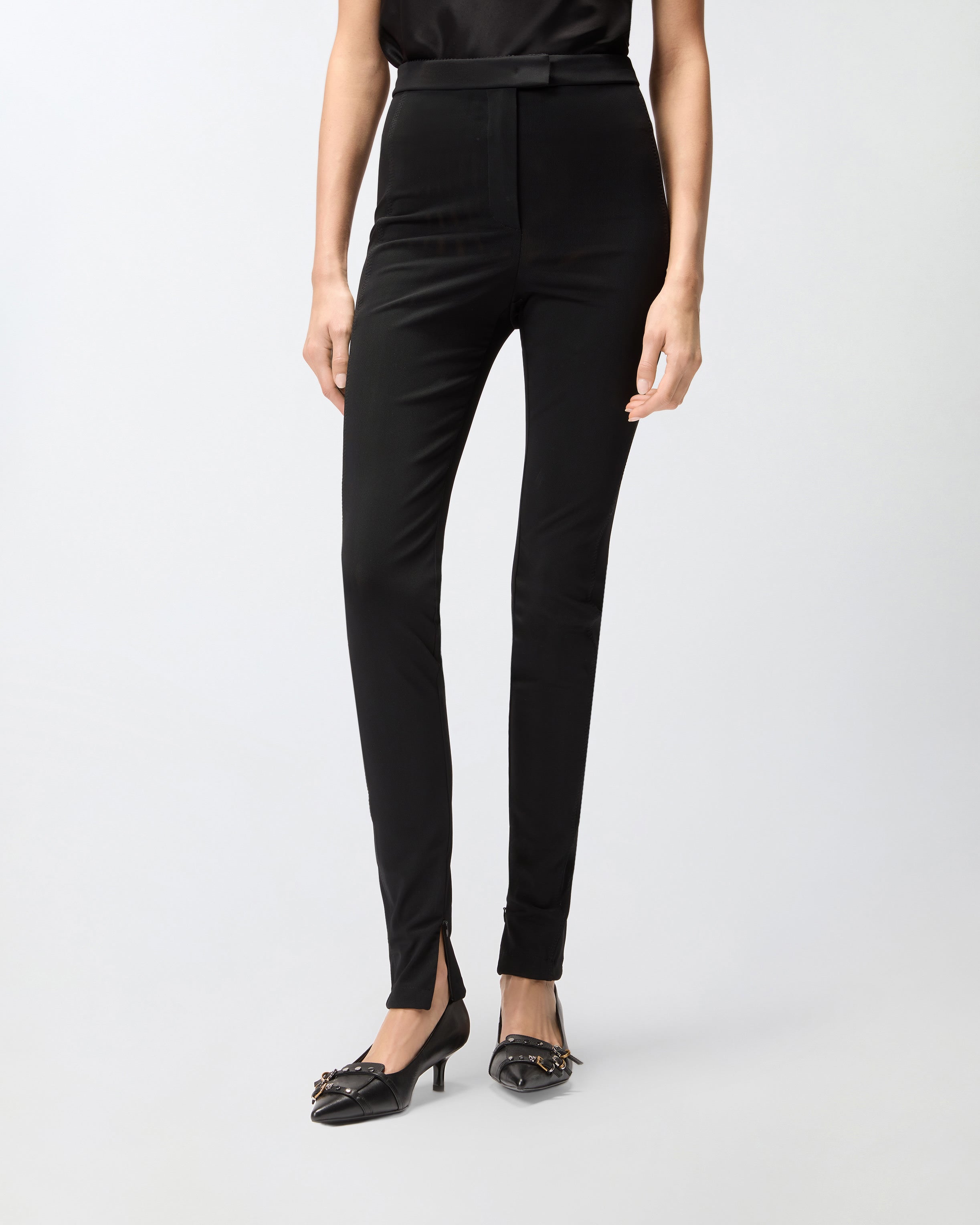 Long skinny-fit trousers with sheer side inserts on the leg and zipped hems. The fabric, bodice fabric with a lot of stretch, gives the piece a shaping effect, enhancing curves in a natural and harmonious way. The piece guarantees optimal comfort, wrapping the body without compromising freedom of movement, and offering a fit that emphasises the figure with discretion and elegance.