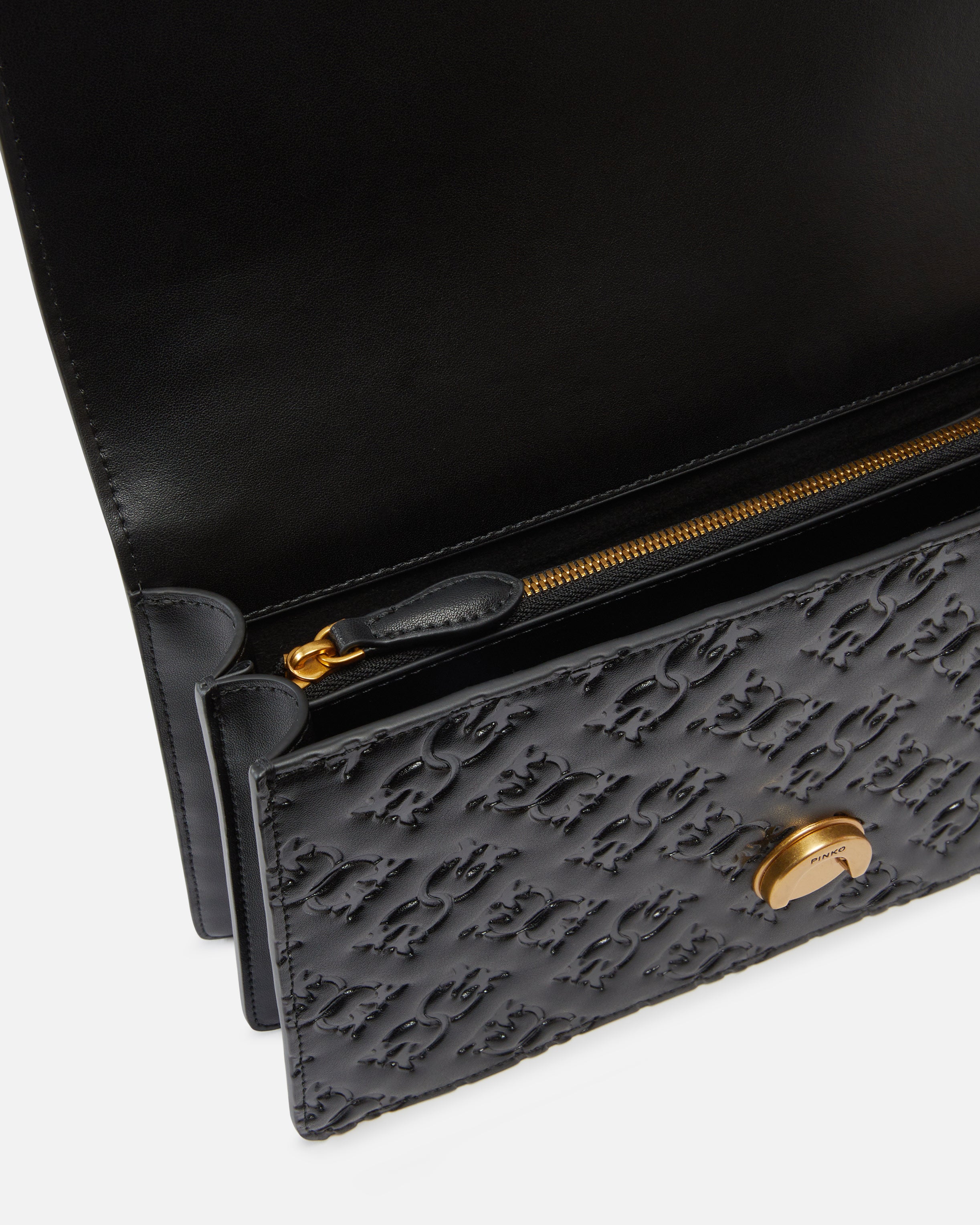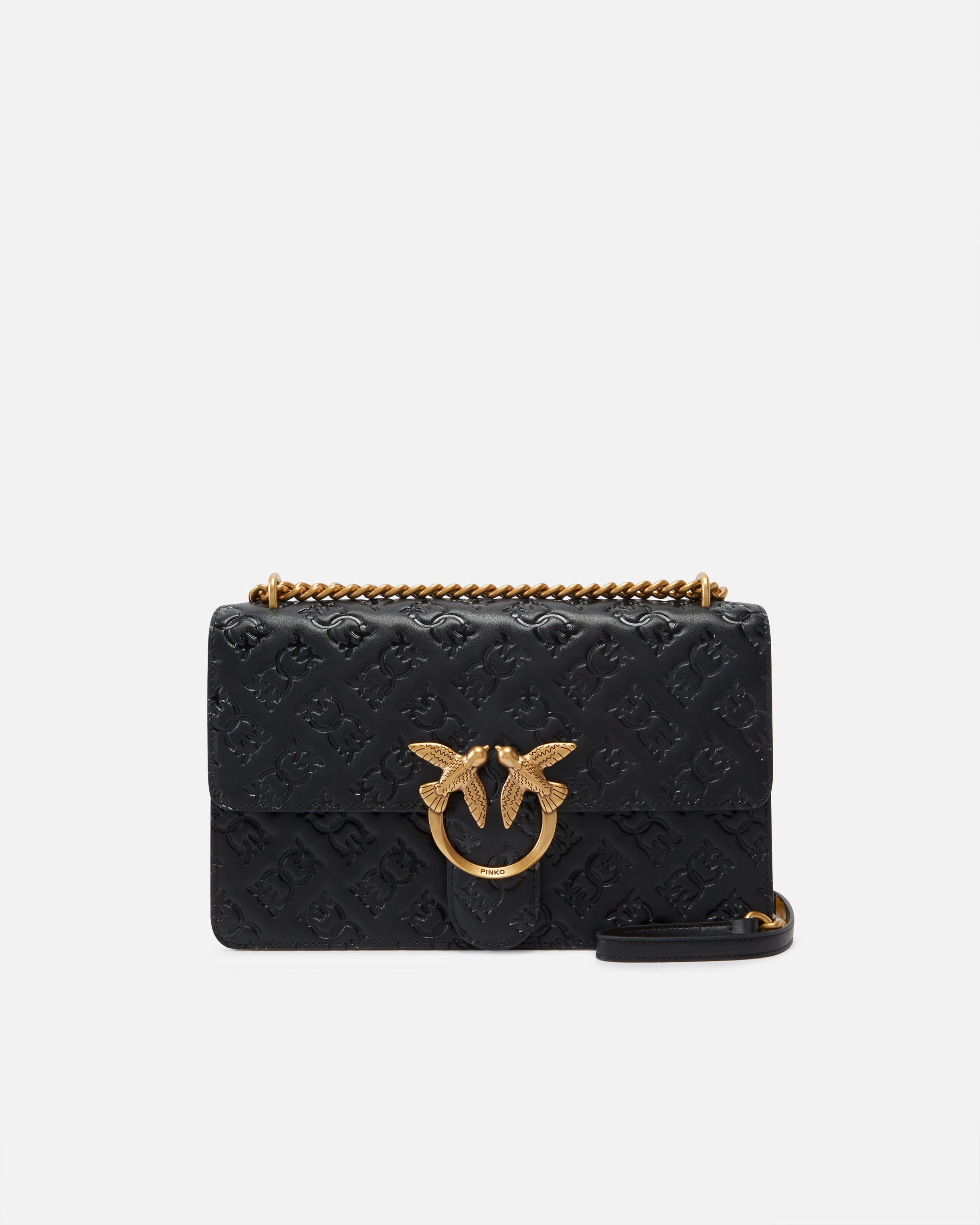 Love Bag crossbody bag in soft, smooth leather with imprimé Love Birds Monogram print. The metal chain strap comes with an adjustable leather shoulder pad for greater comfort when worn. The accessory boasts suede-effect microfibre lining, a leather slip pocket and a zipped centre divider pocket. The flap closure is accompanied by the iconic Love Birds Diamond Cut metal buckle. Activate your PINKO bag: verify the authenticity of your product and access a personalised experience by scanning the Love Birds embroidery on the back of the bag with your smartphone!