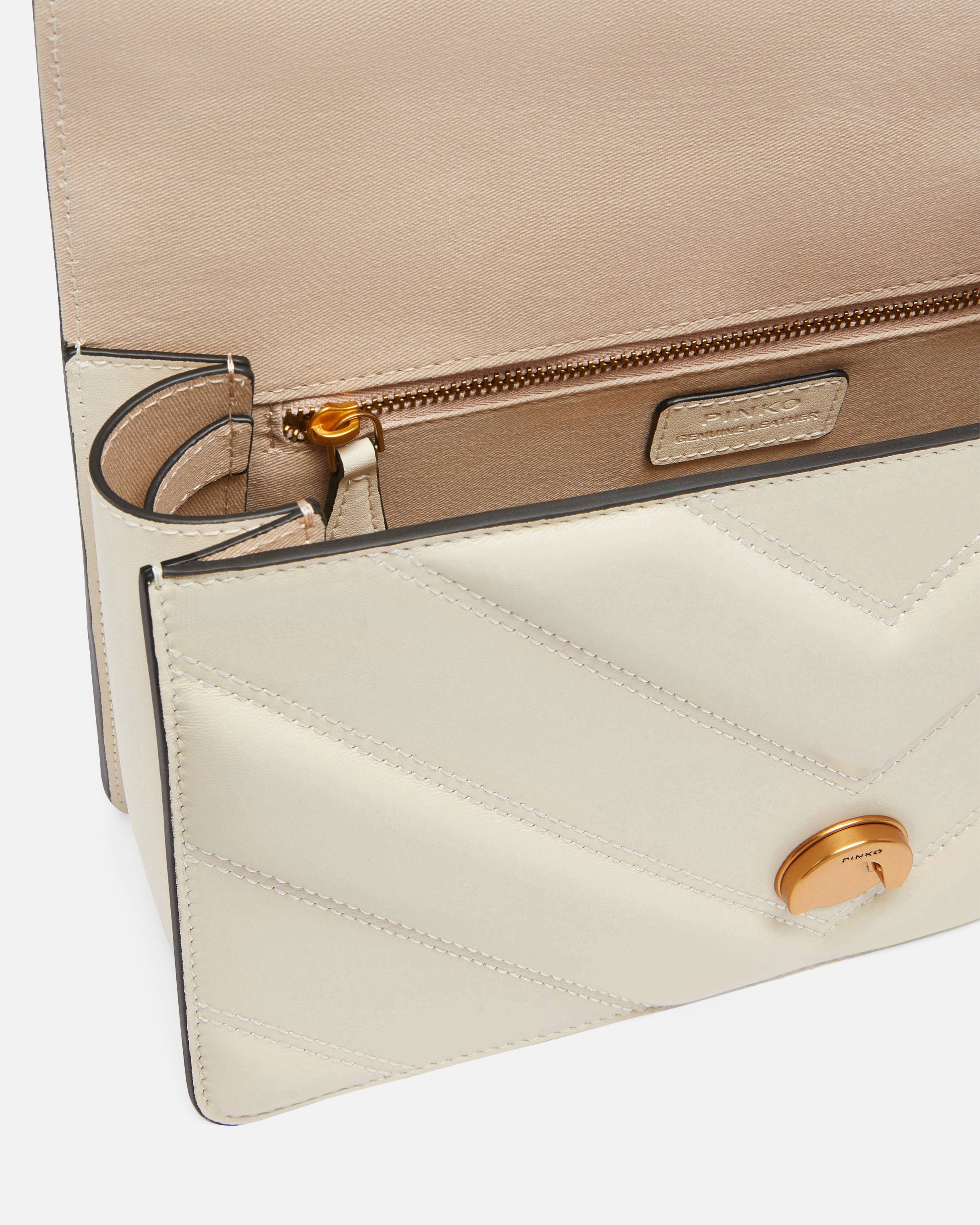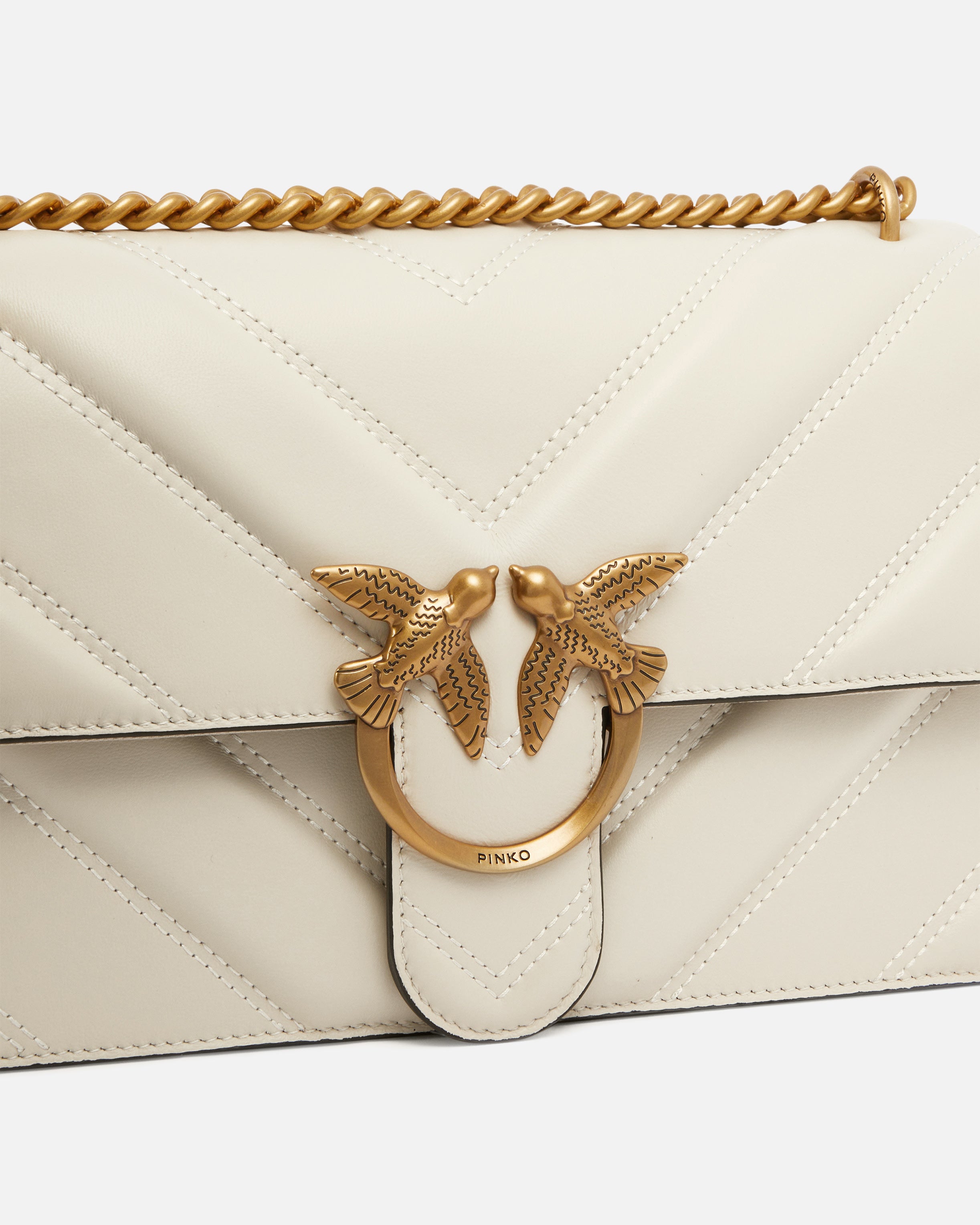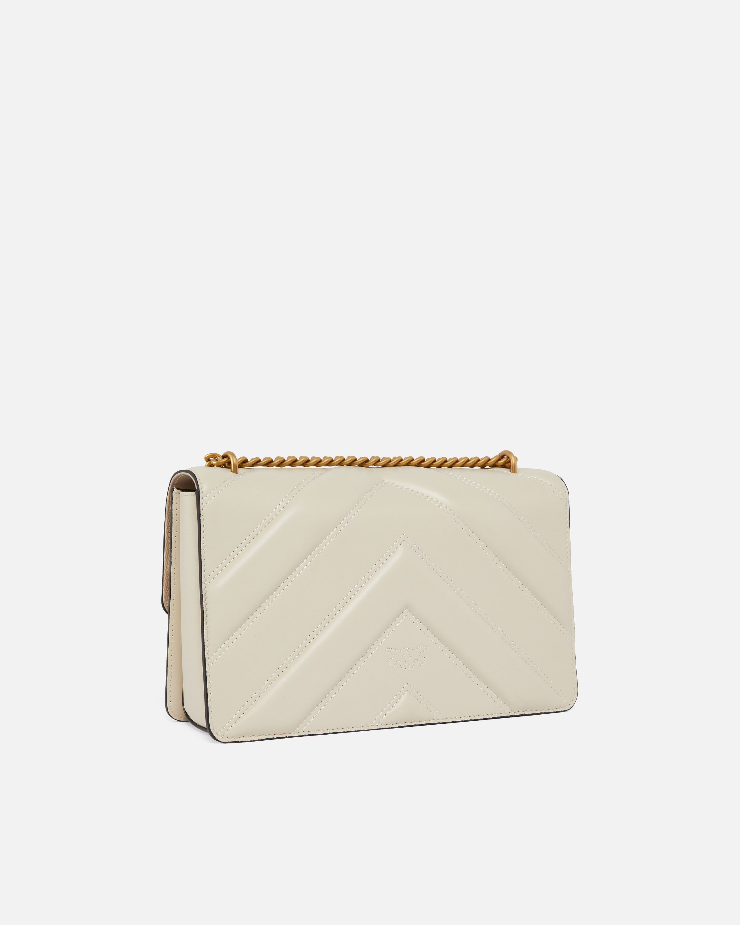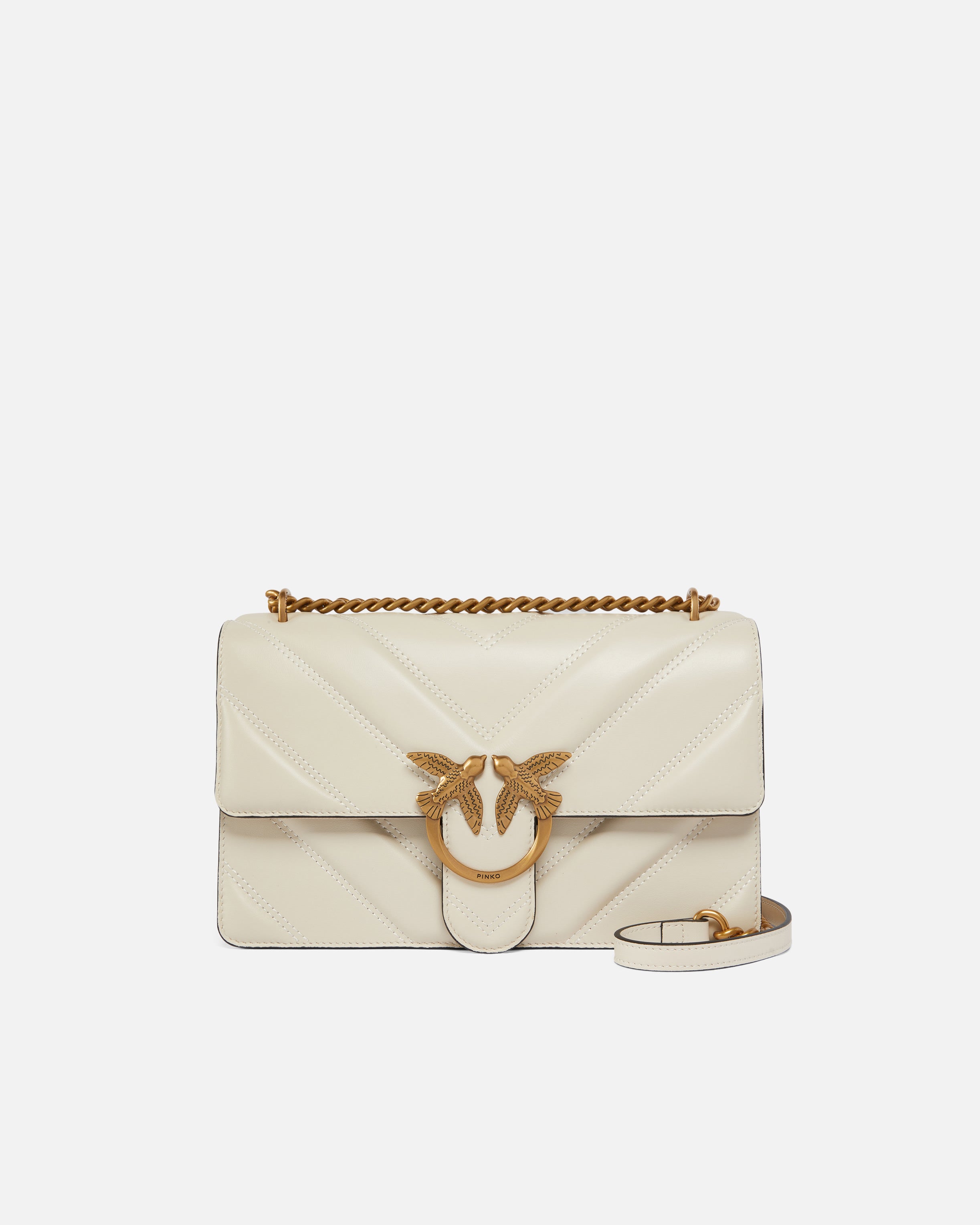 Love Bag One Light medium handbag in nappa leather with chevron-patterned quilting and light, unstructured construction. Featuring an adjustable sliding chain strap with leather pad for hand carry or shoulder or crossbody wear, this bag is very versatile and practical. The flap fastening is accompanied by the timeless buckle featuring the Love Birds Diamond Cut logo. The accessory features a cotton drill-lined interior and a zipped slip pocket. Activate your PINKO bag: verify the authenticity of your product and access a personalised experience by scanning the Love Birds embroidery on the back of the bag with your smartphone!