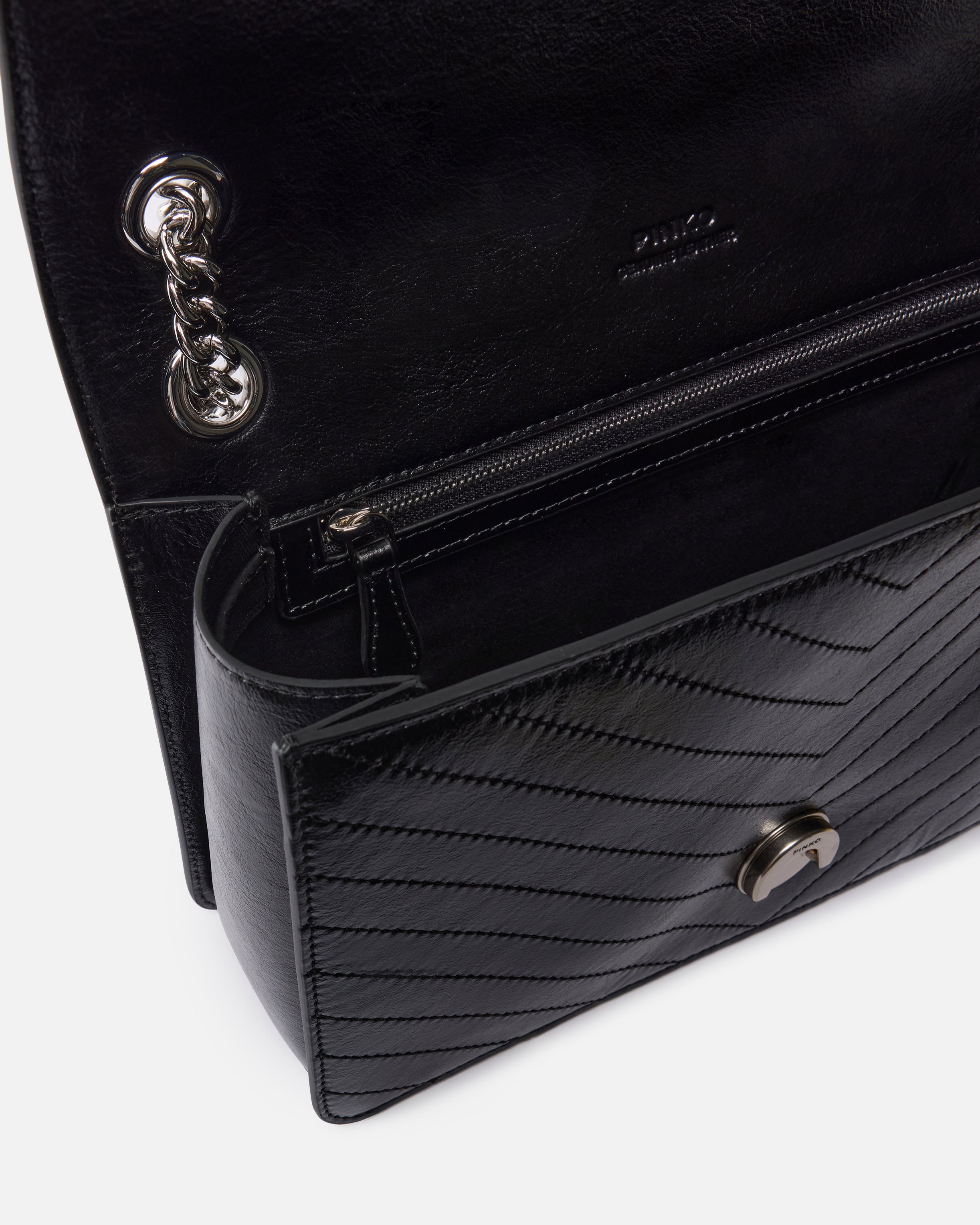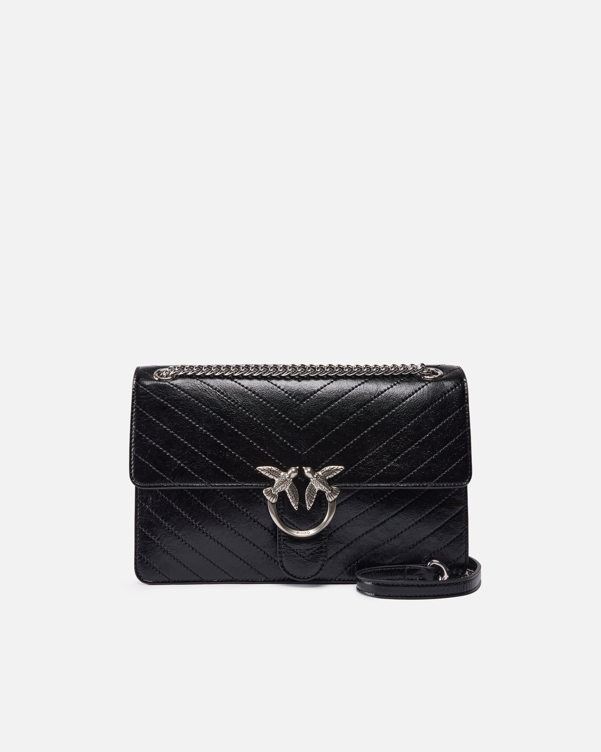 Love Bag One medium, light-structured bag in wrinkled leather embellished with chevron motif. This piece includes a rounded chain shoulder strap and leather shoulder pad, allowing you to carry it in three different ways: by hand, crossbody and on the shoulder. This bag is modern and refined, and the Love Birds Diamond Cut buckle accompanying the strap closure symbolises PINKO's singular style. The accessory features a cotton drill-lined interior and a zipped slip pocket. Activate your PINKO bag: verify the authenticity of your product and access a personalised experience by scanning the Love Birds embroidery on the back of the bag with your smartphone!