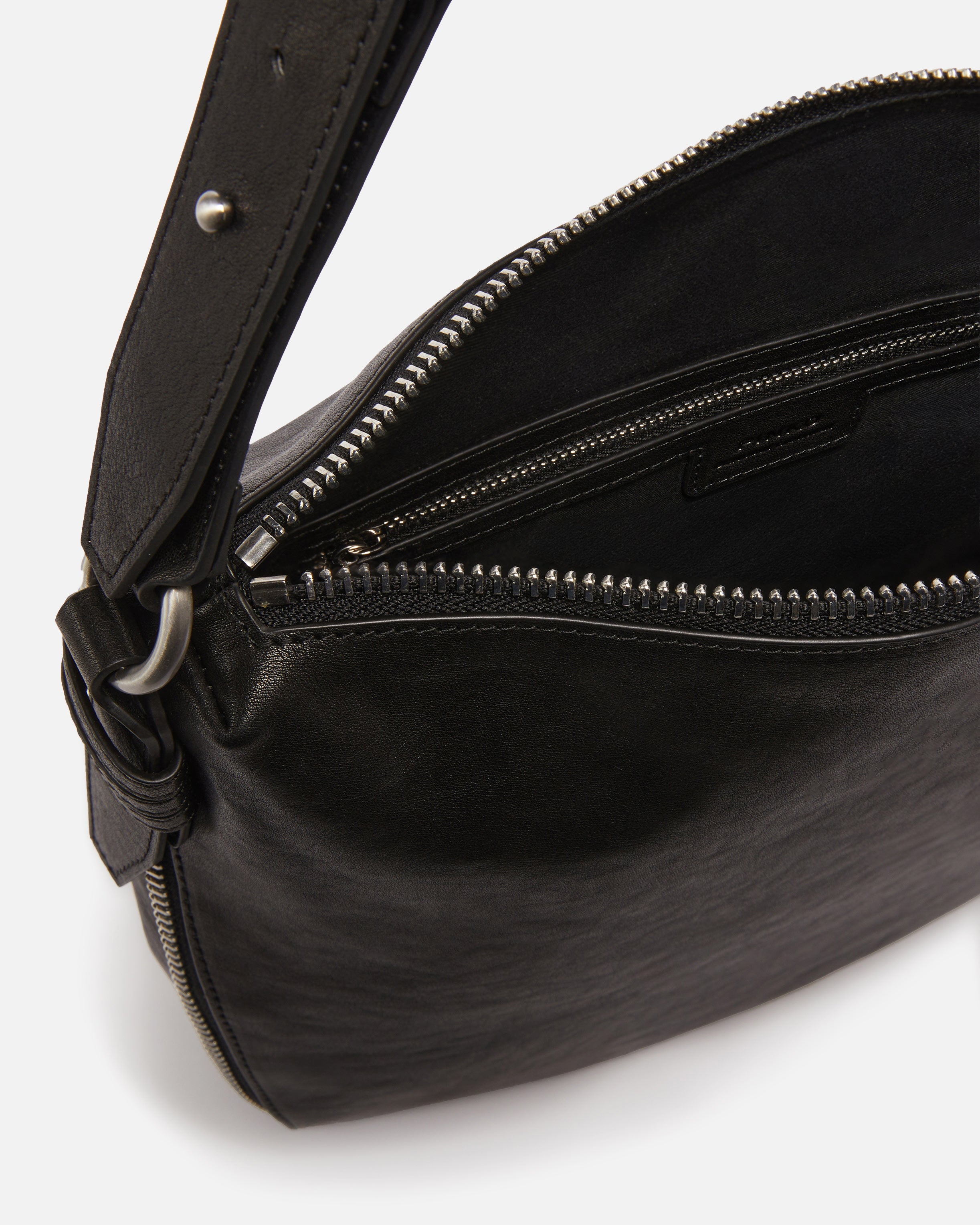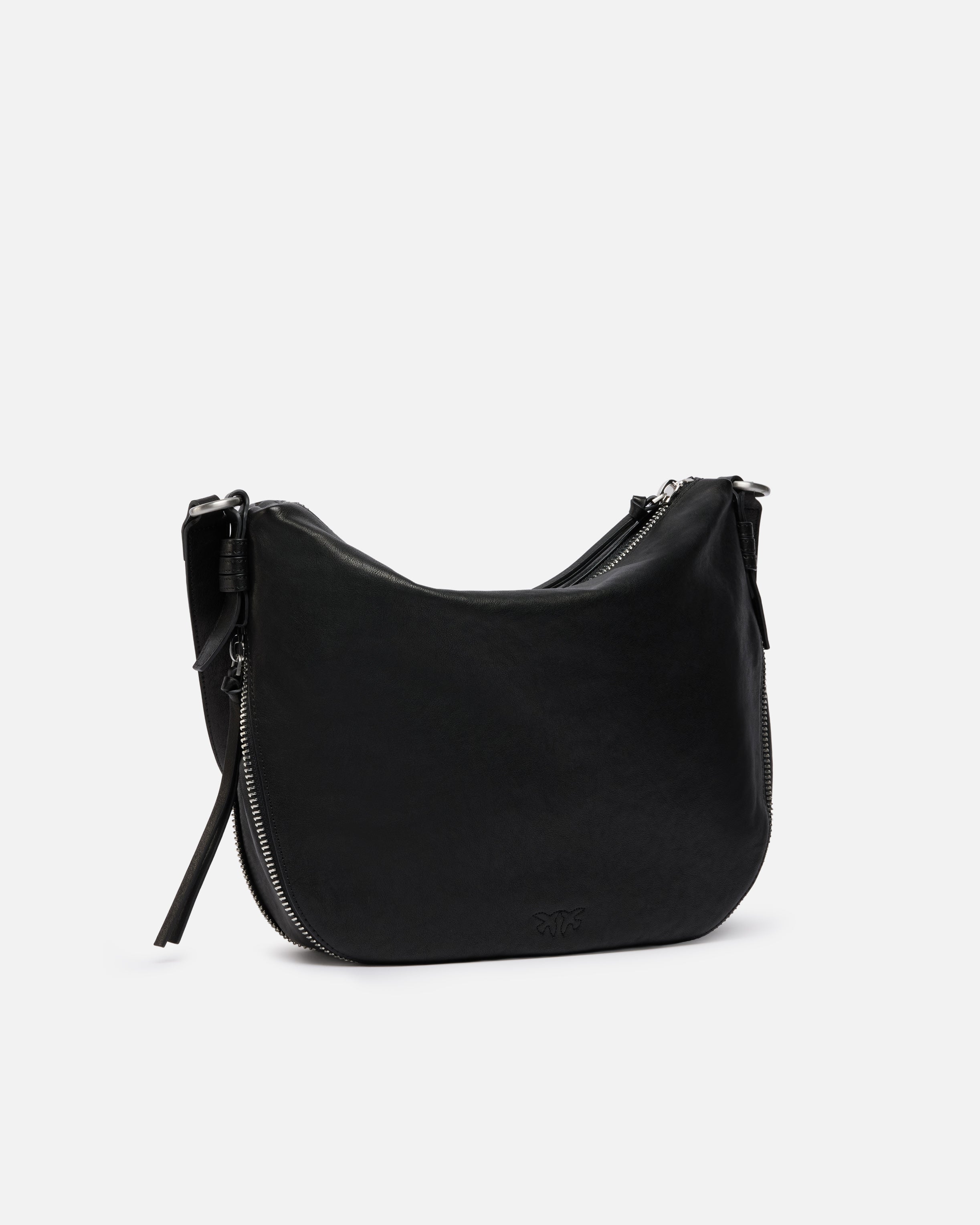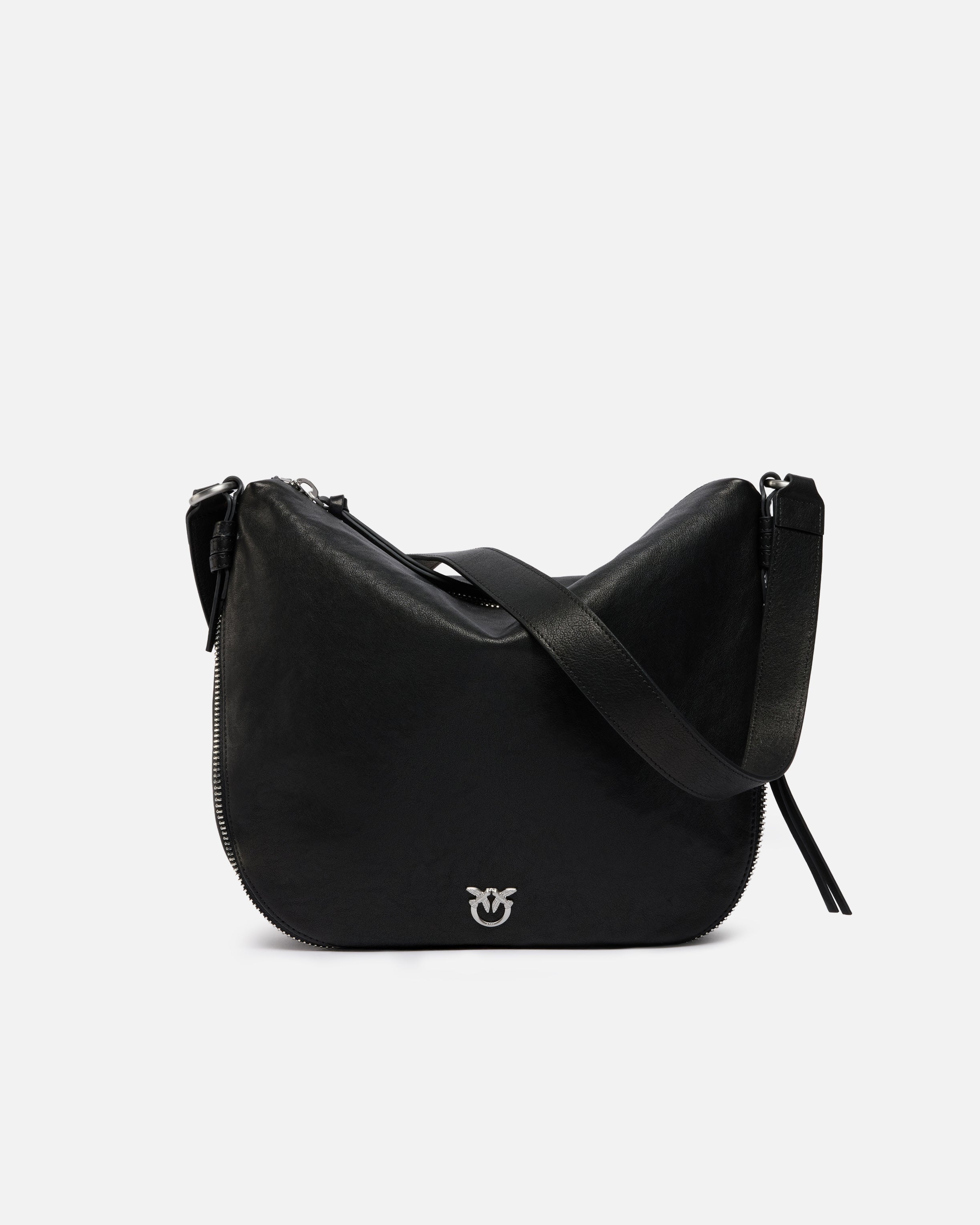 Medium hobo bag in soft leather that comes with a functional zip-around design and with a cotton lining. Featuring an adjustable leather shoulder strap so it can be worn on the shoulder or crossbody, the bag is extremely versatile and practical for everyday use. The biker-style accessory sports bold and personal allure, while the Love Birds Diamond Cut buckle embodies the inimitable PINKO style. Activate your PINKO bag: verify the authenticity of your product and access a personalised experience by scanning the Love Birds embroidery on the back of the bag with your smartphone!