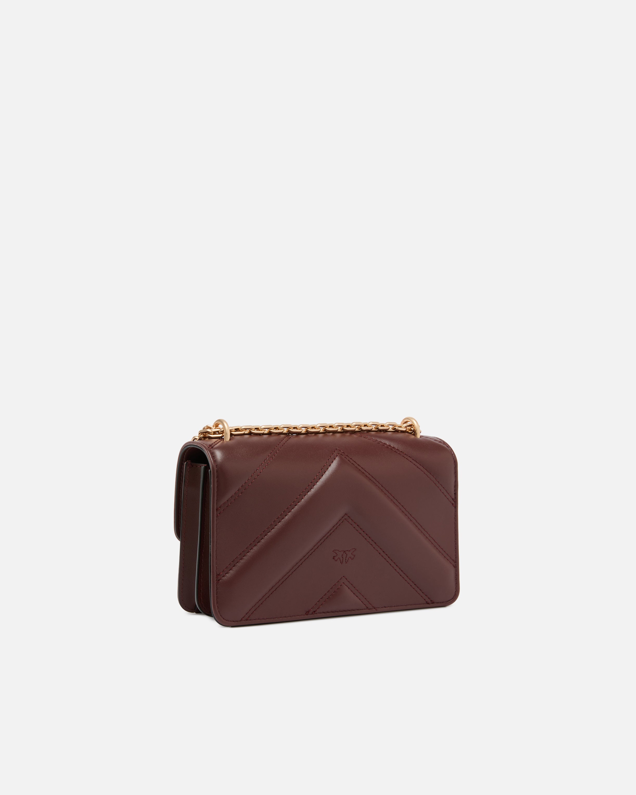 The Mini Love Bag One small handbag features a chevron design that alternates between soft, silky leather inserts and nappa leather inserts, creating a slightly puffy, quilted effect. The style features a magnetic button fastening complemented by the iconic Love Birds Diamond Cut buckle, and is enhanced with a shoulder strap combining a coordinated leather pad and triple chain: one with a rounded wire, one with rectangular links, and one with small round links, creating a final effect that fully reflects the brand’s creative flair. The interior, lined in cotton drill, features a zipped centre pocket that divides the bag into two compartments. Activate your PINKO bag: verify the authenticity of your product and access a personalised experience by scanning the Love Birds embroidery on the back of the bag with your smartphone! - LOVE ONE MINI TRIPLE CHAIN