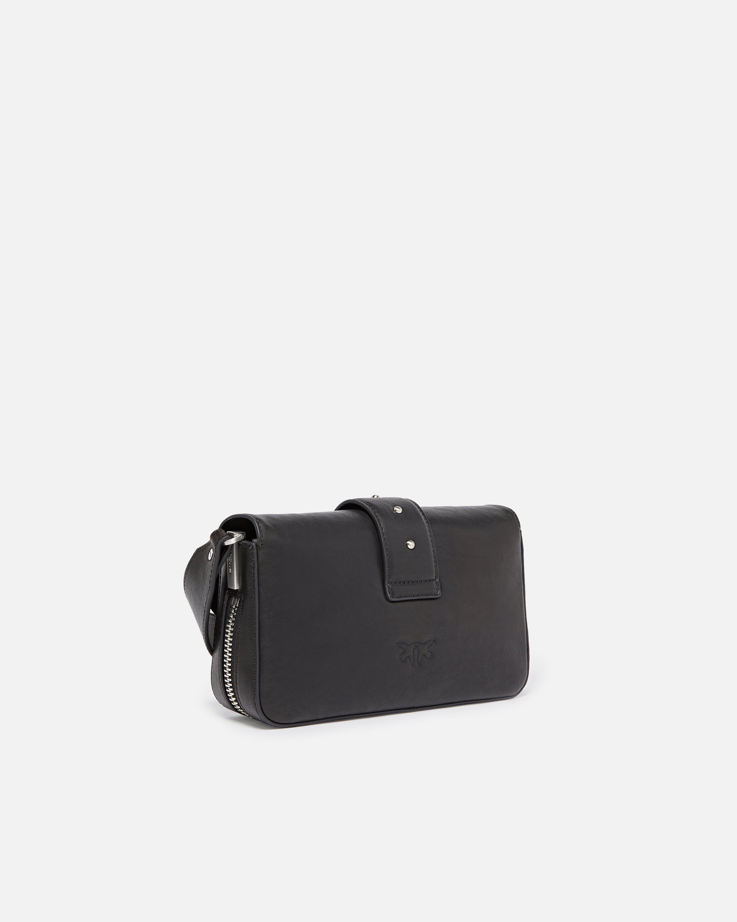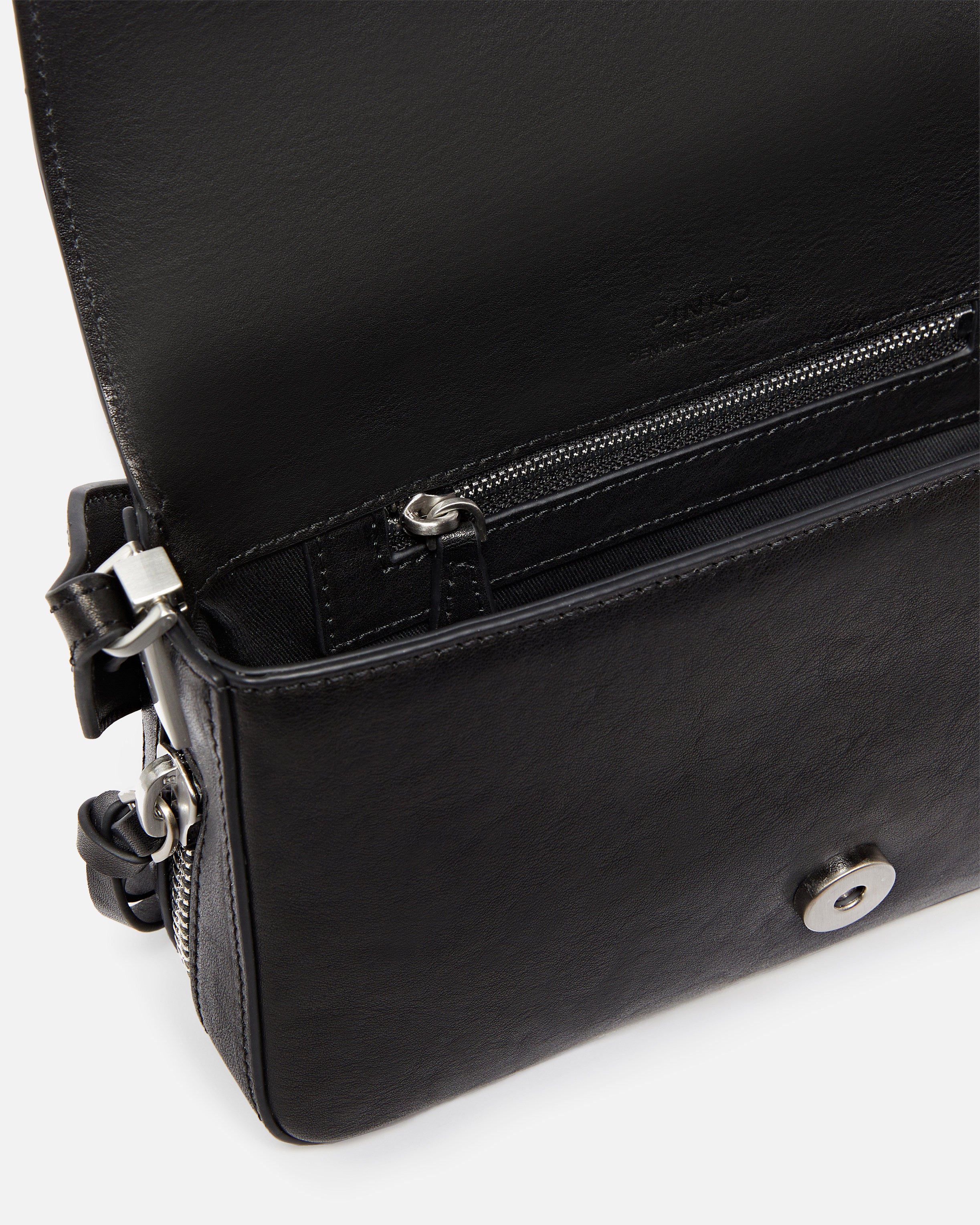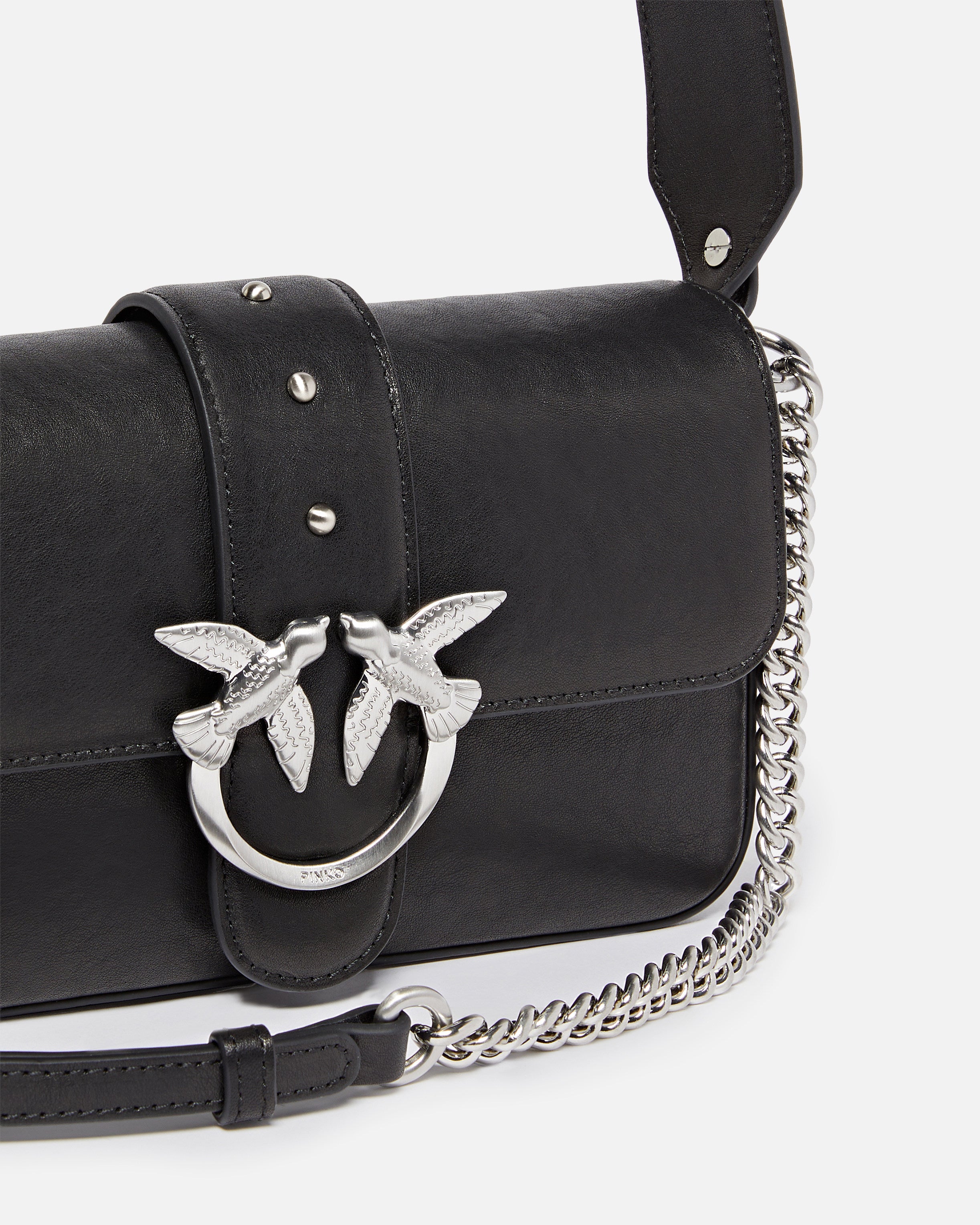 Biker-style Mini Love Bag Slouchy bag with a cotton lining and an inner zip pocket to keep your essentials safe. Complete with an adjustable leather shoulder strap and a chain strap with leather shoulder pad so it can be carried by hand, on the shoulder, or crossbody, the bag is extremely versatile and practical. The small studs and the metal zip that runs along the sides and bottom add a distinctive biker detail, while the Love Birds Diamond Cut buckle embodies the inimitable PINKO style. Activate your PINKO bag: verify the authenticity of your product and access a personalised experience by scanning the Love Birds embroidery on the back of the bag with your smartphone!