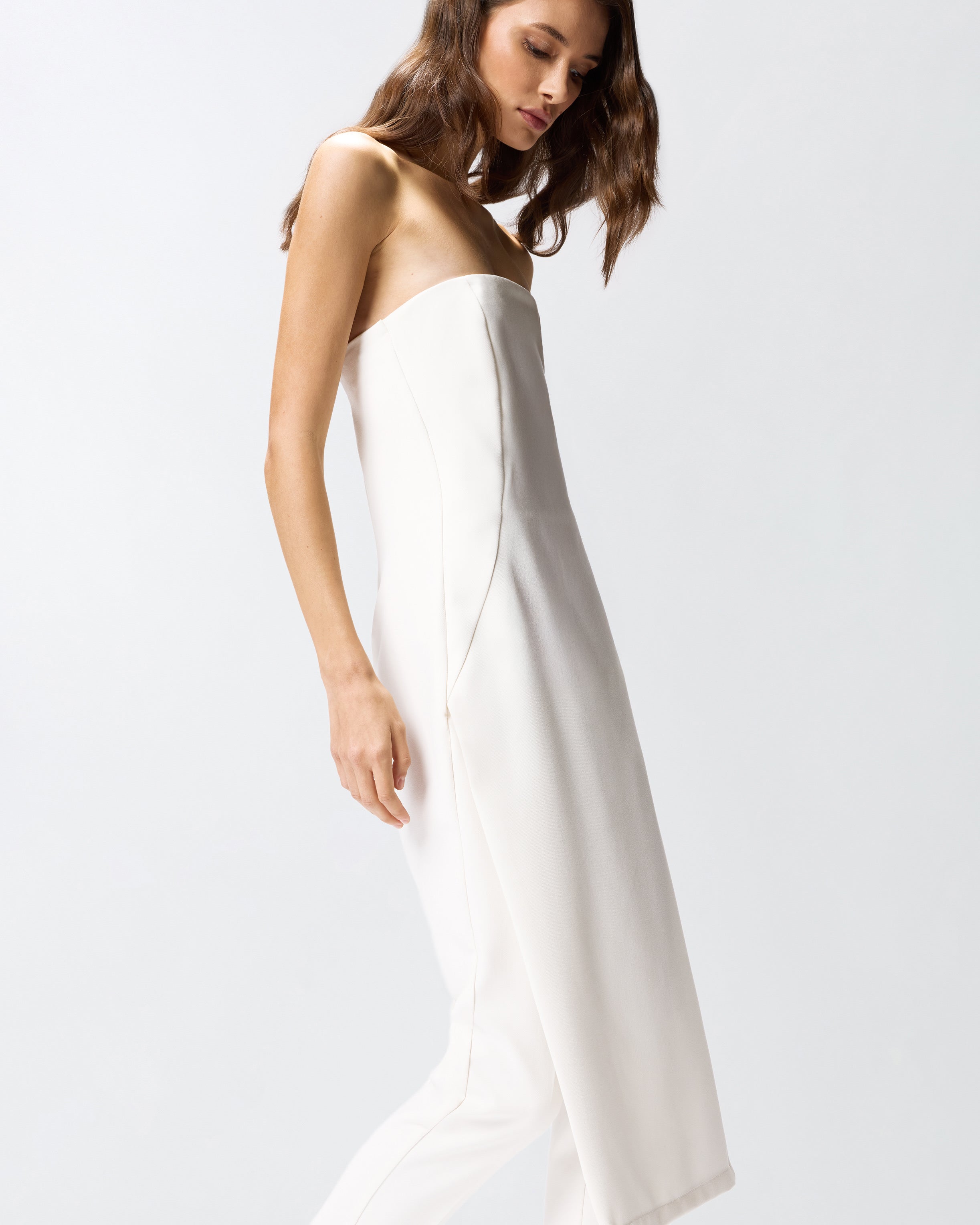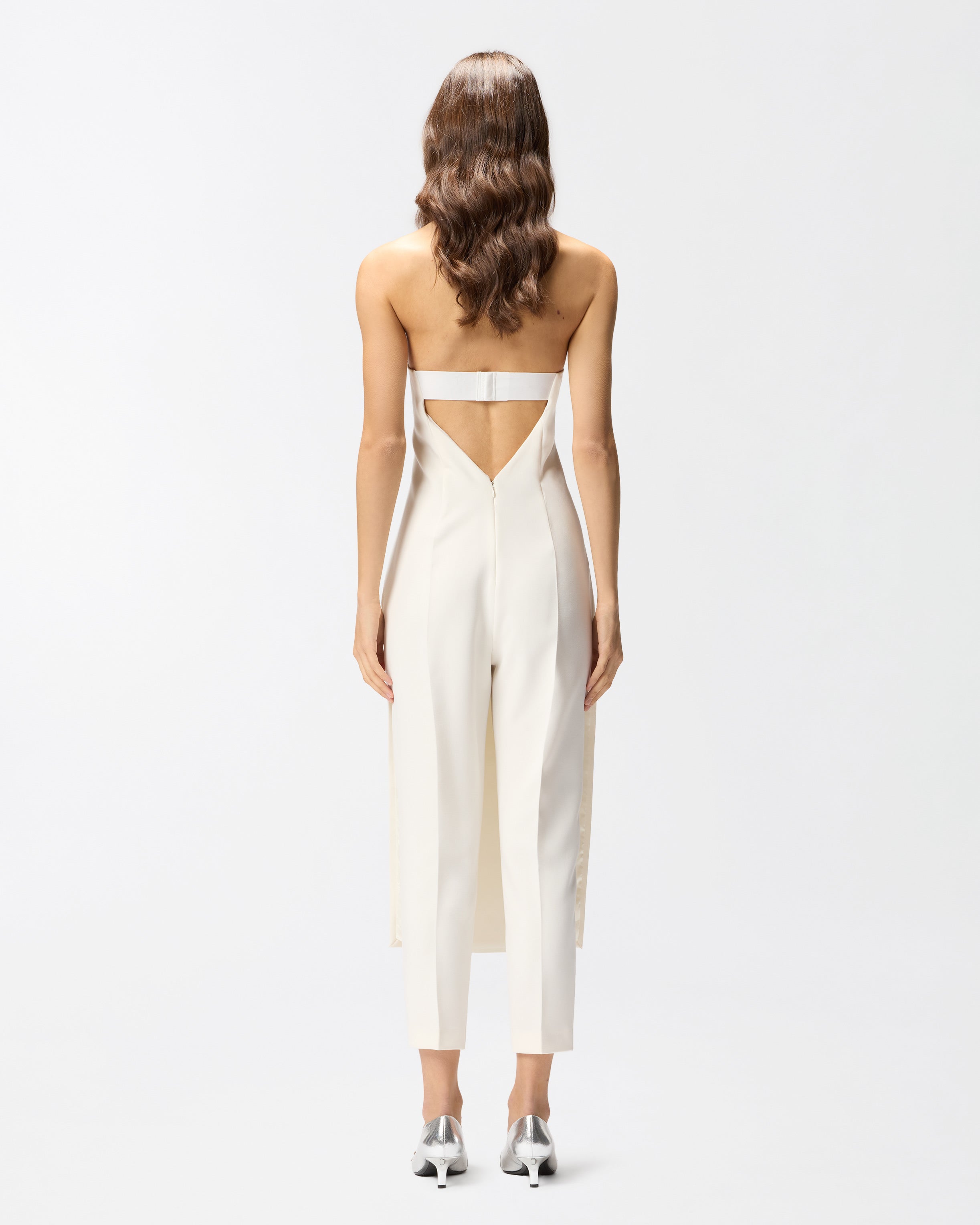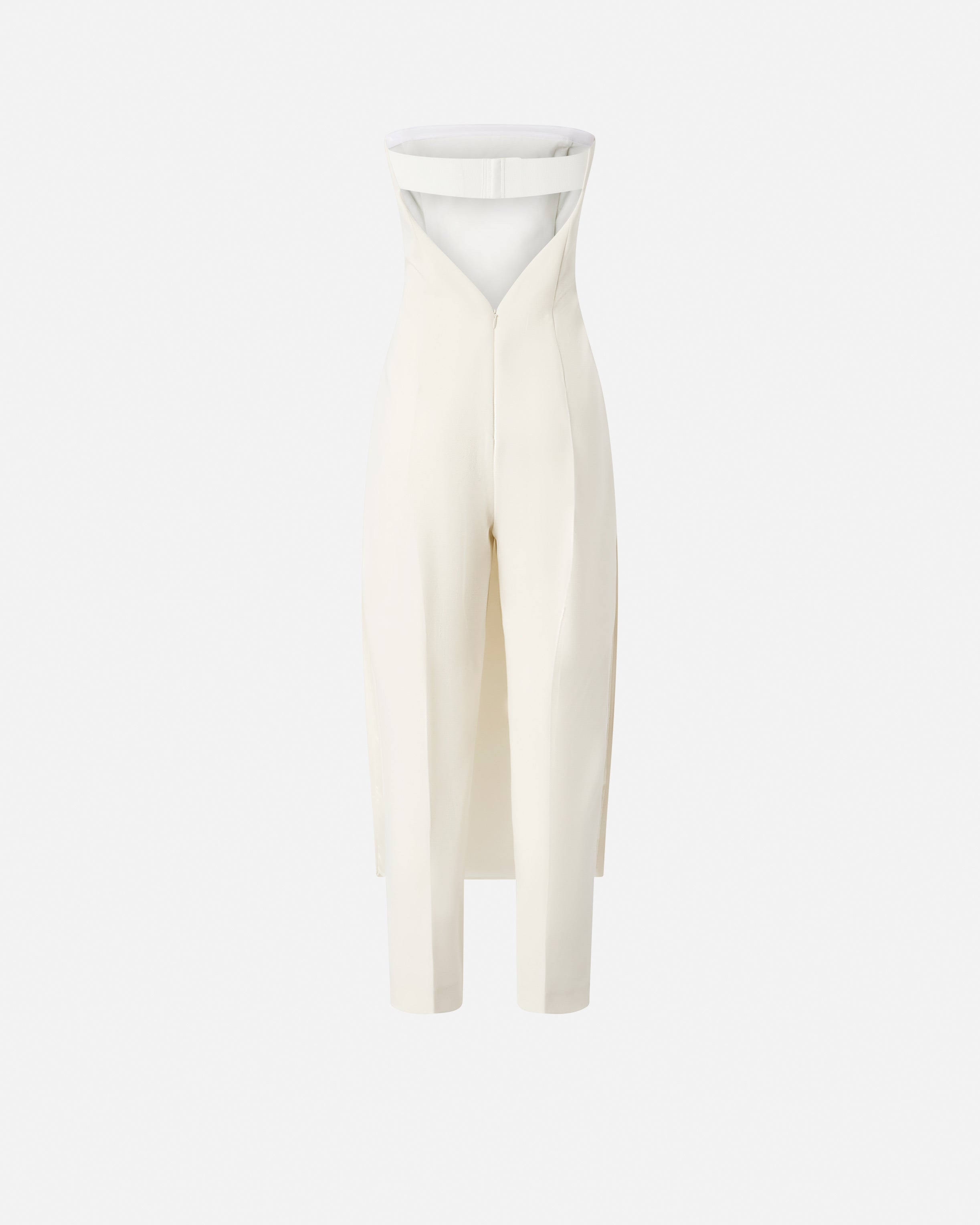 Sleeveless fitted one-piece jumpsuit with long trousers, featuring a front that simulates the effect of a skirt. The technical viscose fabric manages to combine softness and fluidity creating a sophisticated texture that offers optimal comfort and fit, without losing the structured look of the design. The trouser effect on the back is completed by an elasticated grosgrain opening on the back and zip. The clean and contemporary lines of the design are enriched by distinctive details, such as the slightly fenced effect and the cut-out detail on the back.