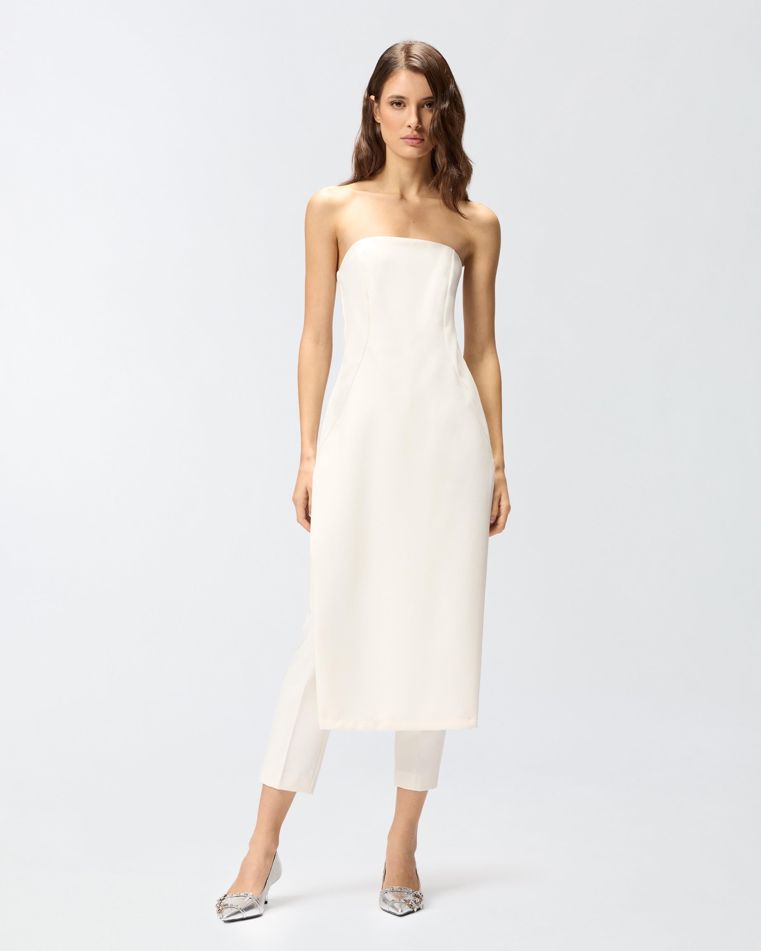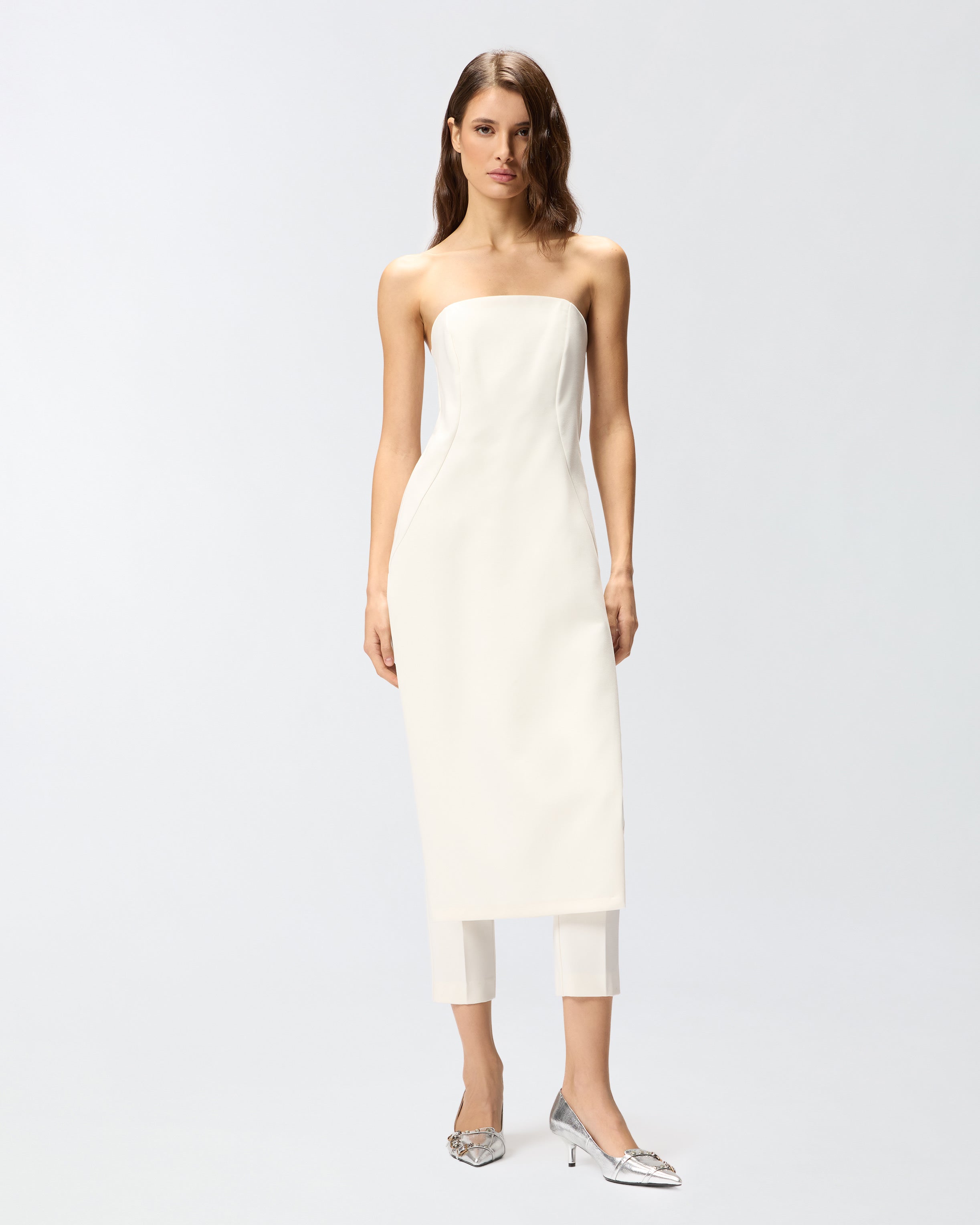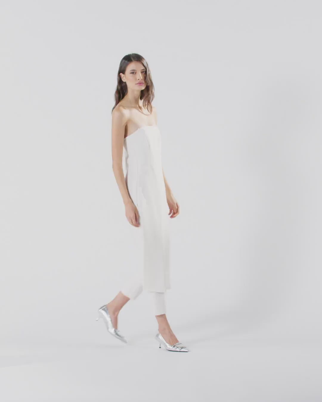 Sleeveless fitted one-piece jumpsuit with long trousers, featuring a front that simulates the effect of a skirt. The technical viscose fabric manages to combine softness and fluidity creating a sophisticated texture that offers optimal comfort and fit, without losing the structured look of the design. The trouser effect on the back is completed by an elasticated grosgrain opening on the back and zip. The clean and contemporary lines of the design are enriched by distinctive details, such as the slightly fenced effect and the cut-out detail on the back.