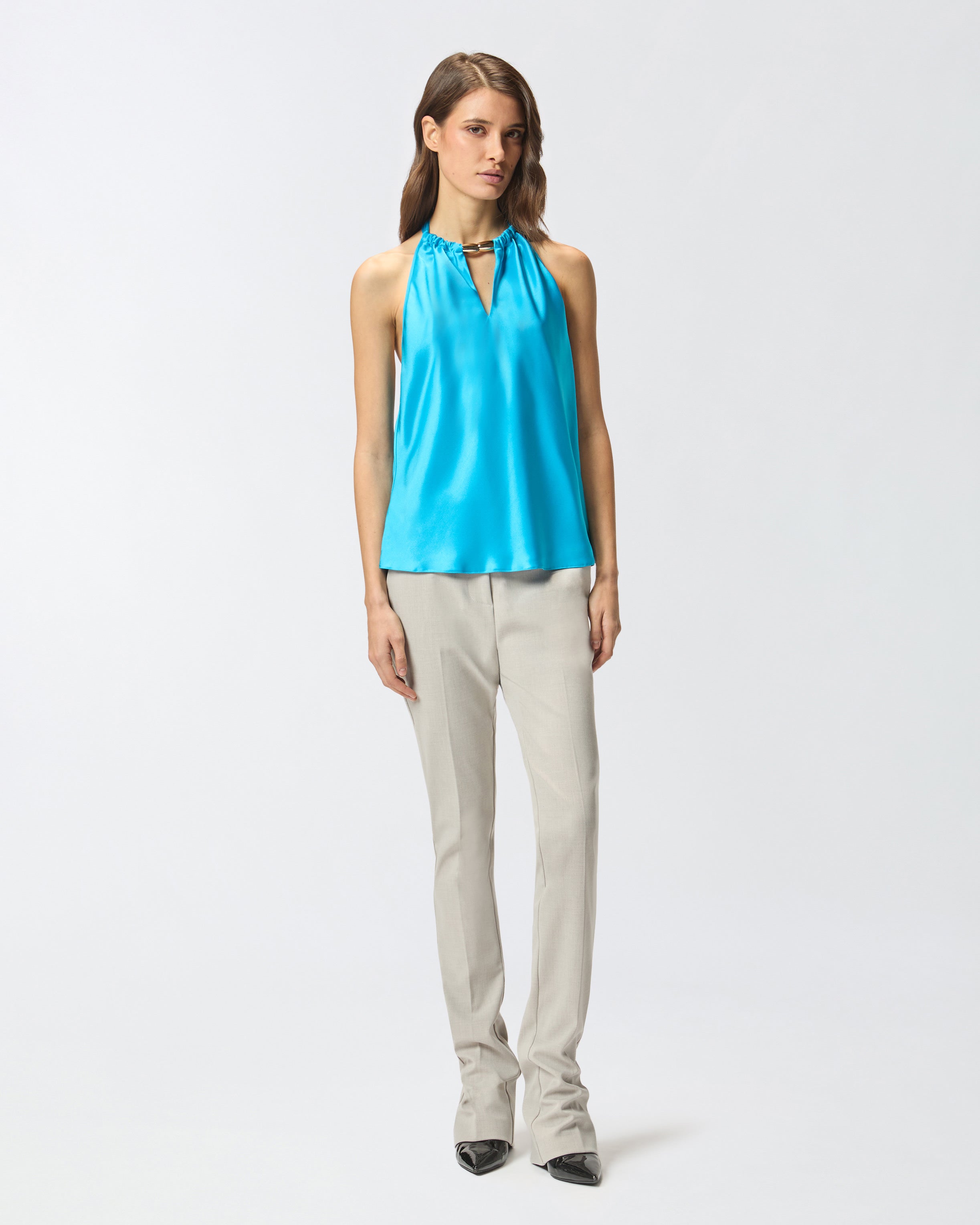 Loose-fit sleeveless top with a halterneck embellished with metal spheres. A touch of sensuality is provided by the bared back, which is caressed by the sash tie on the neck that falls free, creating movement. The shiny satin gives the piece unique shimmer and a particularly soft hand. Wear this top for a fluid, slinky effect that elegantly enhances the lines with sophistication and the feminine silhouette.