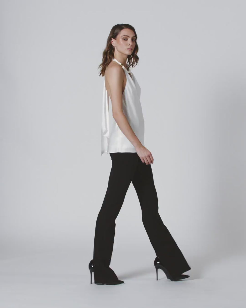 Loose-fit sleeveless top with a halterneck embellished with metal spheres. A touch of sensuality is provided by the bared back, which is caressed by the sash tie on the neck that falls free, creating movement. The shiny satin gives the piece unique shimmer and a particularly soft hand. Wear this top for a fluid, slinky effect that elegantly enhances the lines with sophistication and the feminine silhouette.