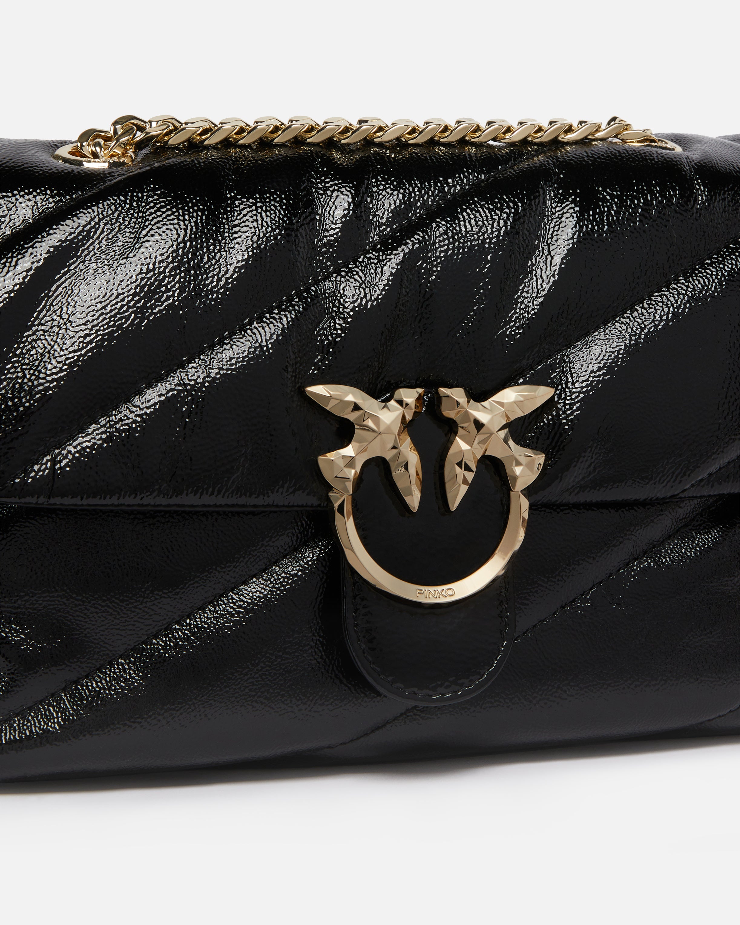 Elegant Love Bag Puff crossbody bag, featuring the iconic slanted quilting that makes it soft and supple, crafted from glossy patent leather with a distinctive wavy texture. The bag is complemented by a sliding metal chain strap with pad, which allows the bag to be worn on the shoulder, by doubling the strap. The fastening is finished with the metal buckle featuring the Love Birds Diamond Cut logo with special faceted three-dimensional effect. The fabric-lined interior features a zipped centre pocket that divides the bag into two compartments. The bag is part of the Limited Edition special capsule collection which comprises PINKO Galleria-exclusive limited-edition models. Use the special NFC chip to enjoy a special experience, specific to the bag you have just bagged!