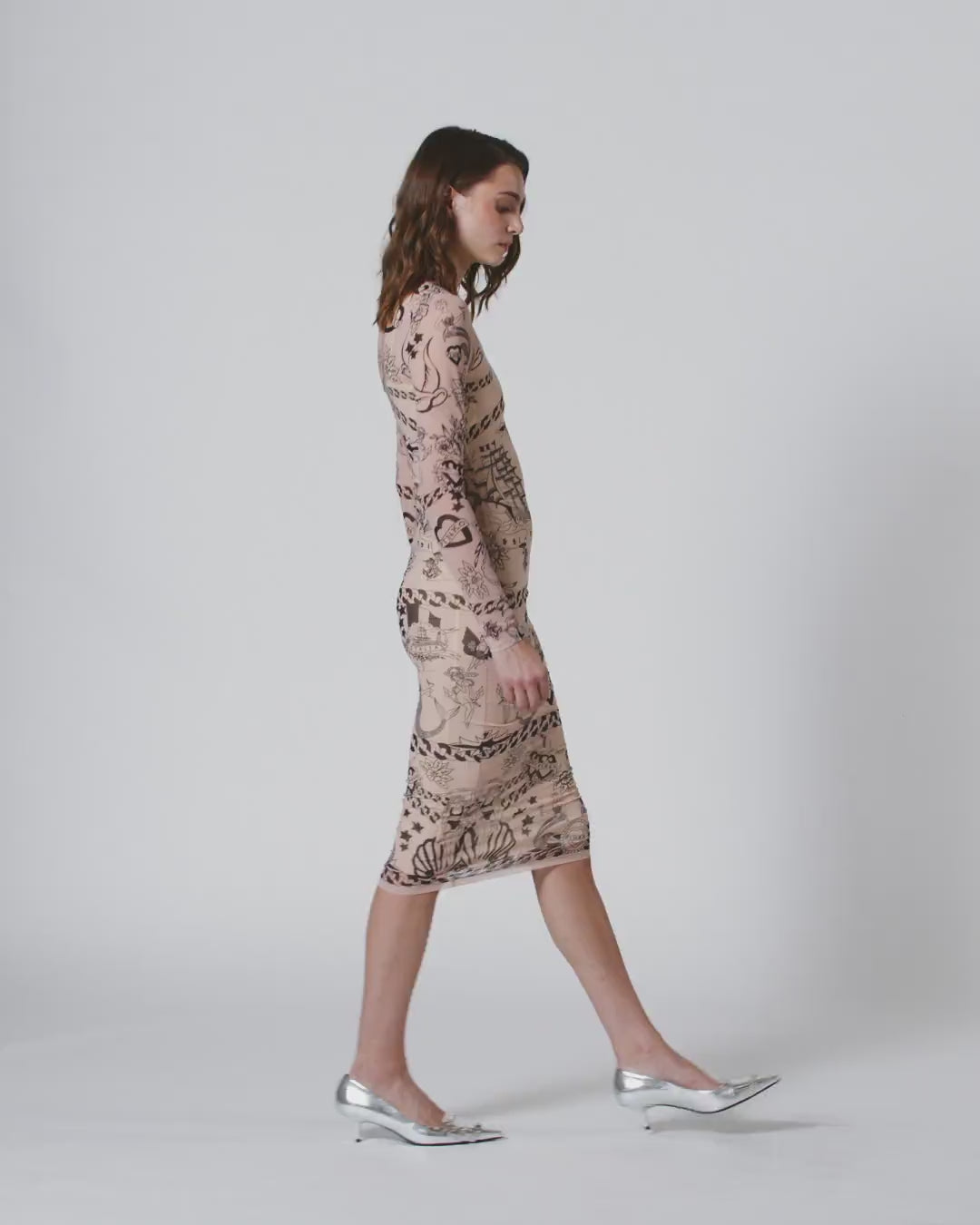 Tulle midi dress distinguished by a fitted line, a round-neck and long sleeves. The run-resistant mesh is a very durable fabric that has undergone special treatment to prevent the stitching from unravelling when torn. The placed print that adorns the piece, on the other hand, is inspired by the sailing world and attests to PINKO's skill with different fabrics and complex manufacturing techniques. Comes with a matching slip to be worn underneath to counteract the see-through effect of the fabric.