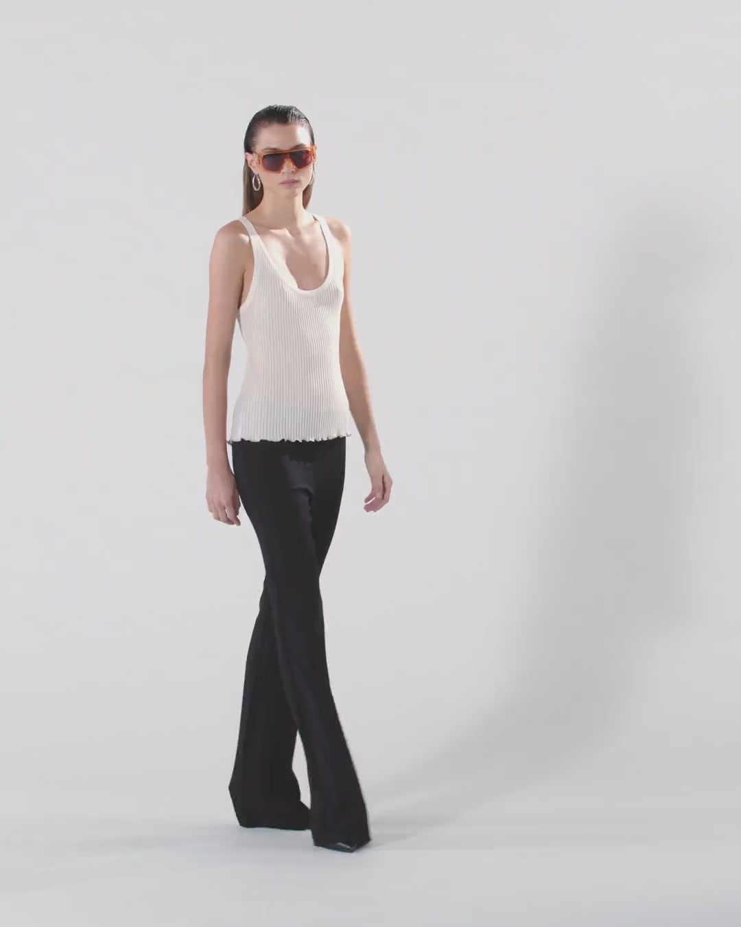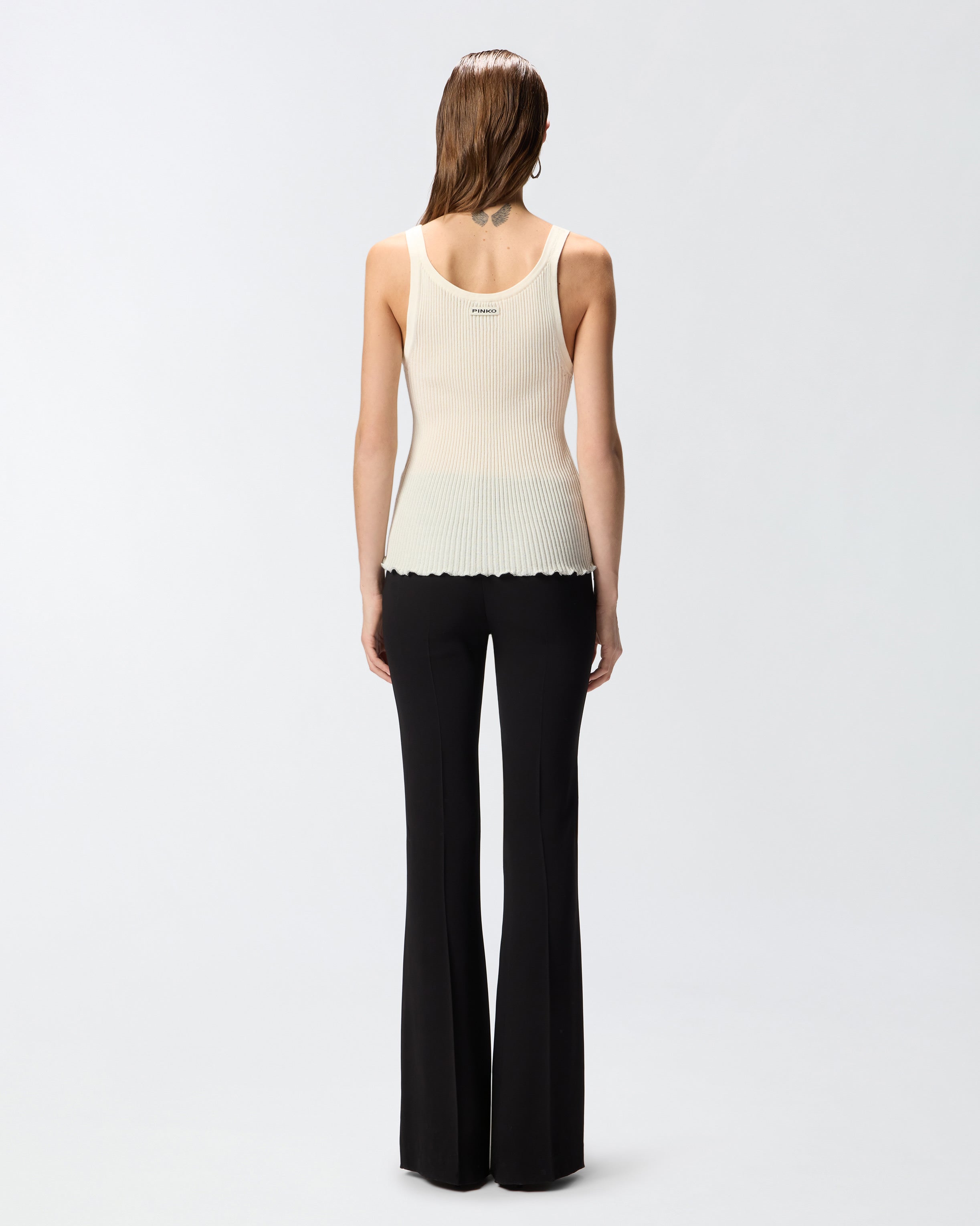 V-neck vest top in ribbed cotton-blend crepe. This garment features a gathered bottom hem embellished with small metallic spheres that create a refined interplay between the matte finish of the fabric and the sheen of the metal. The final touch is given by the label with PINKO logo lettering on the back. Pair this top with pieces in the same colour for a comfy and original head-to-toe look during your free time.