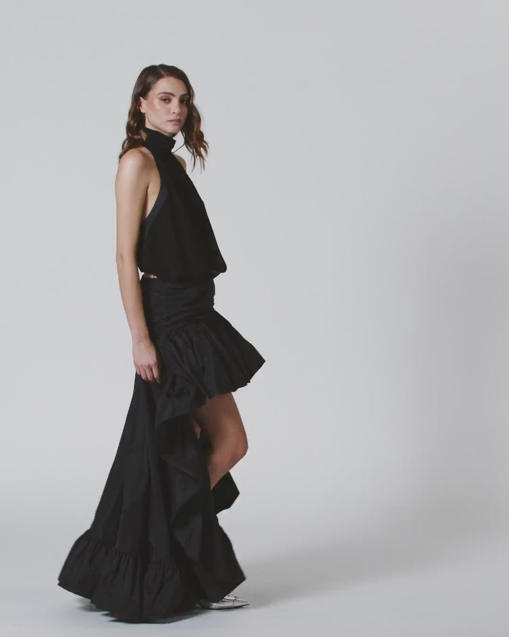 Skirt made of taffeta, short on the front and longer on the back. The asymmetrical cut and trimmed by the ruffles creates a dramatic effect, accentuated even by the slightly ruched fabric. The material is light and shiny and goes perfectly with the dynamic volume that distinguishes the garment. This elegant skirt will accompany you with a bold and feminine touch on your special occasions, in an outfit that cannot go unnoticed.