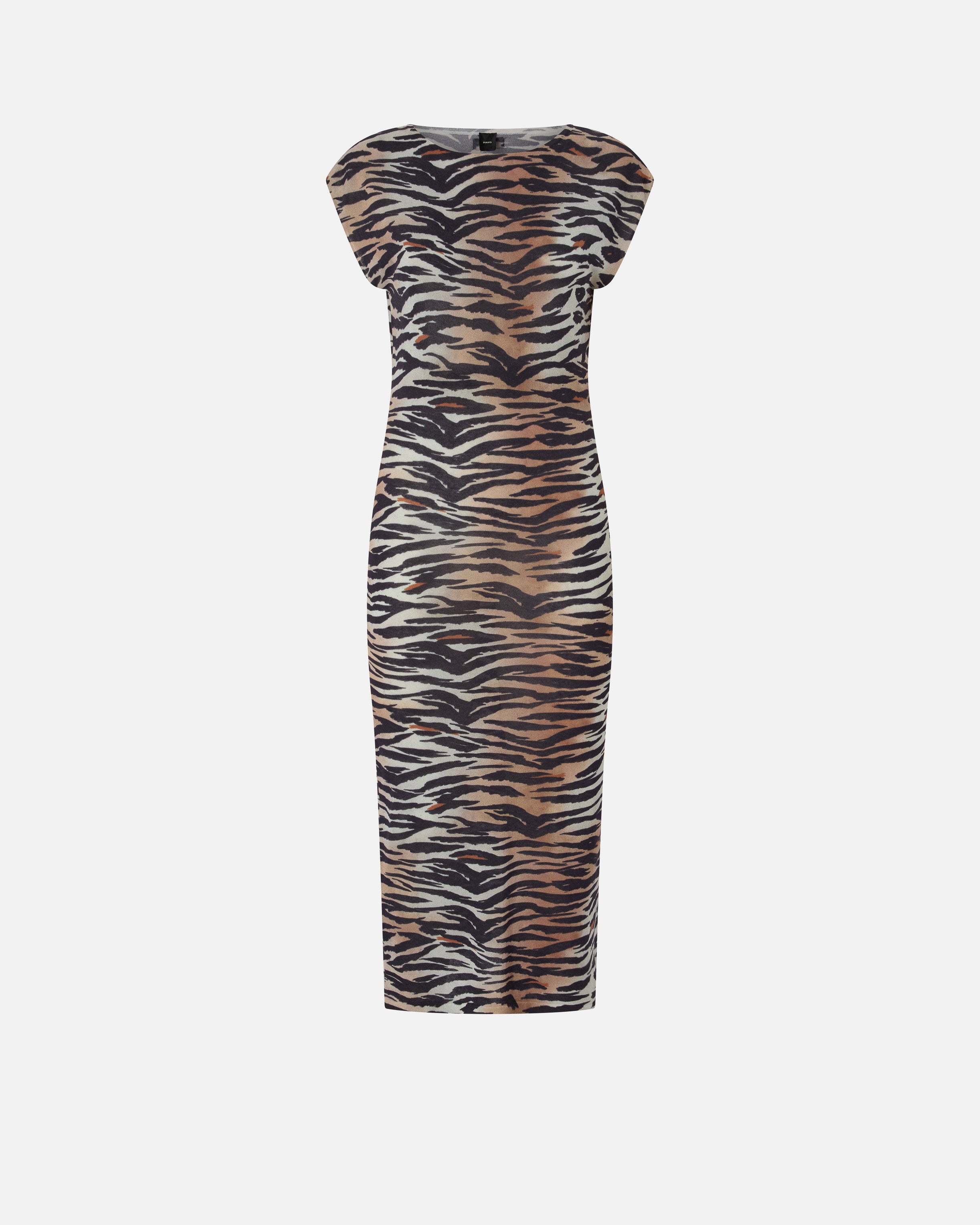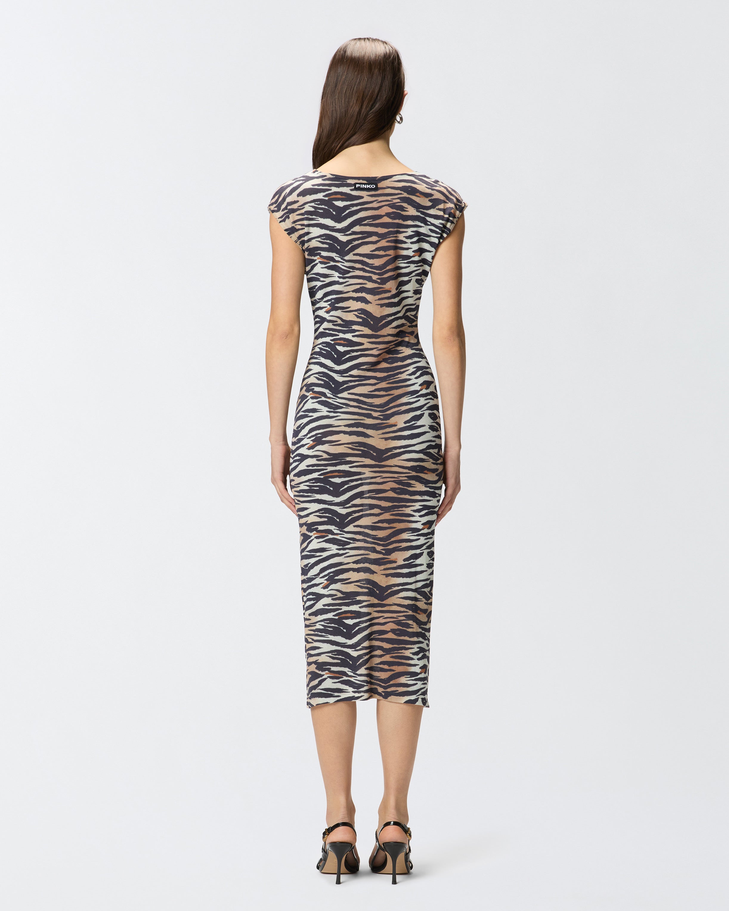Slim-fitting sheath midi dress in cotton-blend fabric with cap sleeves, round neck and distinctive, seductive tiger print with fade effect. Here, the feminine shape and edgy pattern deliver the perfect blend of comfort and personality and make this dress a must-have for those who like to stand out in bold style. This model is complete with a label featuring the PINKO logo lettering on the back. - EPICENTRO DRESS