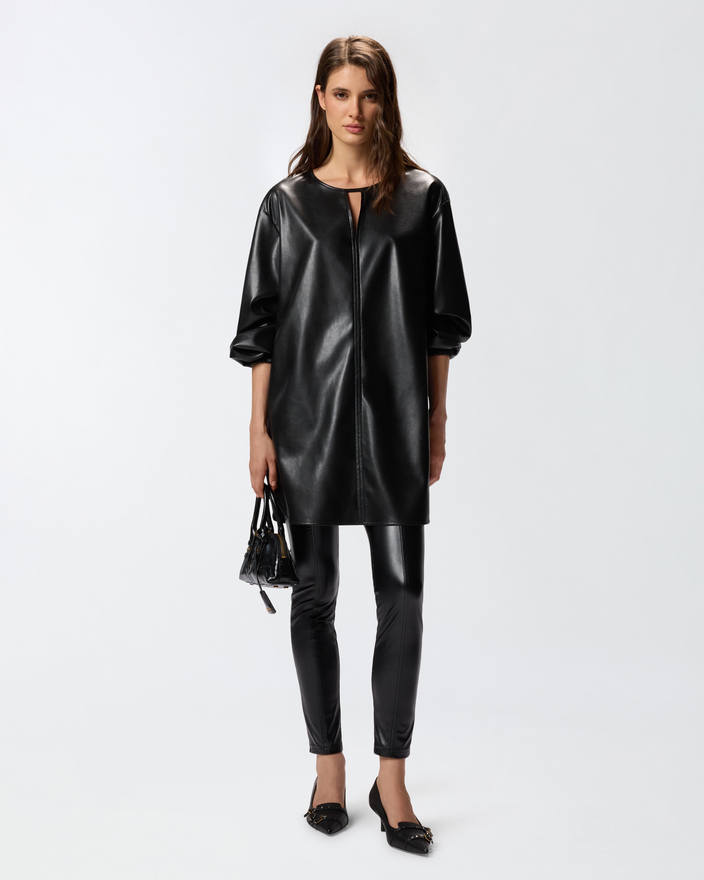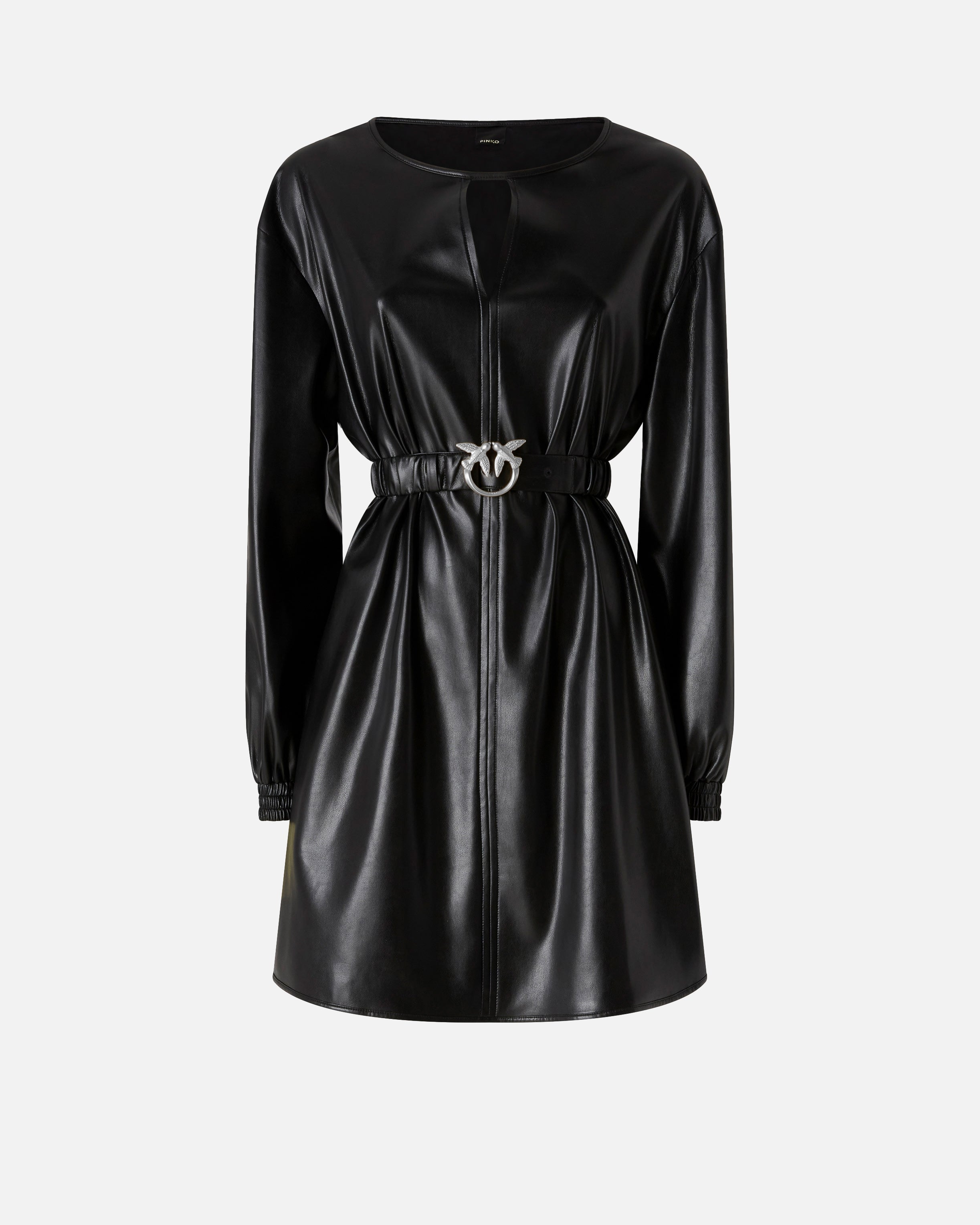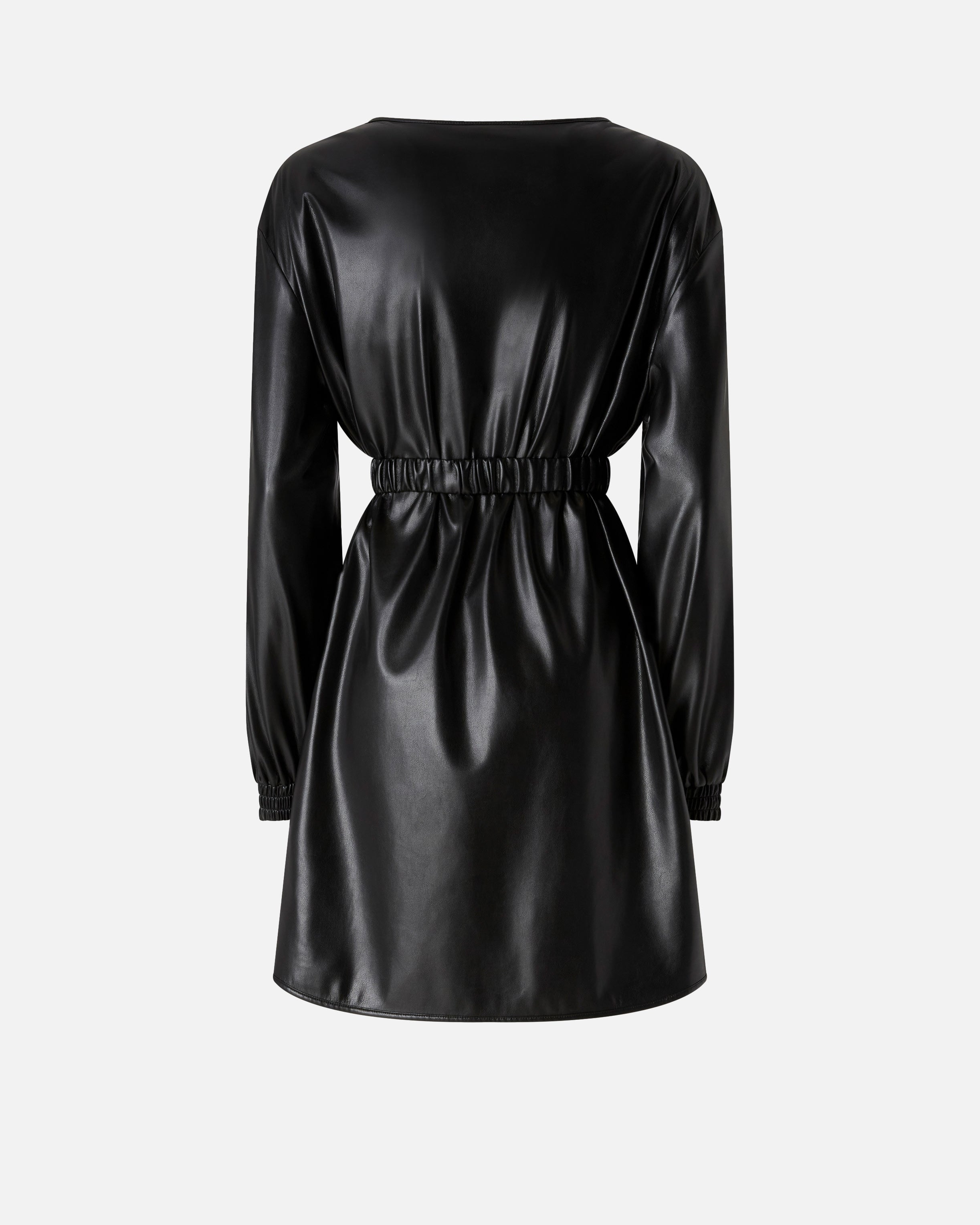 Short round-neck dress defined by a V-shaped opening on the front and long loose sleeves with dropped shoulders and stretch cuffs. The dress is made from a faux leather coated fabric with a soft feel and a bold, contemporary finish. This fitted style is more cinched on the sides. Complete with a matching-fabric belt with the metal Love Birds Diamond Cut buckle.