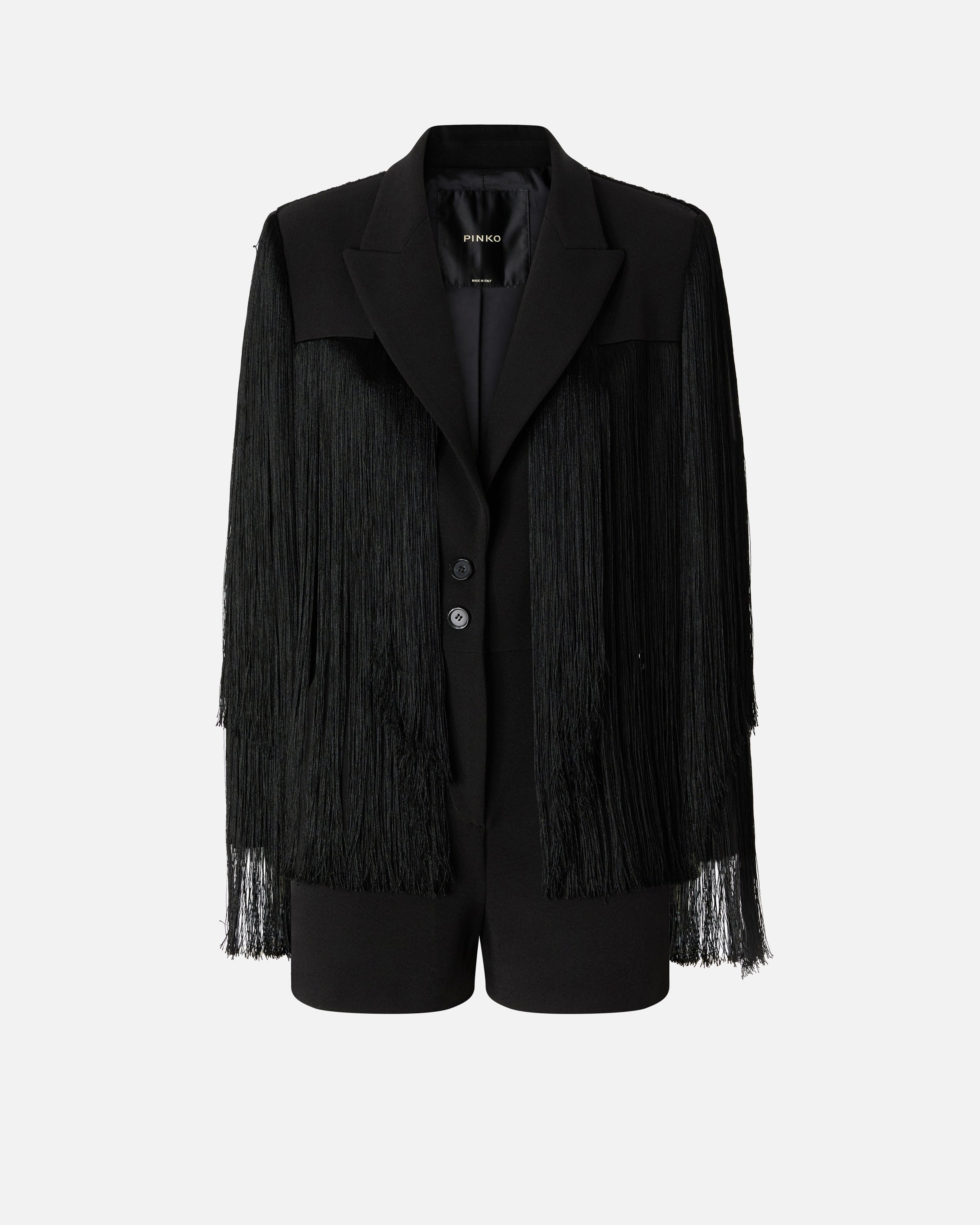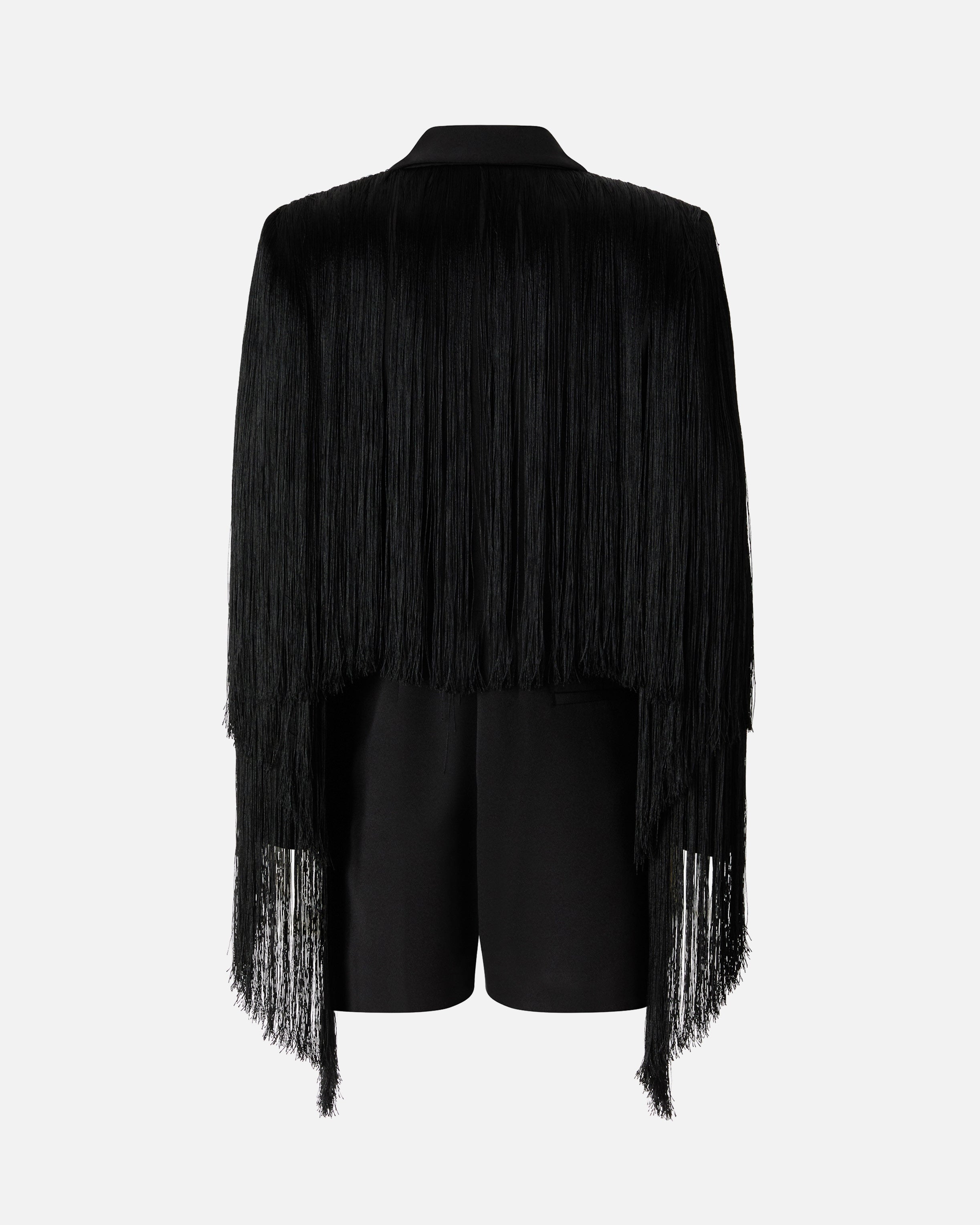 This playsuit is made of cady fabric with a refined matte appearance and a light, fluid texture, perfect for a flawless look, and equipped with an inner lining to ensure greater comfort when worn. The style embodies the perfect combination of sophisticated allure, expressed by the jacket-inspired upper part with tailored lapels, and contemporary design, created by the silhouette with shorts and the long, thin fringes that fall on the torso and sleeves that naturally follow your movements. This playsuit, which is easy to put on thanks to the convenient single-breasted two-button fastening on the torso and the small zip that starts at the centre of the waist of the shorts, will give you a vibrant and refined total look, ideal for special evenings and the most exclusive parties where you don't want to go unnoticed. - ORZO JUMPSUIT