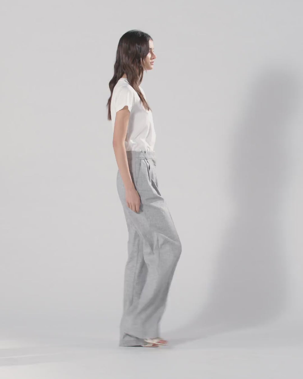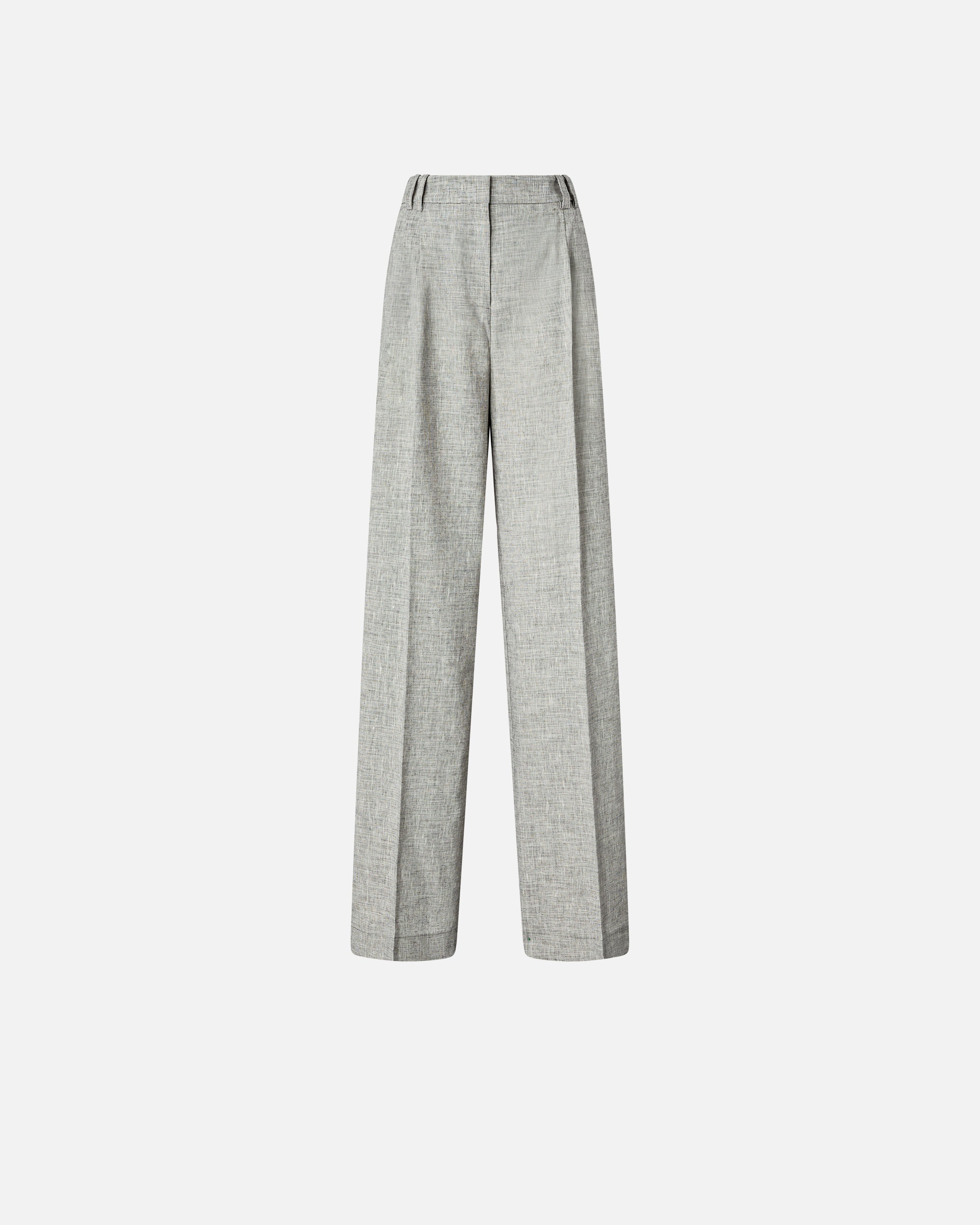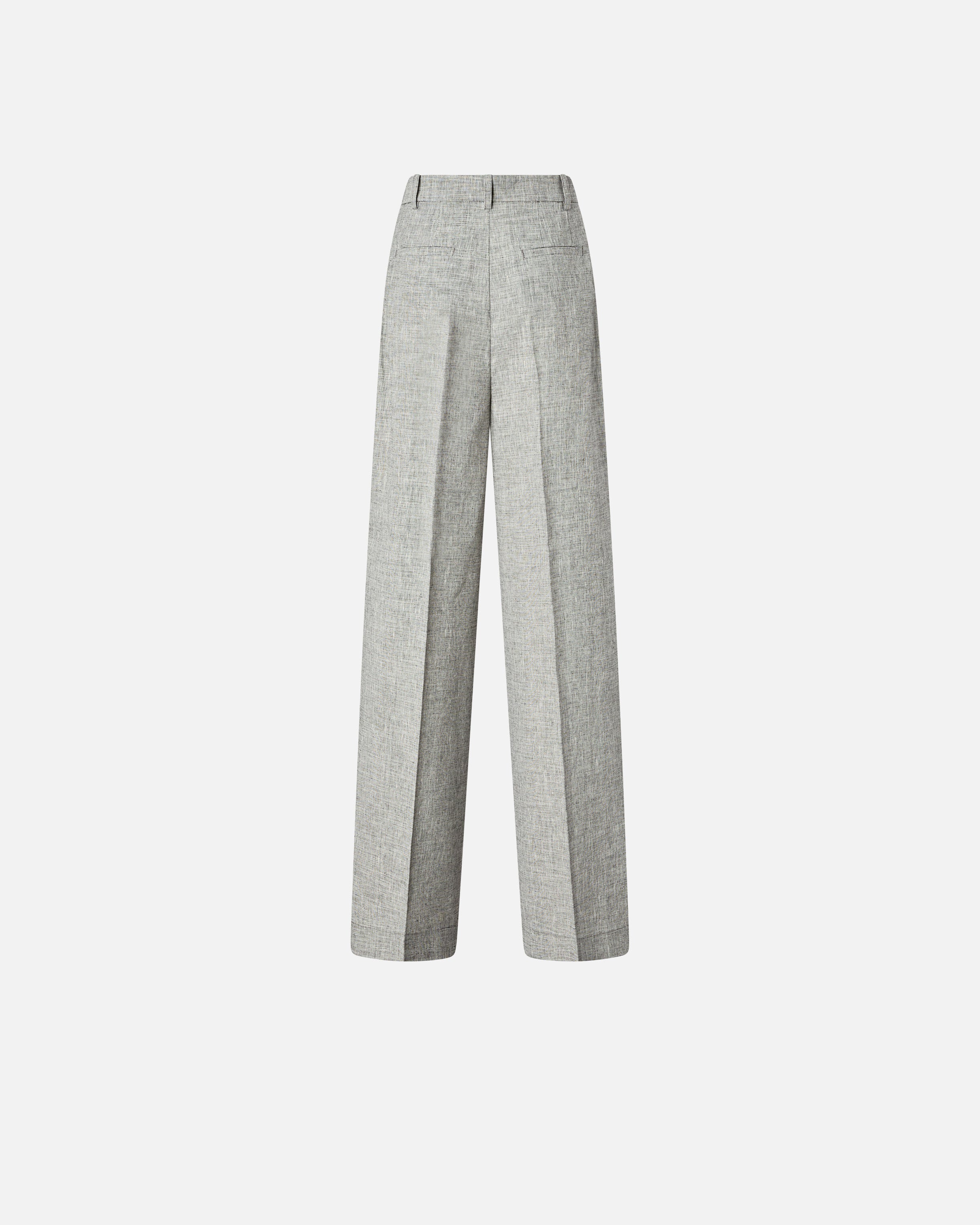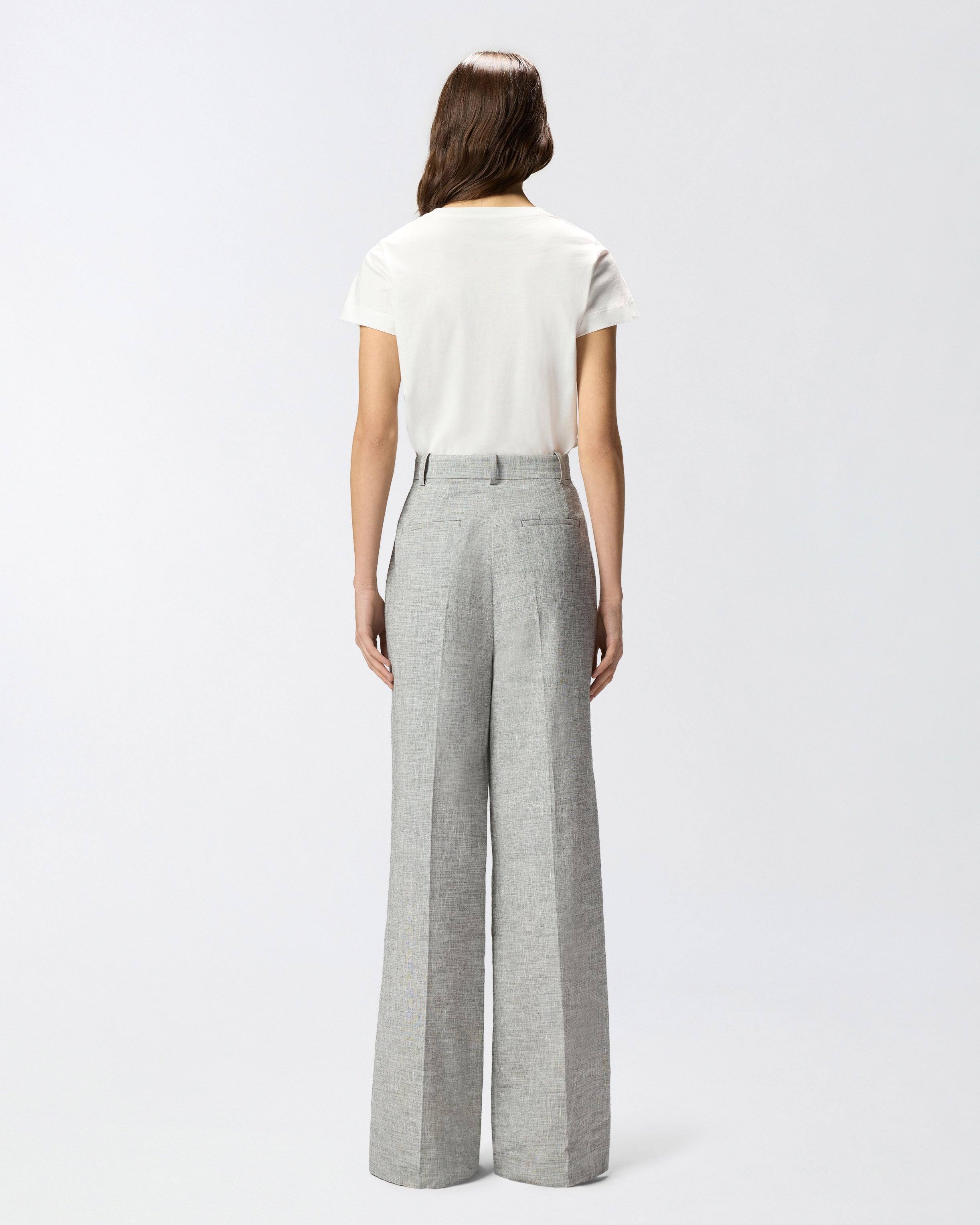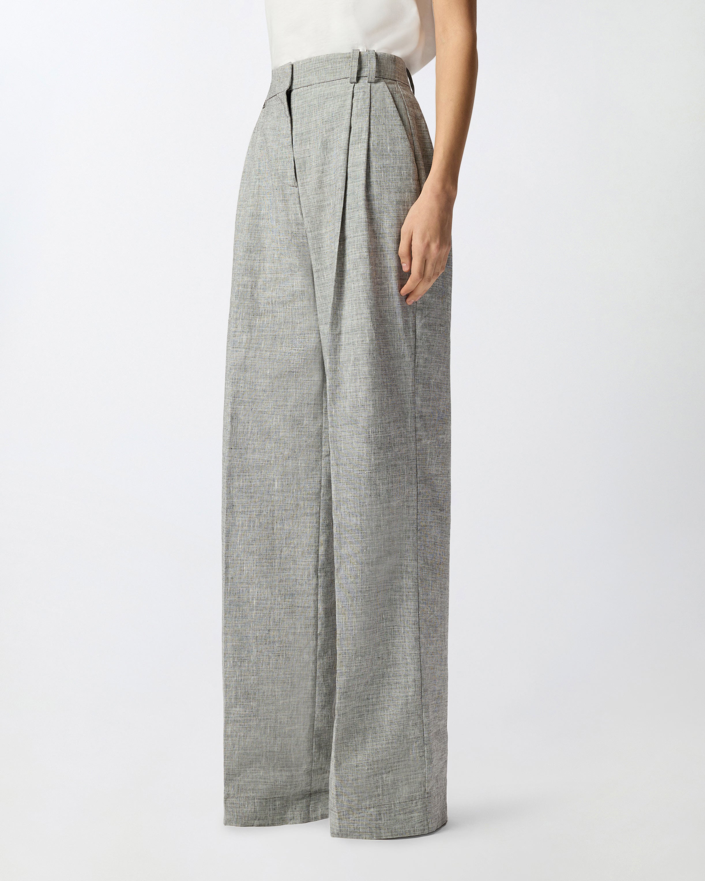 Trousers in yarn-dyed fil-à-fil cotton- and linen-blend slub fabric with slightly irregular and mottled texture that creates a refined two-tone optical effect. This garment features a straight-leg design with pressed pleats down the middle, two welt pockets on the back, belt loops and elegant concealed front fastening. Understated and contemporary, this model will become a real all-purpose staple in your wardrobe.