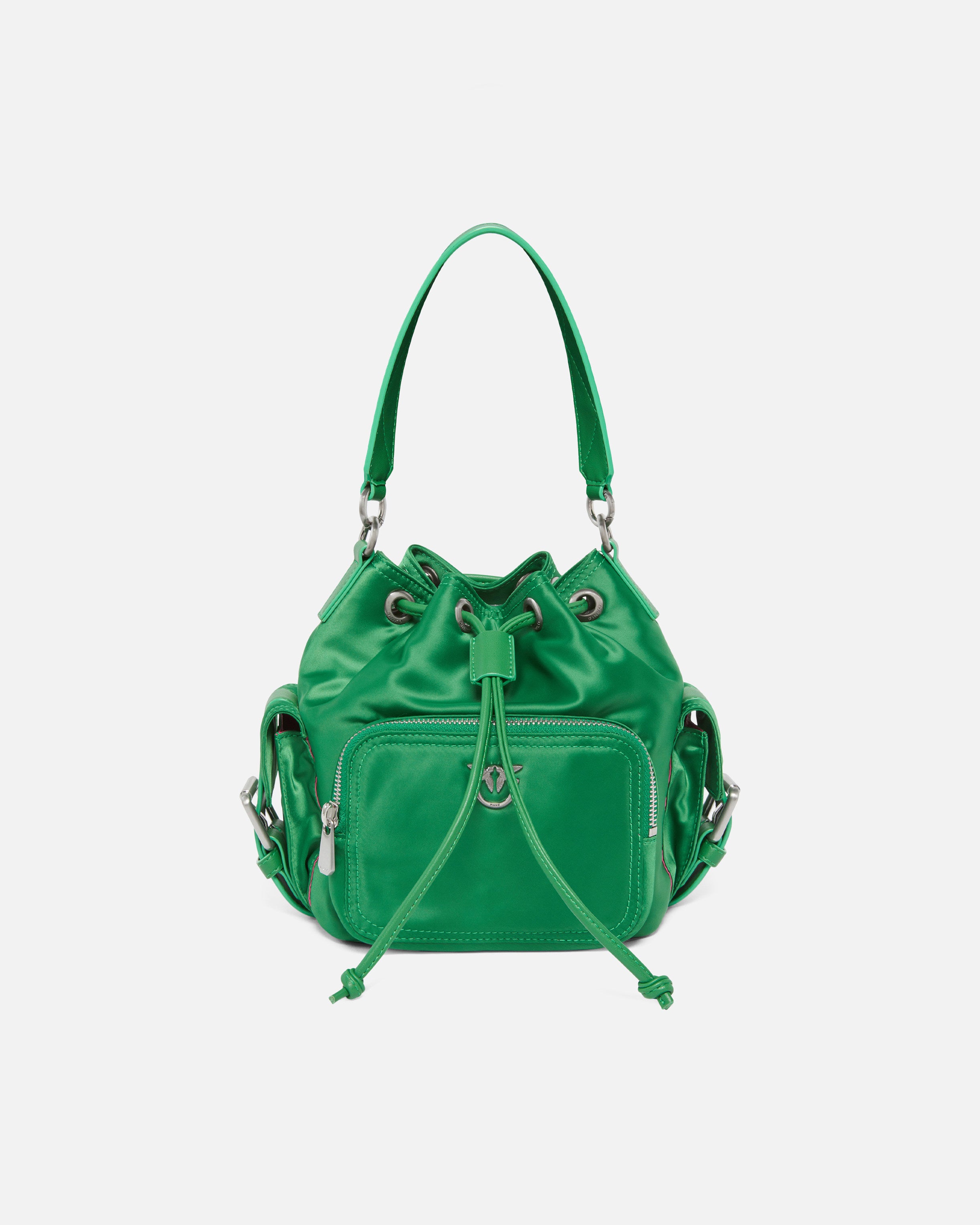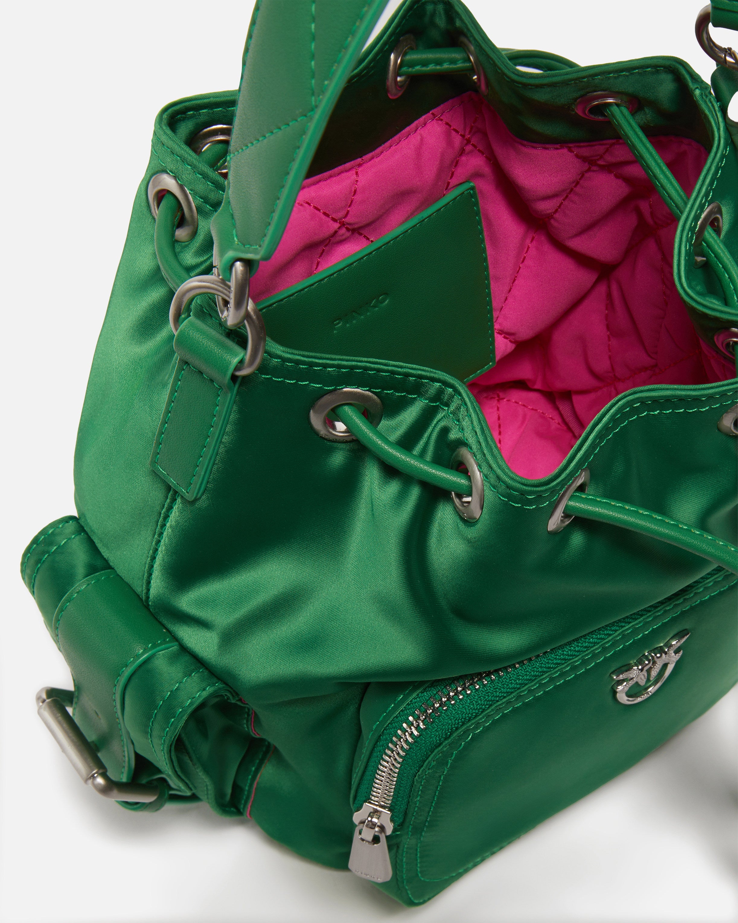 Classic bucket bag made from durable nylon satin with a refined shiny effect. This mini bucket bag features two side gusset pockets with flap and buckle and a front zip pocket embellished with the Love Birds Diamond Cut logo. The model features a top fastening with adjustable drawstring, and a removable and interchangeable handle and shoulder strap for two ways of carrying: on the shoulder or crossbody. The inside of the bag, lined with technical fabric and expertly quilted, features the embossed PINKO lettering logo tag. Activate your PINKO bag: verify the authenticity of your product and access a personalised experience by scanning the Love Birds embroidery on the back of the bag with your smartphone!