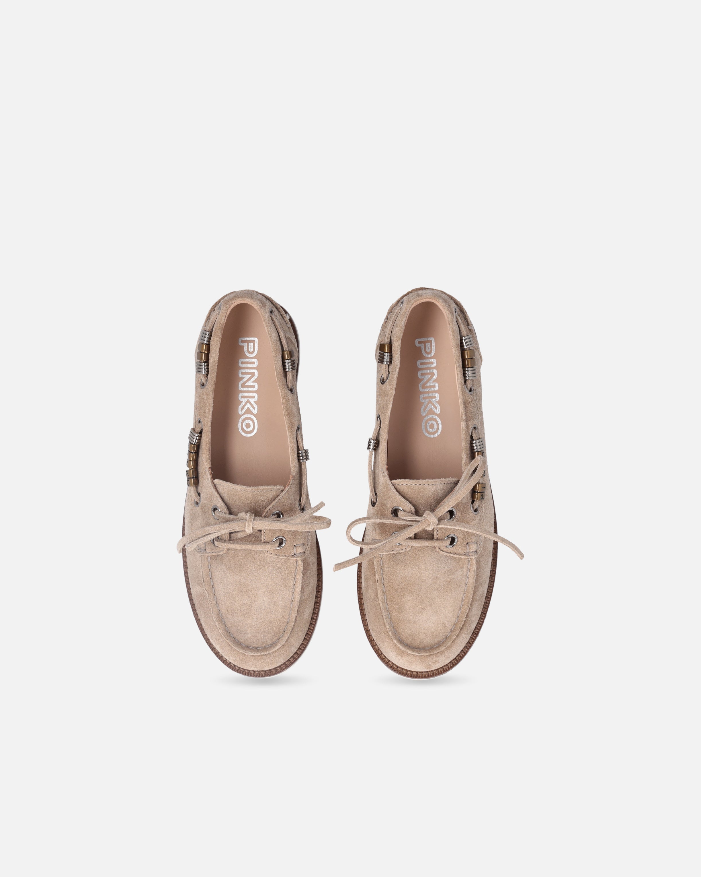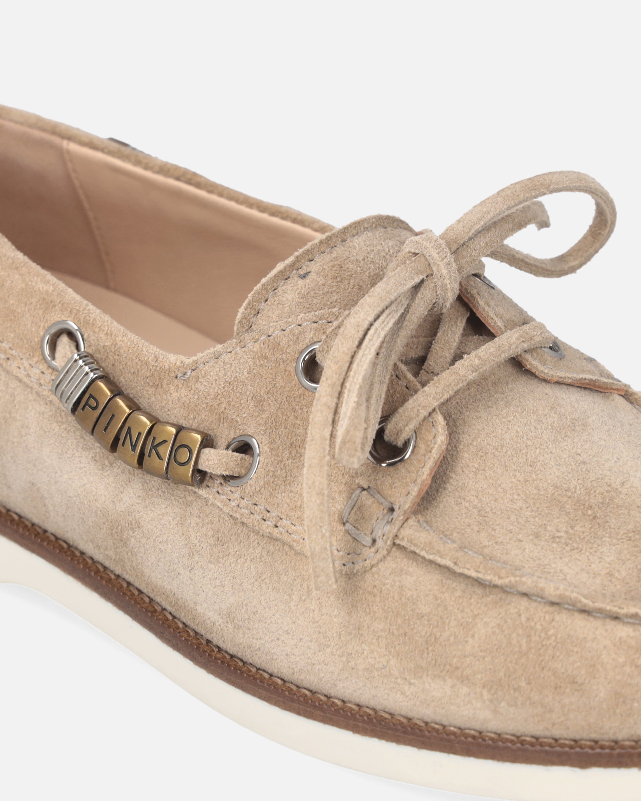 A reinterpretation of the boat shoe style with an urban and refined touch, these moccasins are made of Italian suede leather, synonymous with quality and tradition. The design is enhanced by pinched detailing on the vamp, an artisanal technique that highlights the hand-stitching and gives the shoe an authentic, distinctive look. Metallic details on the side laces, including gold rings forming the PINKO logo lettering, add shine and character, while the crepe-effect rubber sole ensures comfort and flexibility. The model you were looking for to complete your everyday outfits with a casual and contemporary elegance.