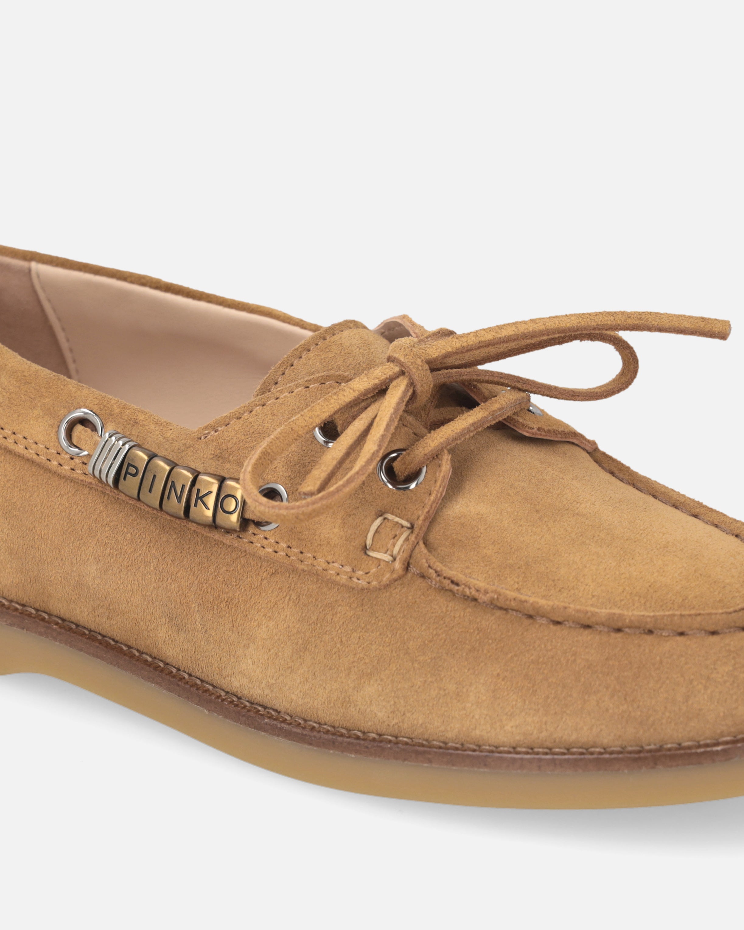 A reinterpretation of the boat shoe style with an urban and refined touch, these moccasins are made of Italian suede leather, synonymous with quality and tradition. The design is enhanced by pinched detailing on the vamp, an artisanal technique that highlights the hand-stitching and gives the shoe an authentic, distinctive look. Metallic details on the side laces, including gold rings forming the PINKO logo lettering, add shine and character, while the crepe-effect rubber sole ensures comfort and flexibility. The model you were looking for to complete your everyday outfits with a casual and contemporary elegance.
