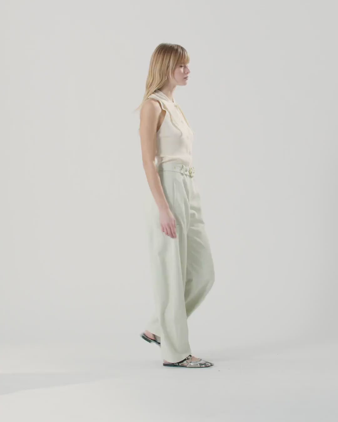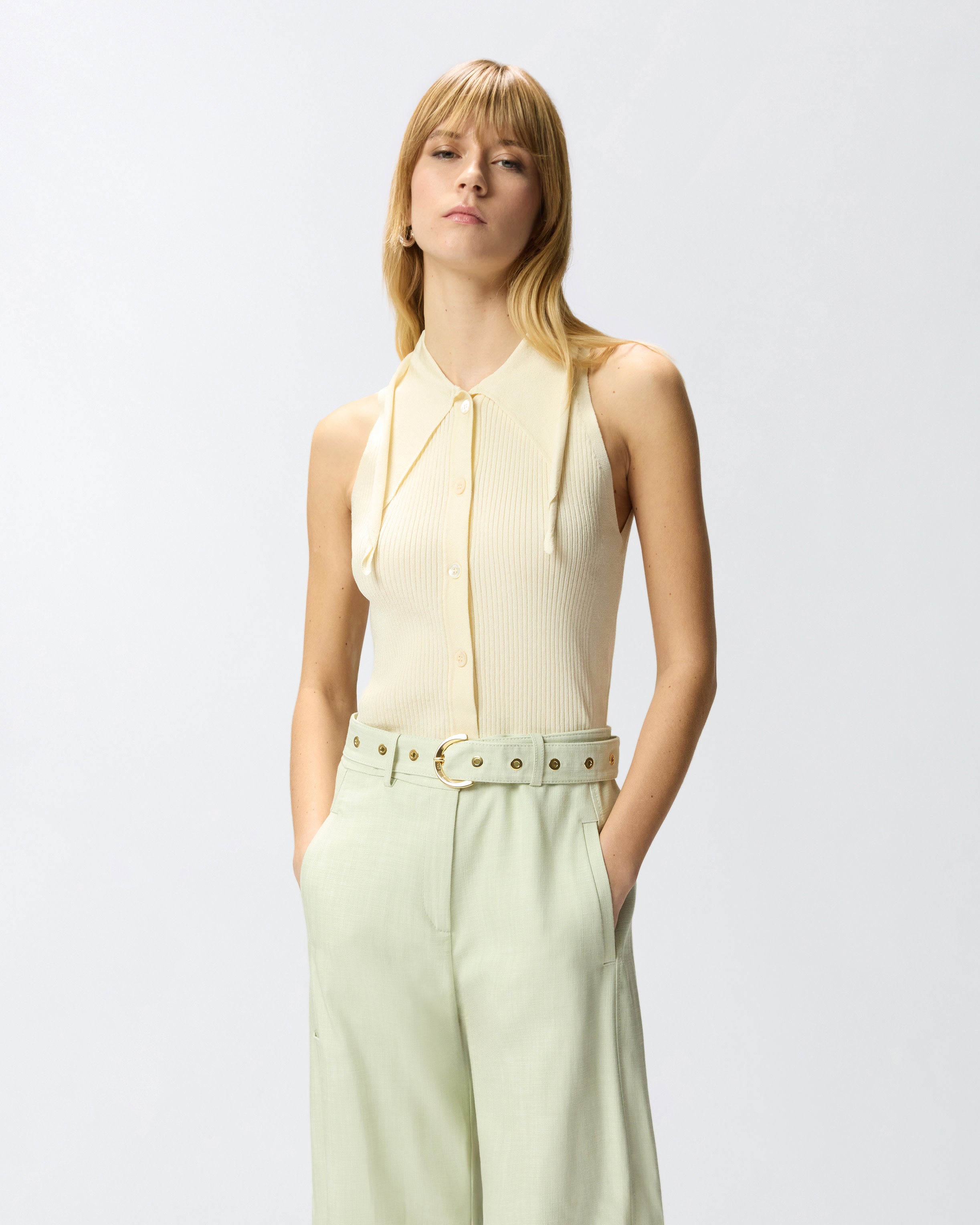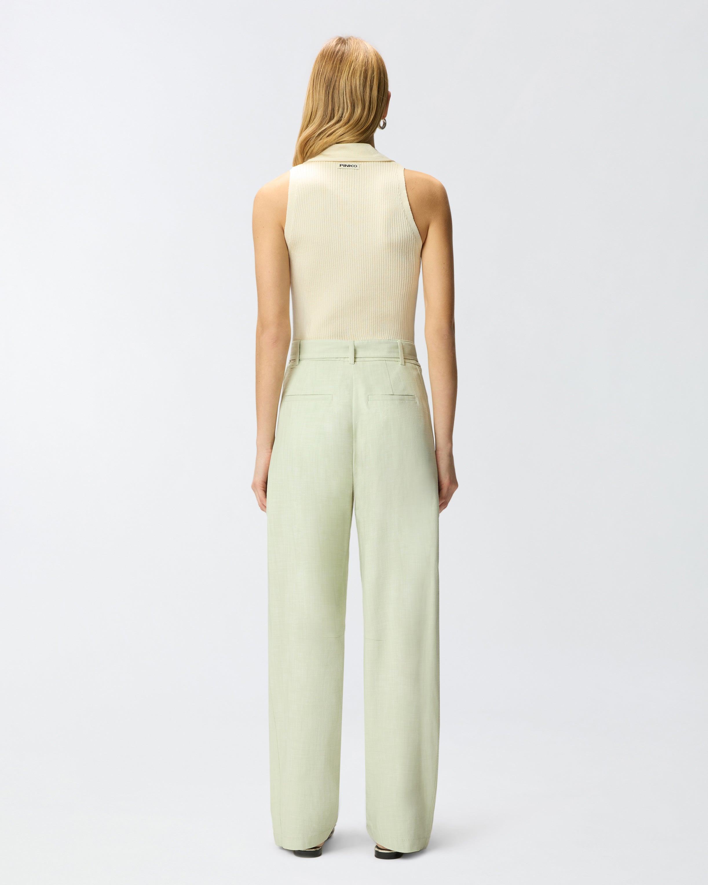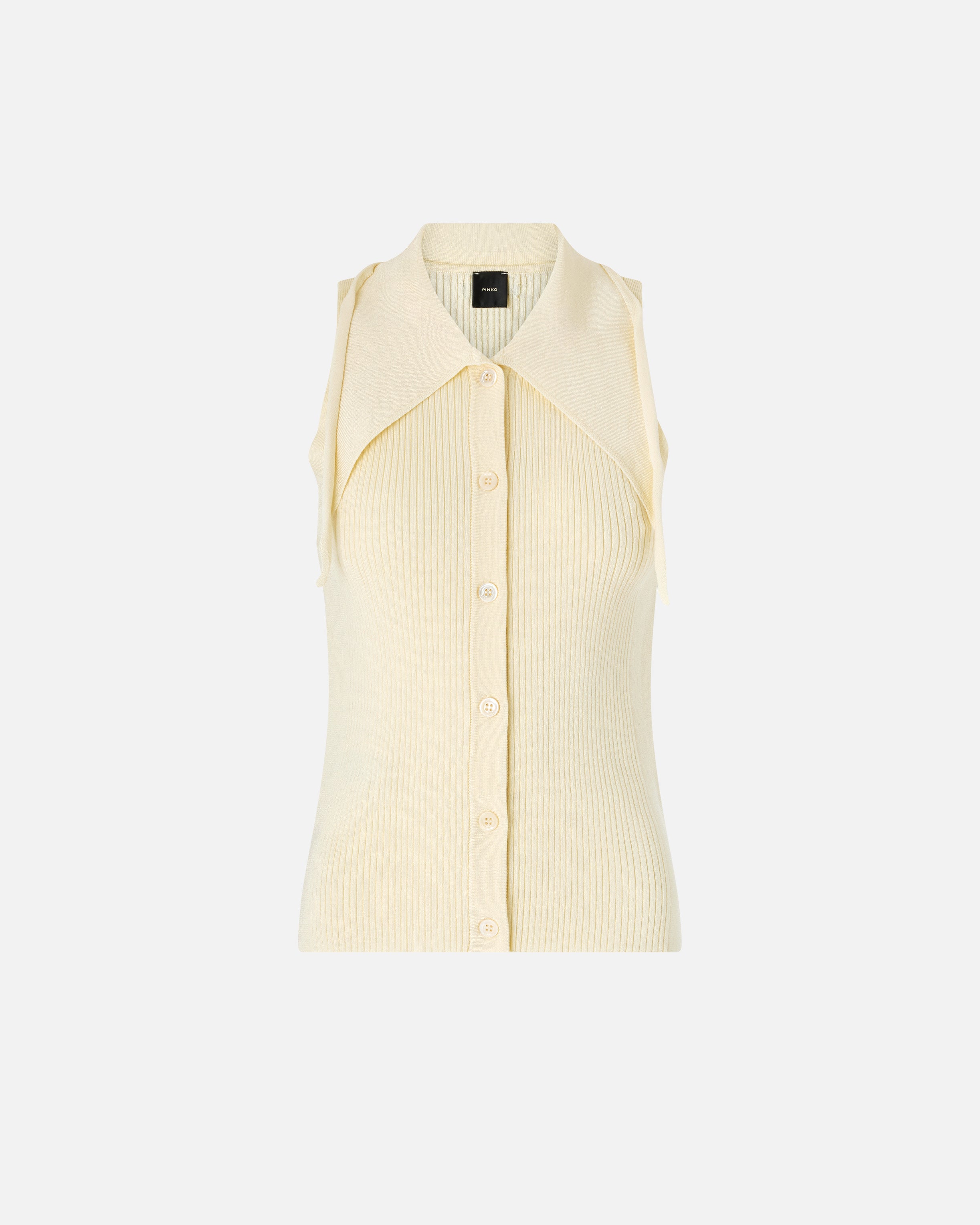 Sleeveless top in lightweight, ribbed stretch rayon, a soft, compact fabric with a shiny appearance that enhances the female figure. This style features a refined stand-up collar that ties at the front in a bandana style and a front fastening with buttons. The final touch is given by the label with jacquard PINKO logo lettering on the back. A versatile piece that is easy to wear with a pair of jeans or layer under a jacket for a casual look.