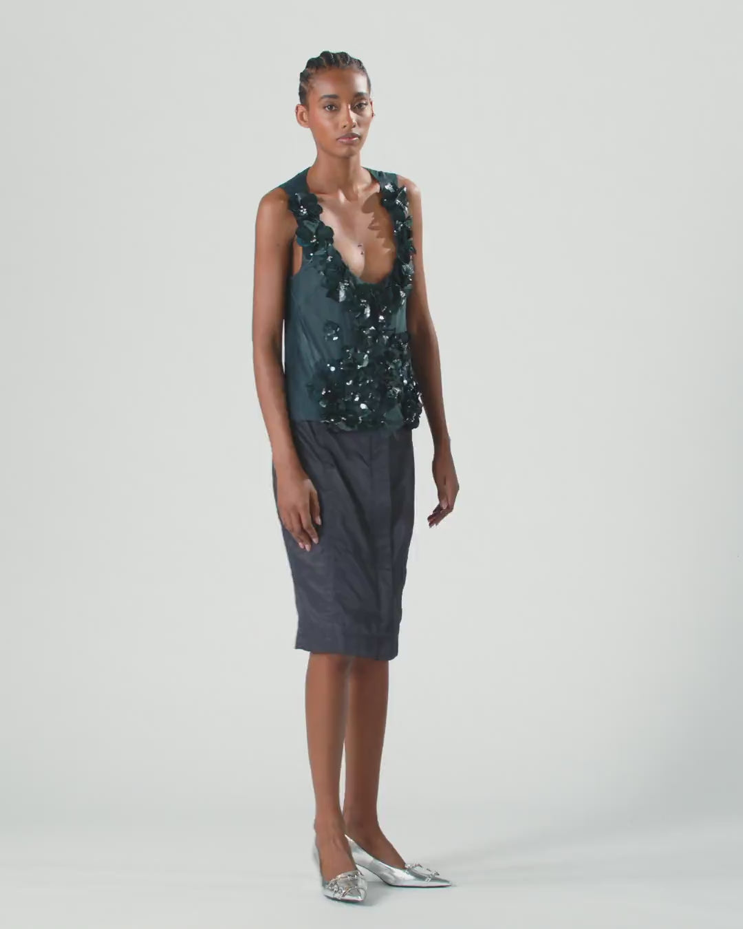 Flowing, sleeveless relaxed-fit top in tulle and organza with wide U-neckline. This item is embellished with small crystals and patent-effect sequins of various sizes, embroidered by hand and arranged to form large jewel flowers around the neck and on the front. Team this item with jeans from your wardrobe: all it takes is one detail to make even the most casual outfits shine.