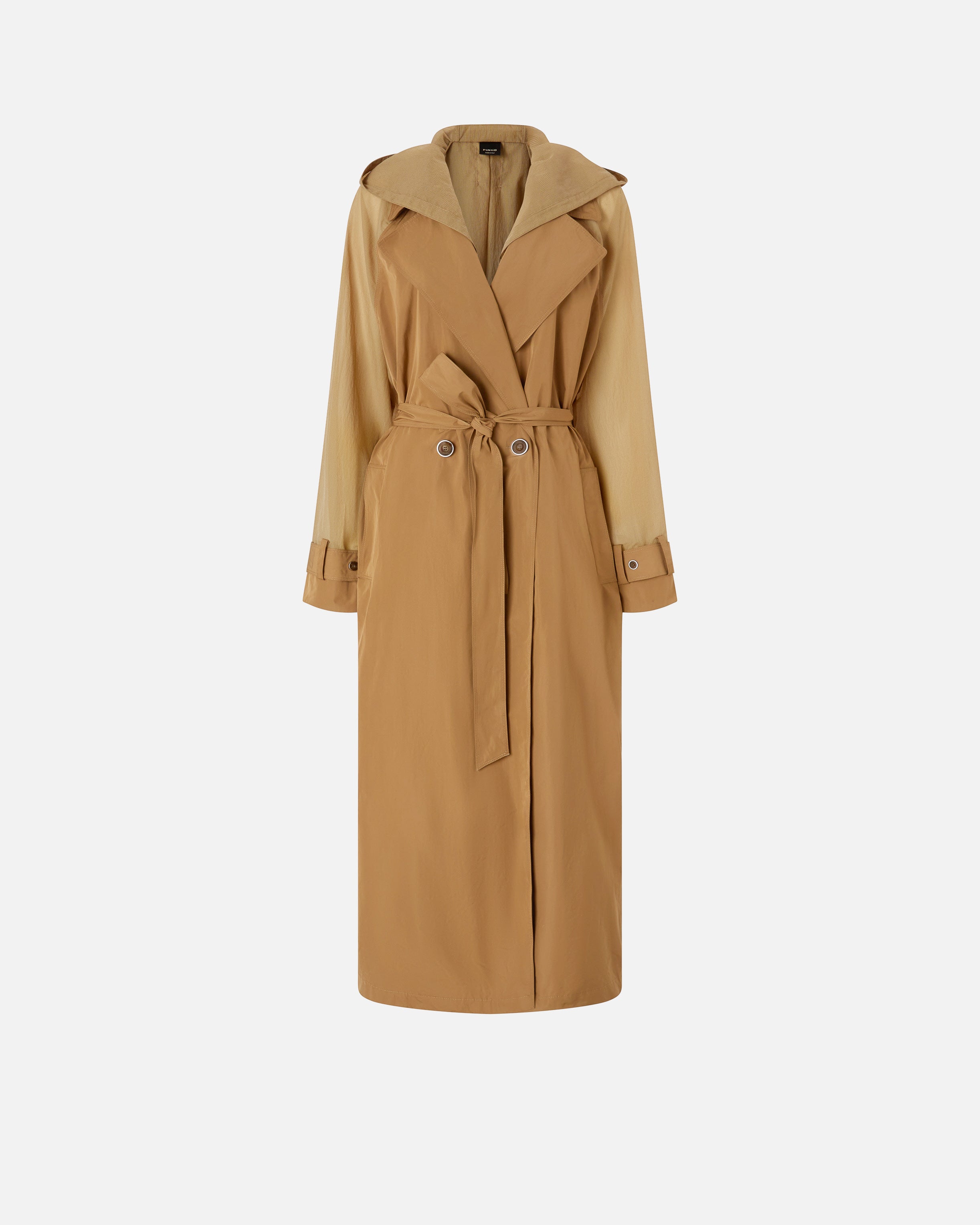 Long trench coat in double-layered technical canvas with sleeves and back in translucent, organza-like ripstop fabric. The refined sheer effects created by the double-layered material are accompanied by functional touches like a hood, wide lapels, welt pockets and a buttoned strap on the cuffs. The double-breasted two-button closure is accompanied by a removable waist belt that accentuates the female figure. - TERRIE TRENCH